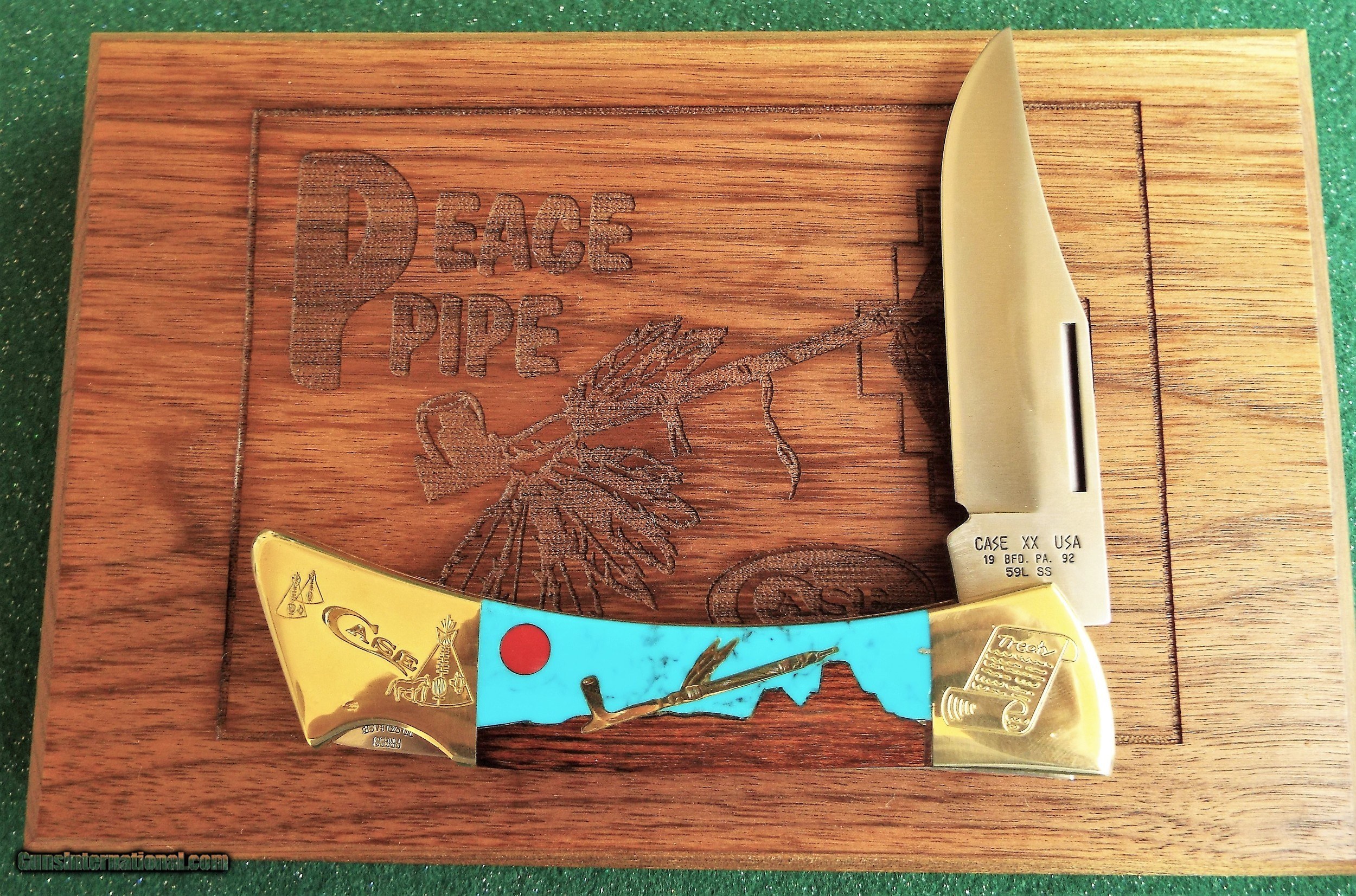 Description: BEAUTIFUL CASE XX USA HAMMERHEAD 59L SS PATTERN KNIFE "PEACE PIPE" AMERICAN INDIAN THEMED INLAYS & ENGRAVINGS on BOTH SIDES by SANTA FE STONE WORKS in WOODEN DISPLAY BOX LIMITED EDITION IN 1992 (serial #201) ~~~ This knife is a 1992 special edition Case American Indian "Peace Pipe" Commemorative featuring the multi material inlay on both sides. This intricate work on this knife was performed by the notable Sante Fe Stoneworks.The front side features the brass "Peace Pipe" inlay along with beautiful Turquoise, Red Coral, and fine wood. The rear side features the multiple fine wood crafted inlay scene of a settler and the American Indian shaking hands along with the brass "Treaty" inlay. All 4 brass bolsters are engraved with articles such as Indian Tepees, a musket and powderhorn, a coonskin cap, CASE Logo and a "Treaty". Please see the Supersize Photos for the awesome detail of this knife!!!The knife used is a Case 59 L SS Hammerhead Lockblade, 5" closed, and date stamped on the front tang of the Clip blade with Case XX USA 19 BFD. PA. 92, and pattern stamped with 59 L SS. The rear side of the blade is serial numbered with #201.This marvelous 1992 issue Santa Fe Stoneworks crafted Case XX American Indian "Peace Pipe" Commemorative is in mint condition with the original issue Case XX "Peace Pipe" presentation box 1992 Case PEACE PIPE produced by Santa Fe Stoneworks In collaboration with Case Knives. Handle is 5", Blade is 3.5" The knife is housed in a walnut display case with an etching on the lid of the box. The knife has been in a dealer display for many years and is PRISTINE. (One tiny ding in brass bolster under the Case logo) Please view all pictures as they are part of the description. It has not been sold used or carried. Shipped with USPS Priority Mail $10 LOWER 48 ONLY NO INTERNATIONAL SHIPPING! SOLD |