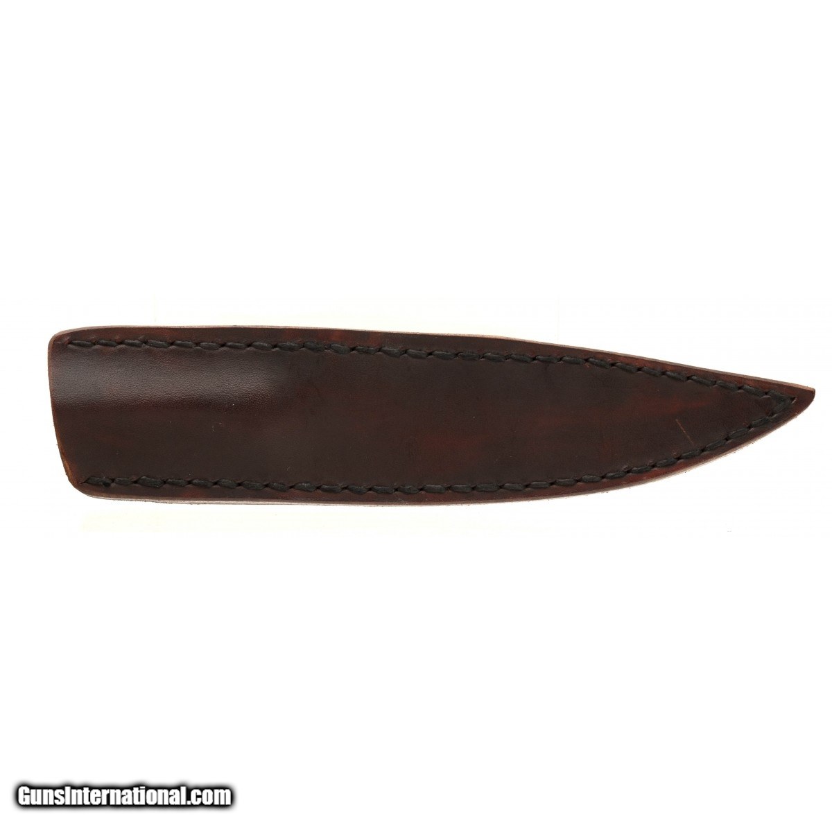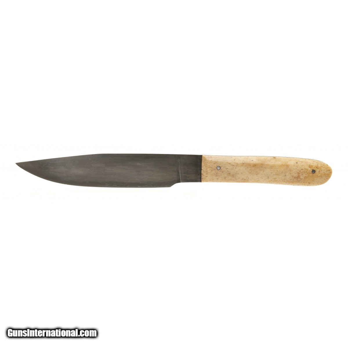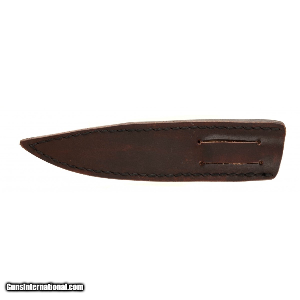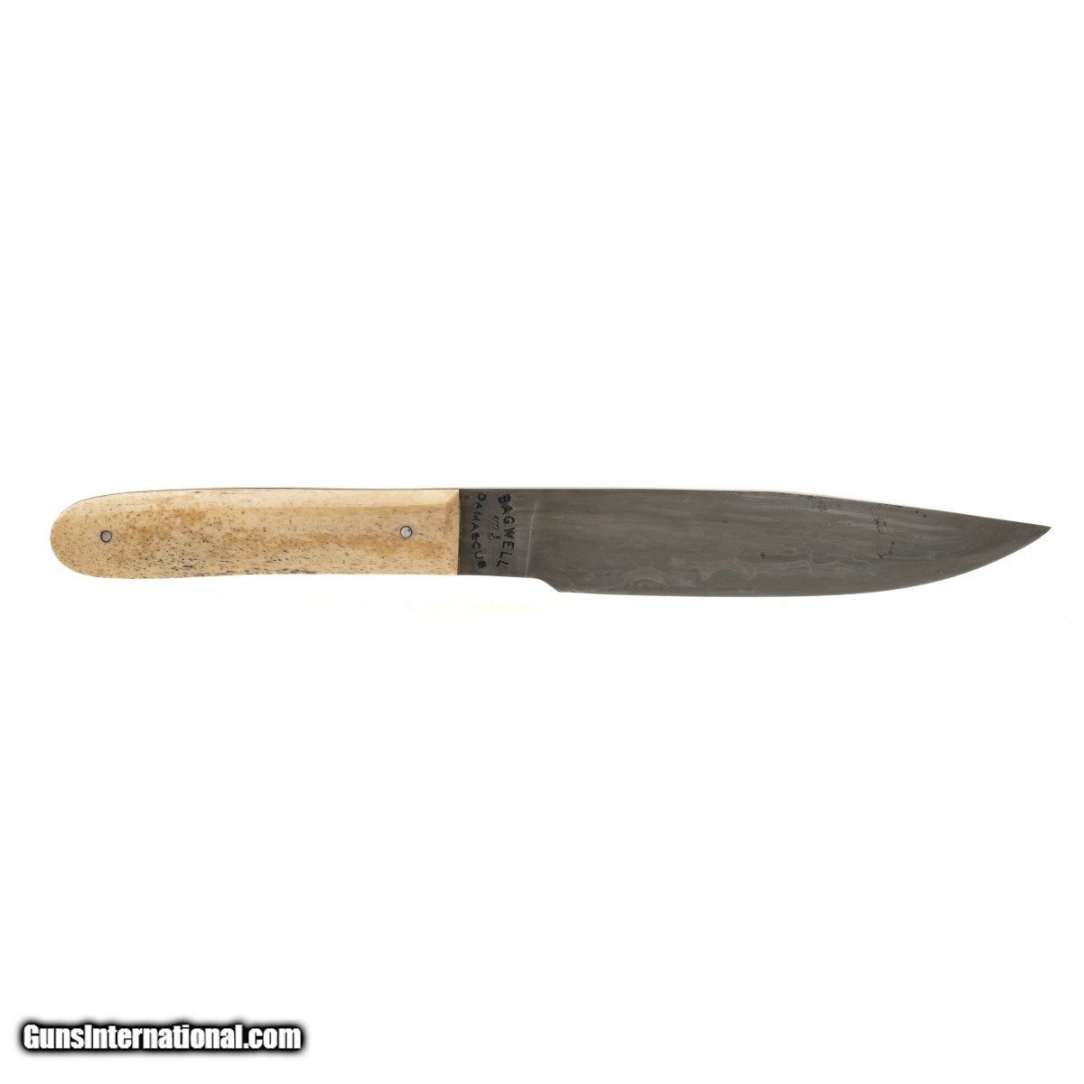 Description: " 6"" Damascus steel blade 10"" OAL with a full tang, no guard and bone scales. Comes with original Bagwell sheath. Condition excellent. SOLD |