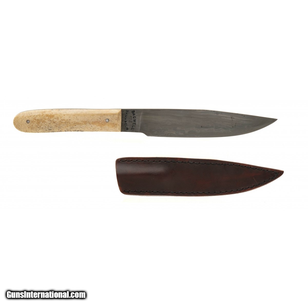 6"" Damascus steel blade 10"" OAL with a full tang, no guard and bone scales. Comes with original Bagwell sheath. Condition excellent.