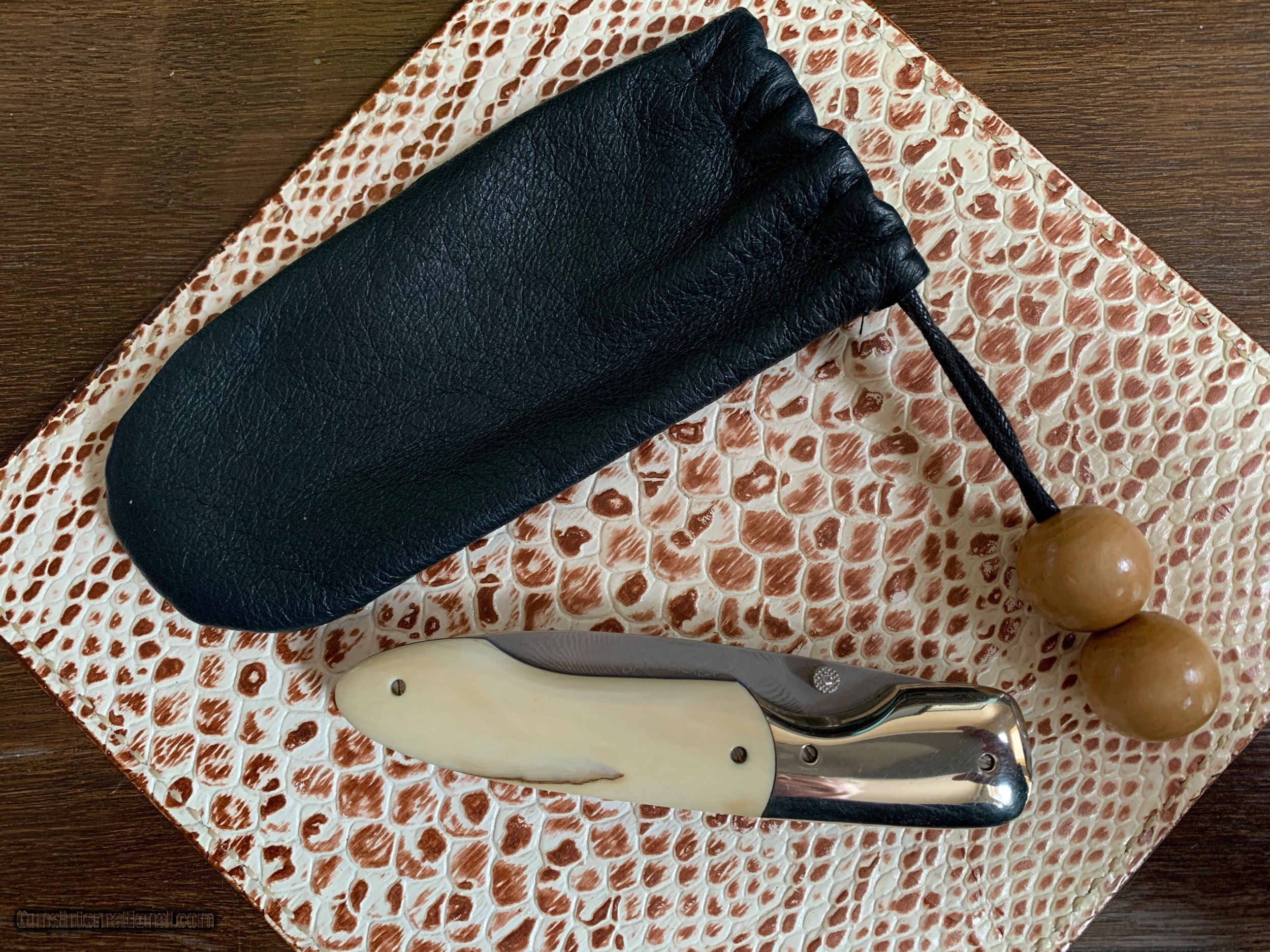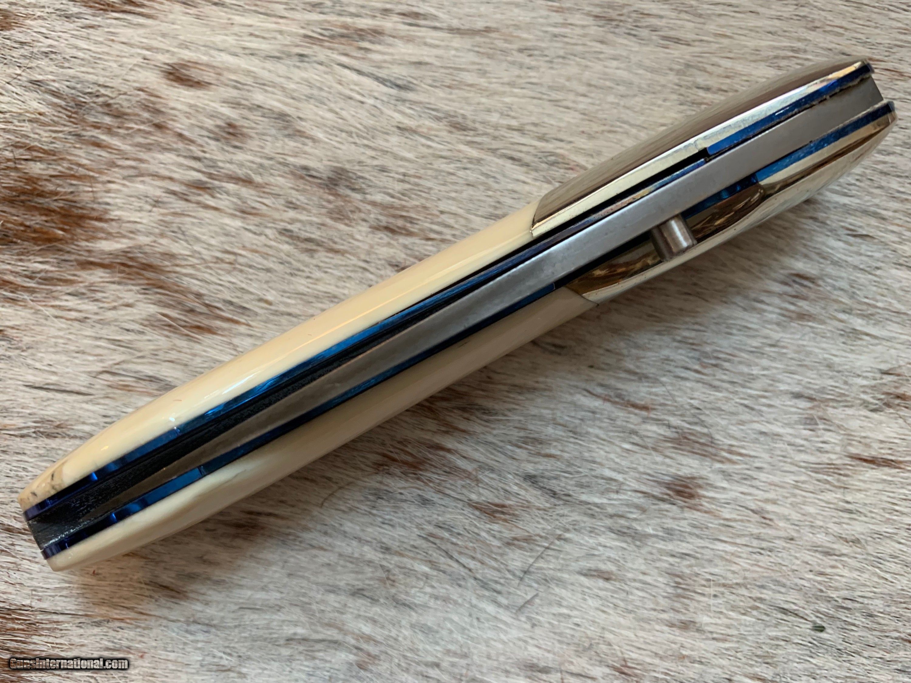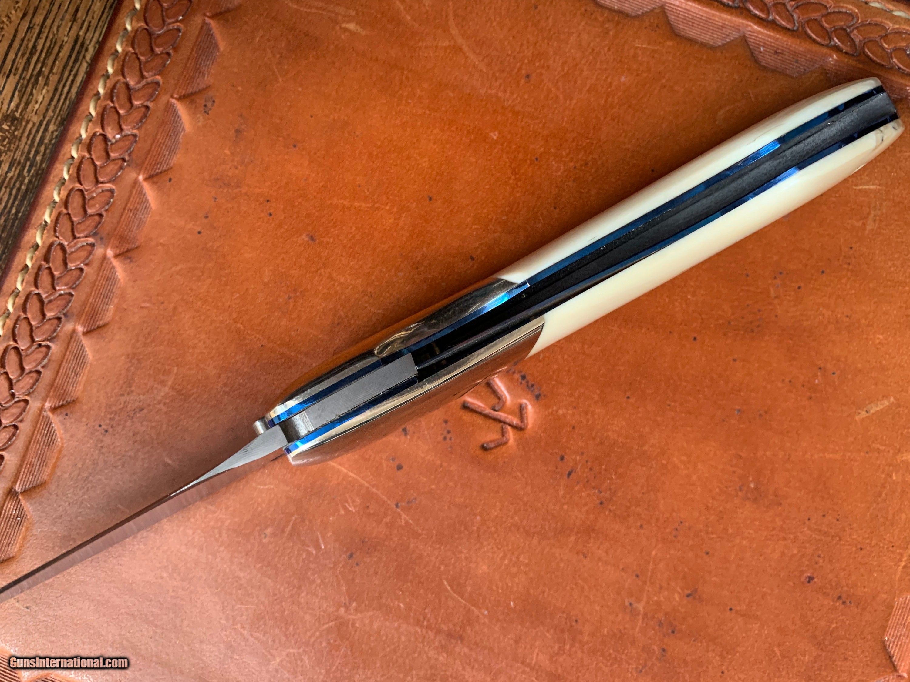 Description: CUSTOM "Gavin Dickerson" of South Africa Lockback "Damascus" Folder with Mammouth Mastodon Ivory Tusk Handles !. This custom Folder is in FLAWLESS Like New and Never Used Condition. Truly a Unique Beauty featuring a Damascus Blade, Mammouth Mastodon Ivory Tusk Handles, and large Polished Nickle Bolsters. **Please know that the unique Mastodon Handles are Custom finished in a Smooth texture with NO Flaws in the Ivory Handle. The darker striated appearance is just within the grain of the prehistoric Mastodon Ivory Tusk handles. Further adding to the Custom Features by this Maker of this Folder is the Brilliant "Blue Steel" Liner/Insert. The Damascus Blade is 3" long, when folded the Folder is 4 1/8", and Overall the Folder is 7 1/4" Long. To finish off and protect this Custom Beauty is the Maker's Dark Blue Soft Leather Pouch. Own this Custom Crafted Beauty in NEW never used condition Now *PRICE Reduced to $230.00 / OBO. Please Add $20.00 for Priority Shipping and Insurance. SOLD |