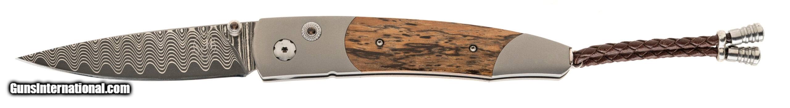 Description: "The Lancet 'Refresh' features a light and resilient frame in aerospace grade titanium, inlaid with bocote wood. The blade is 'Wave' Damascus with an extra strong core in VG-10; the one-hand button lock and the thumb stud are set with smoky quartz gemstones. Sleek, elegant, refined, and comfortable in the hand and to the eye, the Lancet defines the essential gentleman’s folder in the modern world. The 'Refresh' features some of the exotic materials and hand-forged metals that are the hallmark of William Henry's collections; a distinctive personality statement to be worn and used for a lifetime. Price: $900.00 Contact Seller |