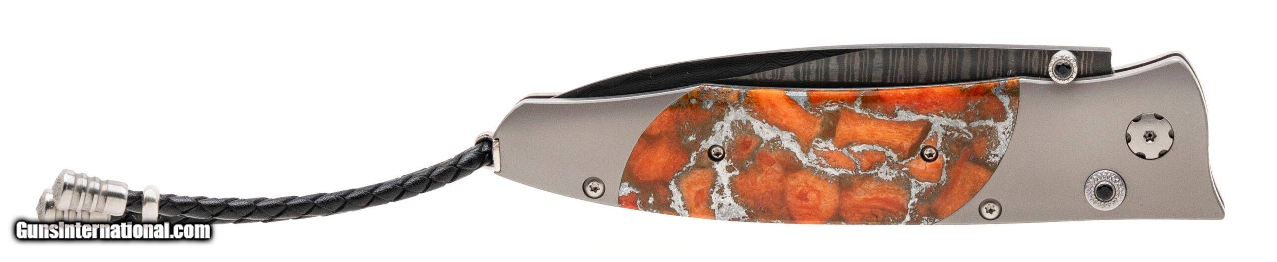 Description: "The Gentac ‘Dark Waves' features a light and resilient frame in aerospace grade titanium, inlaid with ' Zinc Matrix' apple coral. The blade is black-coated 'Wave' damascus with a core of VG-10 steel; the one-hand button lock and the thumb stud are set with spinel gemstones. An exceptional design that offers rigorous performance in a sleek, comfortable knife, the Gentac is also the perfect canvas to showcase William Henry’s range of exotic materials and techniques. The 'Dark Waves’ features some of the hi-tech materials and hand-forged metals that are the hallmark of William Henry's collections; a modern design for a timeless heirloom to be proudly worn and used for a lifetime before being handed-down to another generation. Price: $1,350.00 Contact Seller |