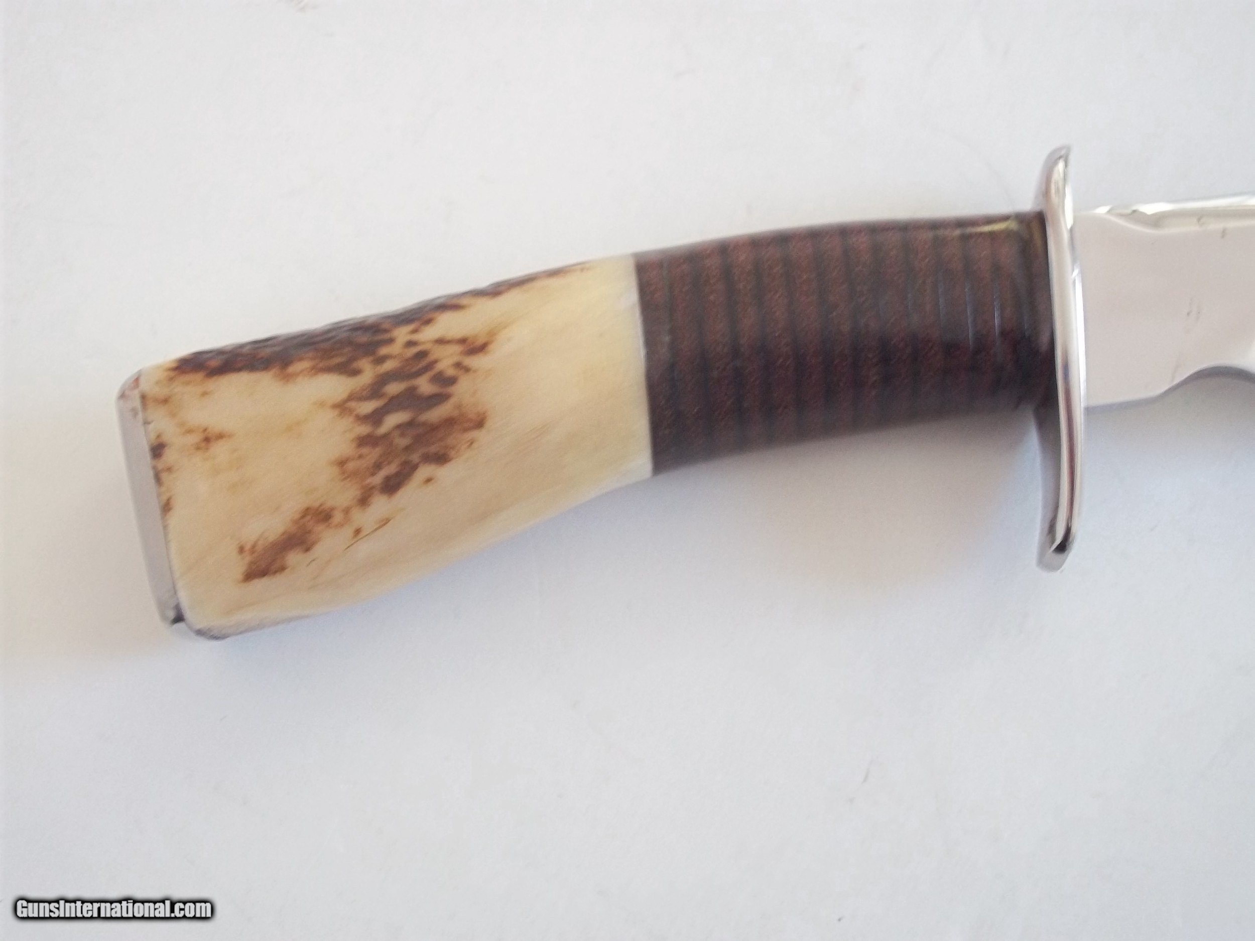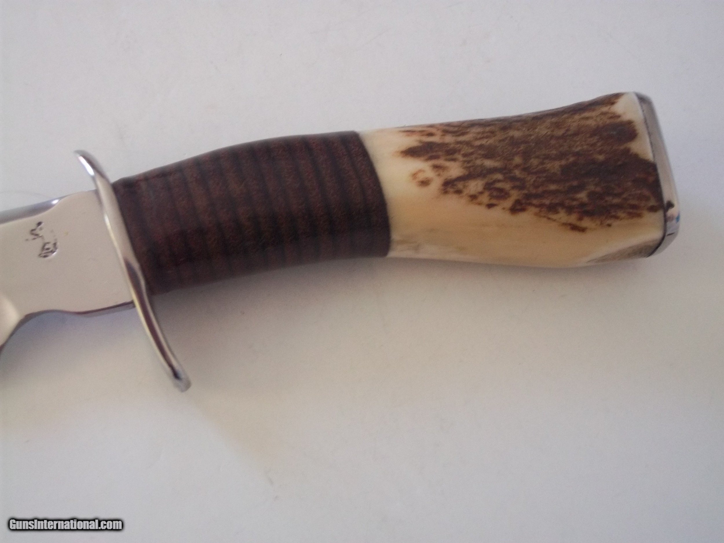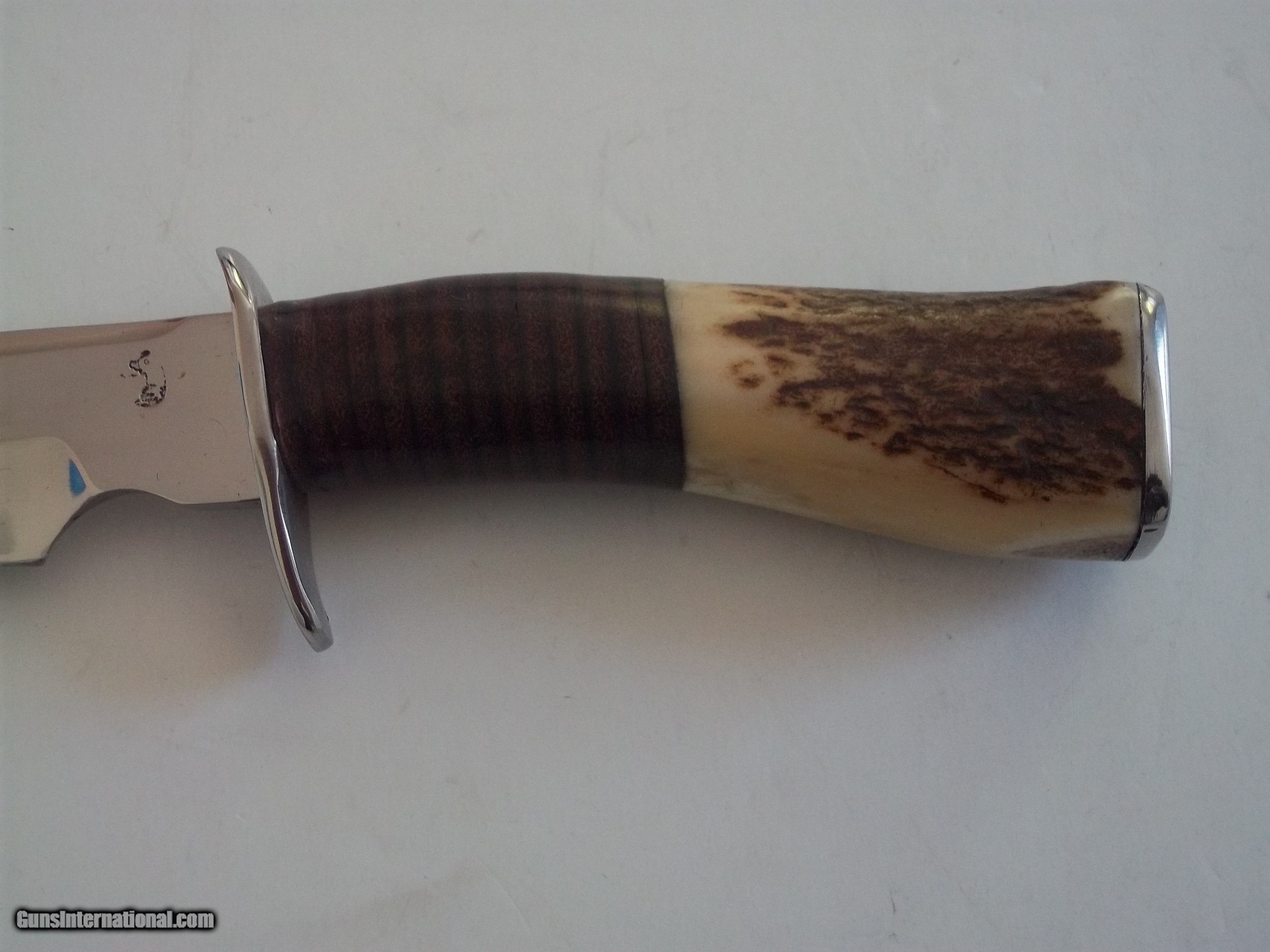 Made of 100C6 steel, 150mm long, 30mm wide and 5.5mm thick. Its guard and pommel are made of Z20C13 steel and the handle is made of leather and deer antler from the d’Écouves forest.,thickness about 1/4" with full distal taper, handle is a combination of leather washers and stag reminiscent of the Scagel type handle, which flares on both sides, allowing a very comfortable and secure grip, that is 125mm long or a bit longer than 4-7/8" long. The "S" curved guard is made from 100C6 steel.. Le Senecal maker. Knife bears the rare double stampings on blade (wolf-no longer available and duck).