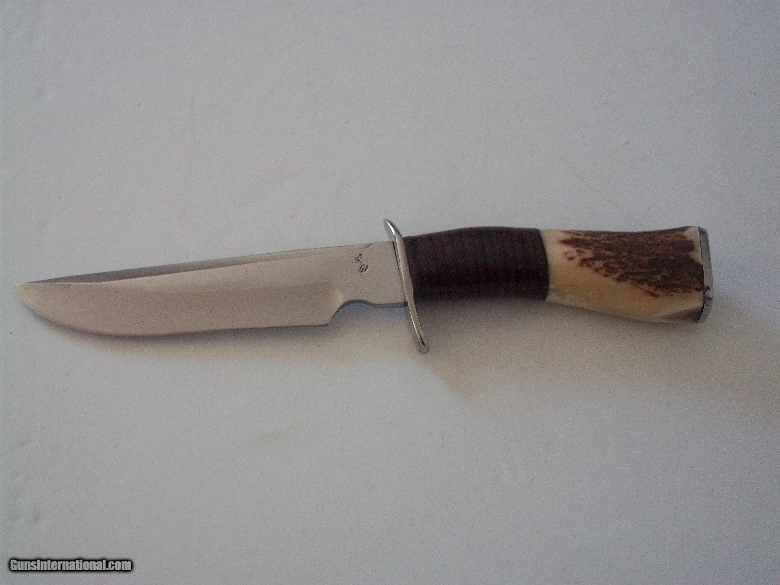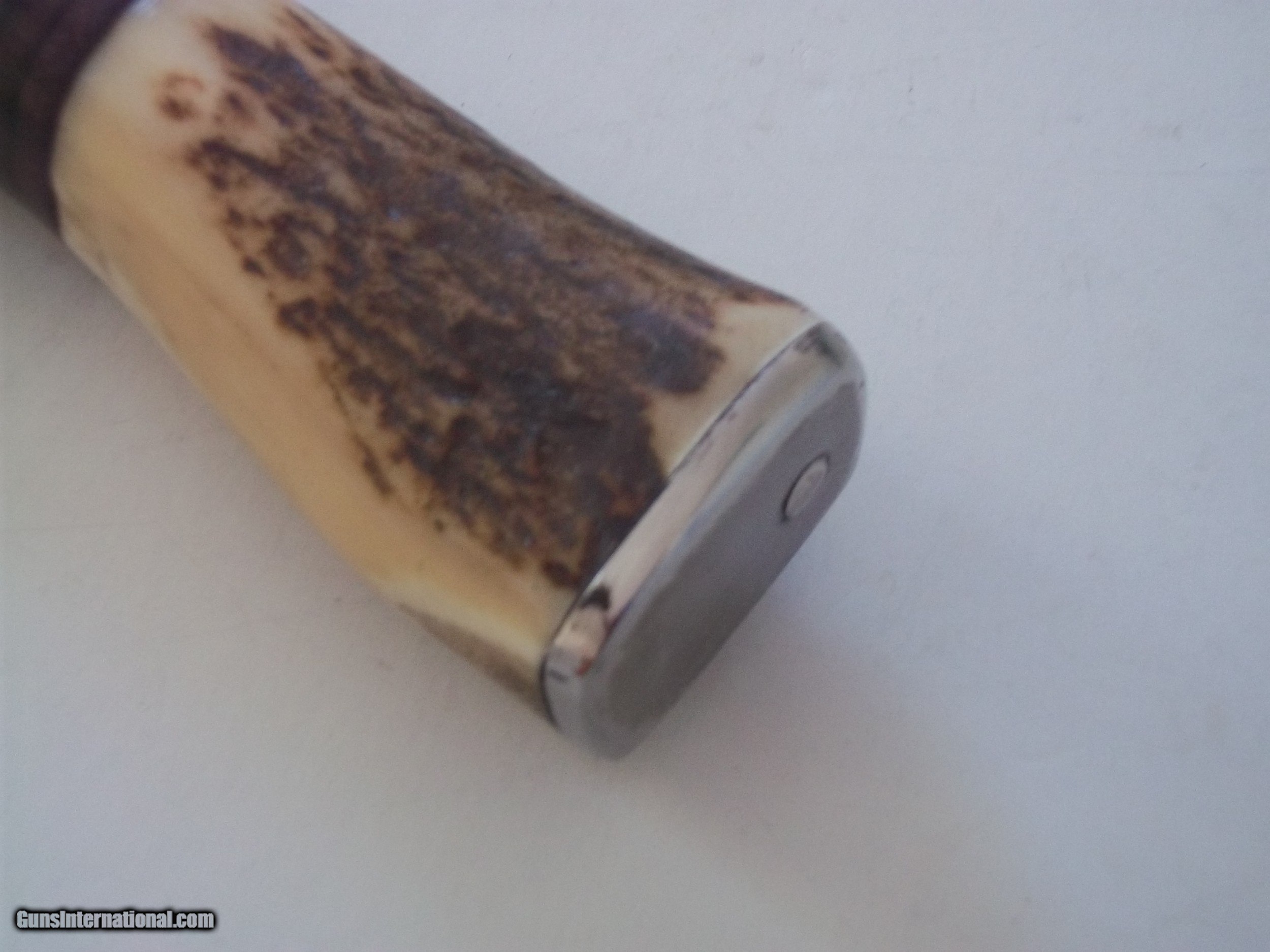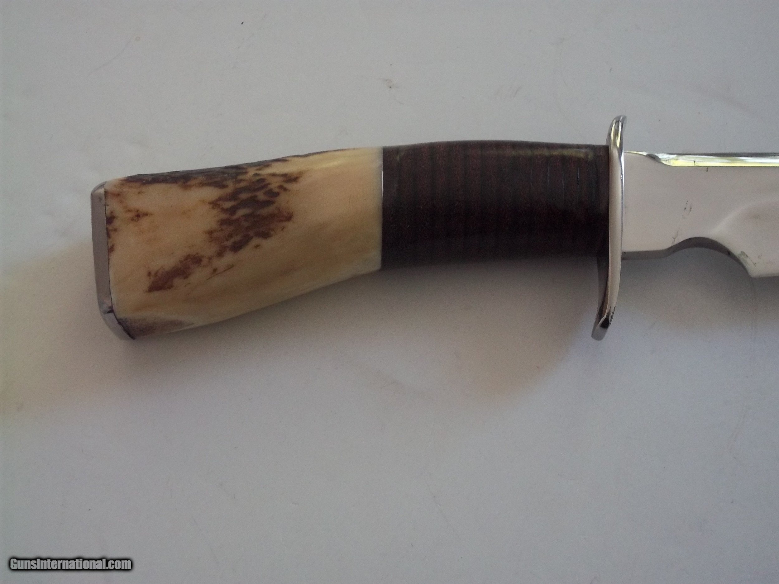 Made of 100C6 steel, 150mm long, 30mm wide and 5.5mm thick. Its guard and pommel are made of Z20C13 steel and the handle is made of leather and deer antler from the d’Écouves forest.,thickness about 1/4" with full distal taper, handle is a combination of leather washers and stag reminiscent of the Scagel type handle, which flares on both sides, allowing a very comfortable and secure grip, that is 125mm long or a bit longer than 4-7/8" long. The "S" curved guard is made from 100C6 steel.. Le Senecal maker. Knife bears the rare double stampings on blade (wolf-no longer available and duck).
