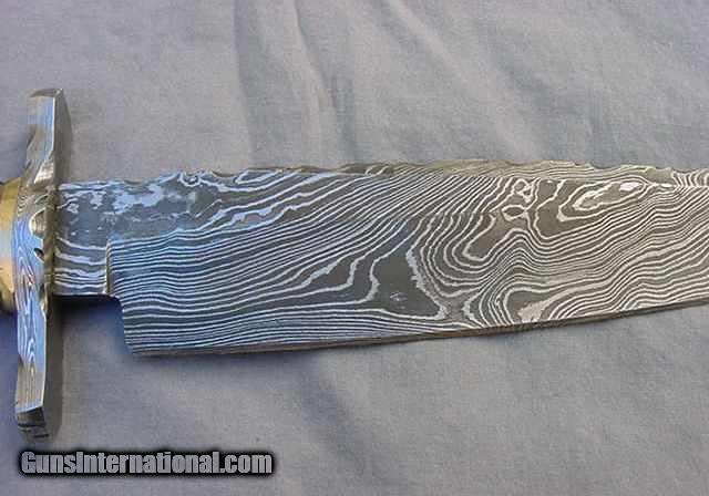 Description: Antonio Banderas Custom Made Damascus Steel large bowie knife & leather sheath new condition. This is a brand new custom made knife designed and made by Antonio Banderas (the knife maker, not the actor). The Damascus steel blade is folded five times starting with 9 layers of 1095 and 15N20, giving approximately 288 layers of remarkable pattern to the blade. The blade is properly heat treated to give excellent edge sharpness retention. This is not one of the many Damascus blade knives you will see on e-Bay for $30 - $70 that were made in India, China or Pakastan. This is a top quality knife made by a recognized maker. The knife is 13-3/4 inches long overall; the Damascus blade is 8 inches long; the 3-1/2 inch long handguard and pommel are also made of Damascus steel. The handle is made of stag antler and exotic wood. Condition is new, never used. SOLD |