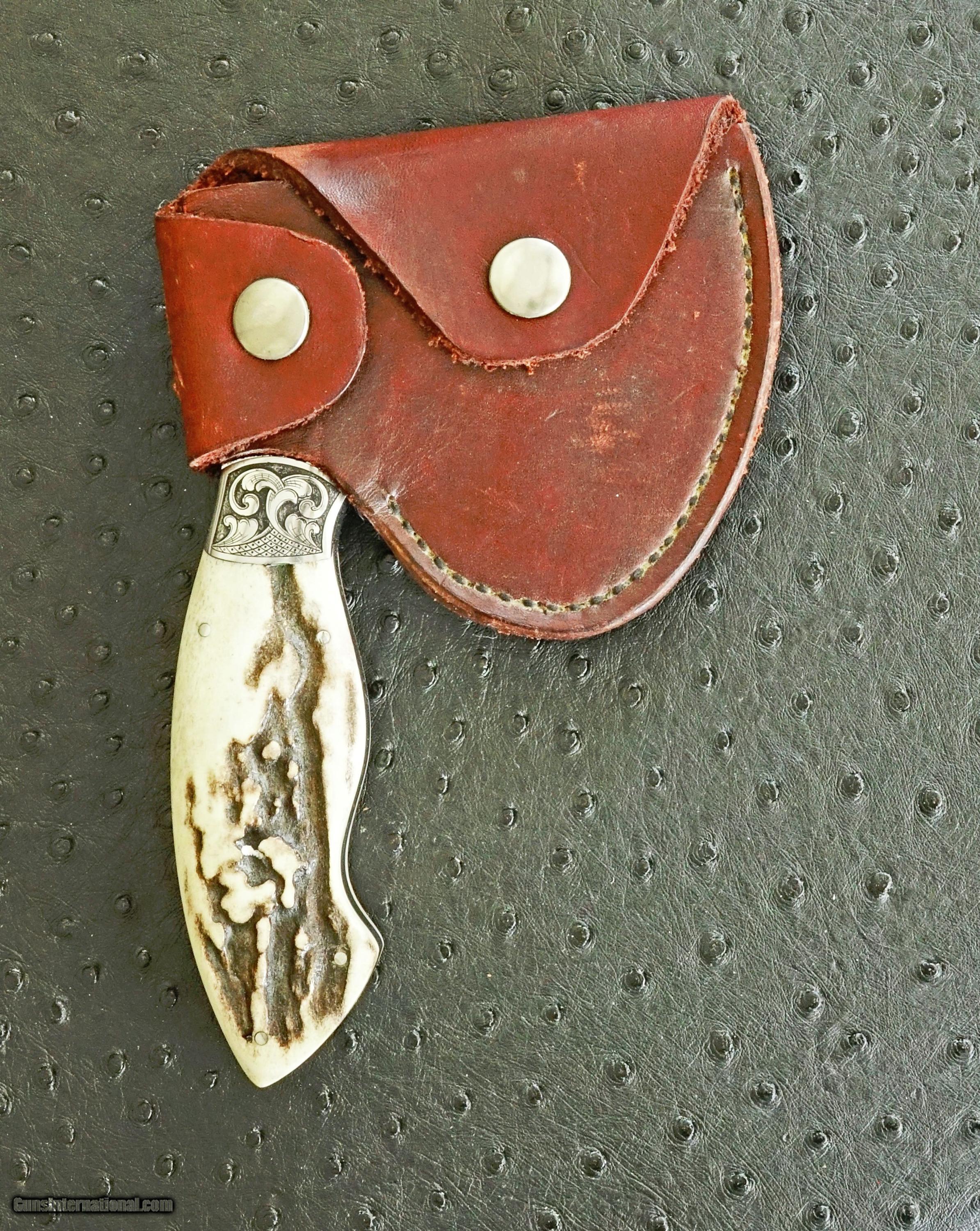 Description: B. GALLAGHER HAND AXE WITH STAGE HANDLES AND ENGRAVED BOLSTERS - WITH SHEATH - A HIGH QUALITY UTILITY HAND AXE SOLD |