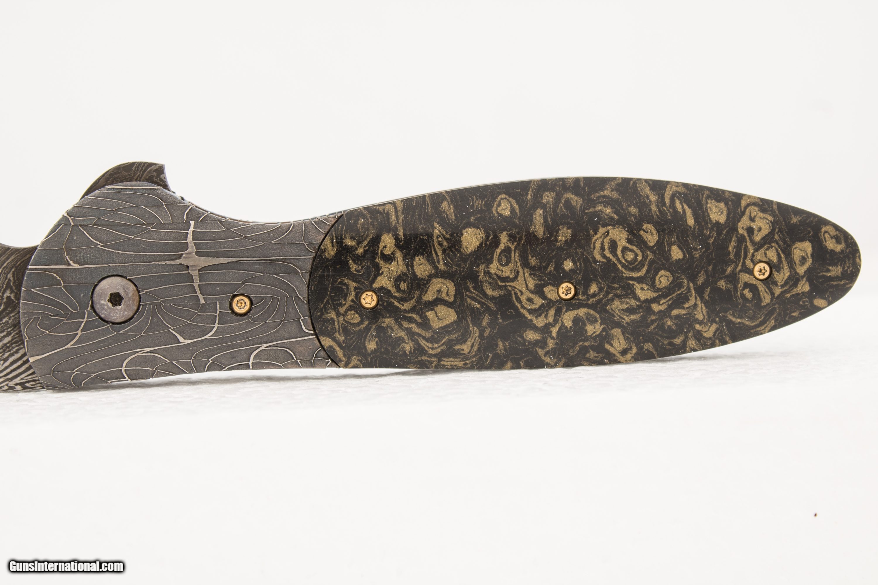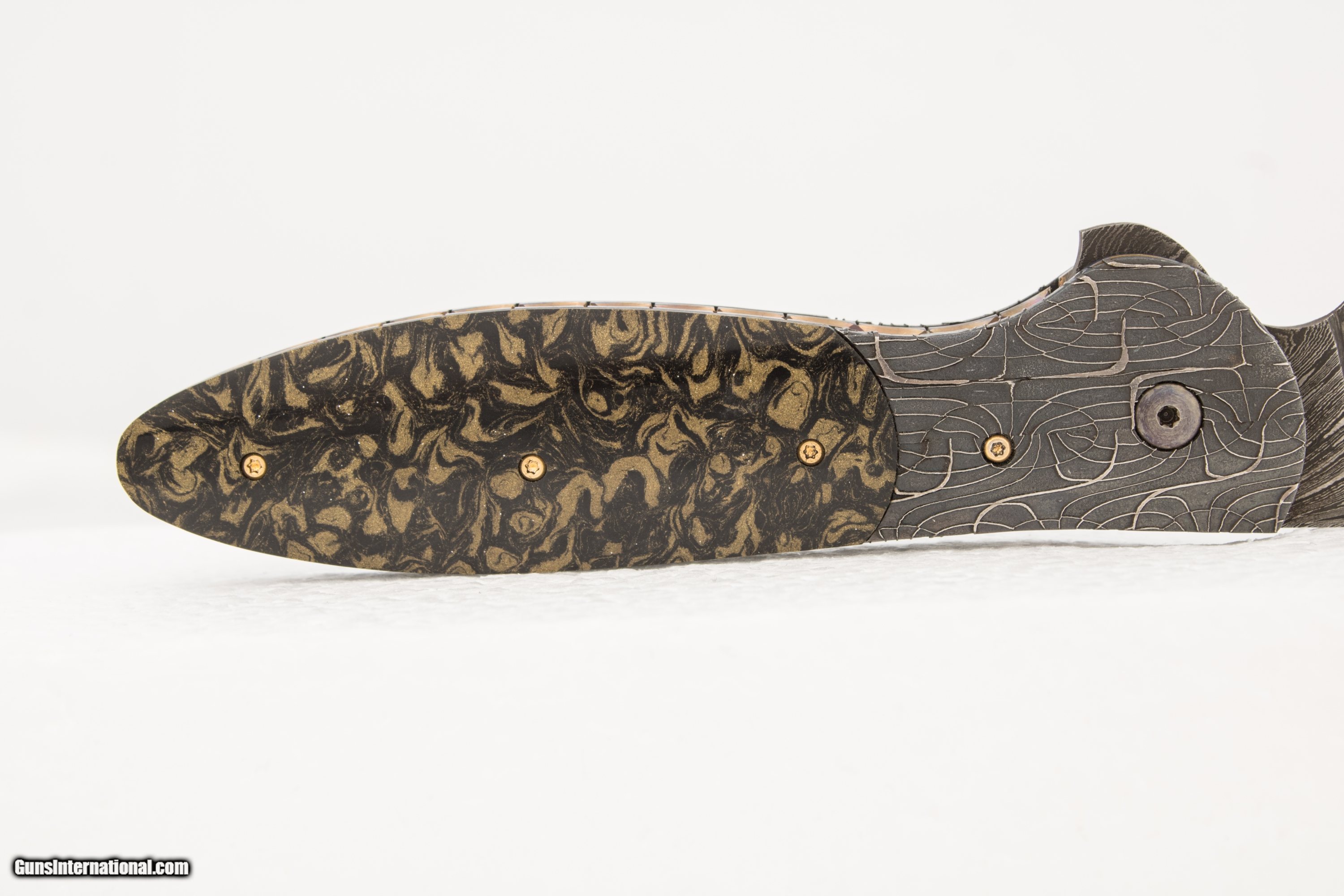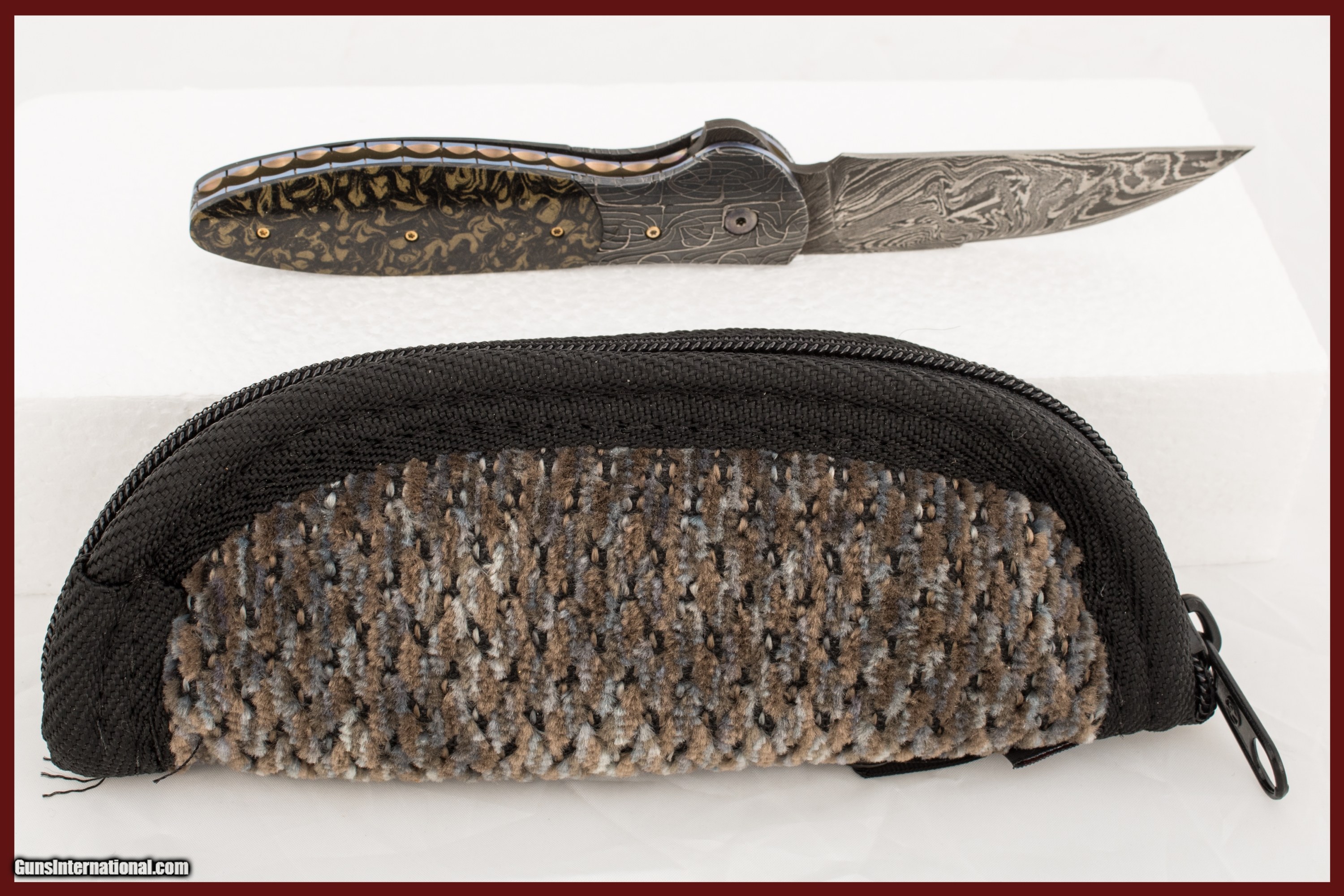Description: Bill Keller custom folding knife featuring a 3 1/8 inch blade made of twist Damascus multi-bar Damascus bolsters M3 black & gold scales and 7 7/8 inch overall length. This knife comes with a protective soft case and is in excellent condition.