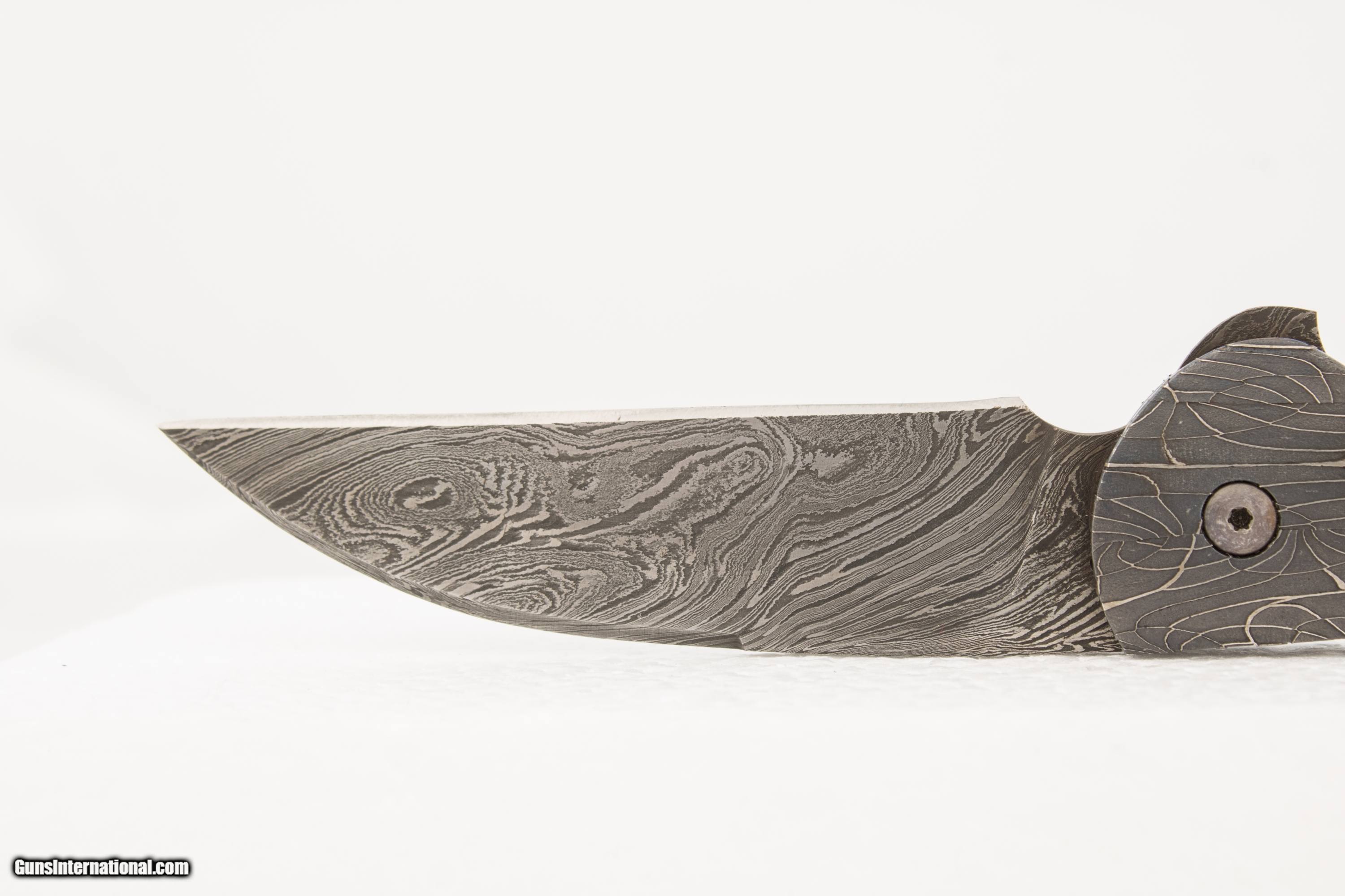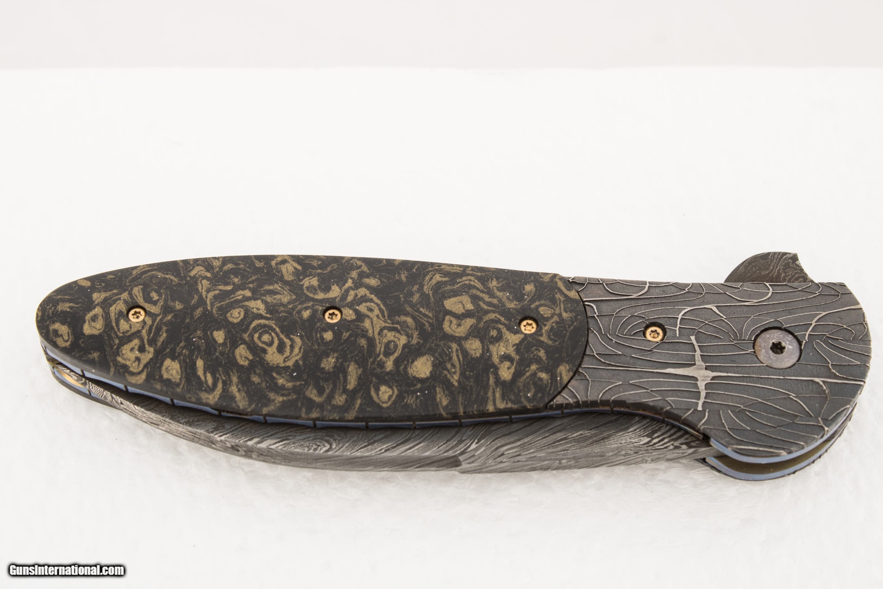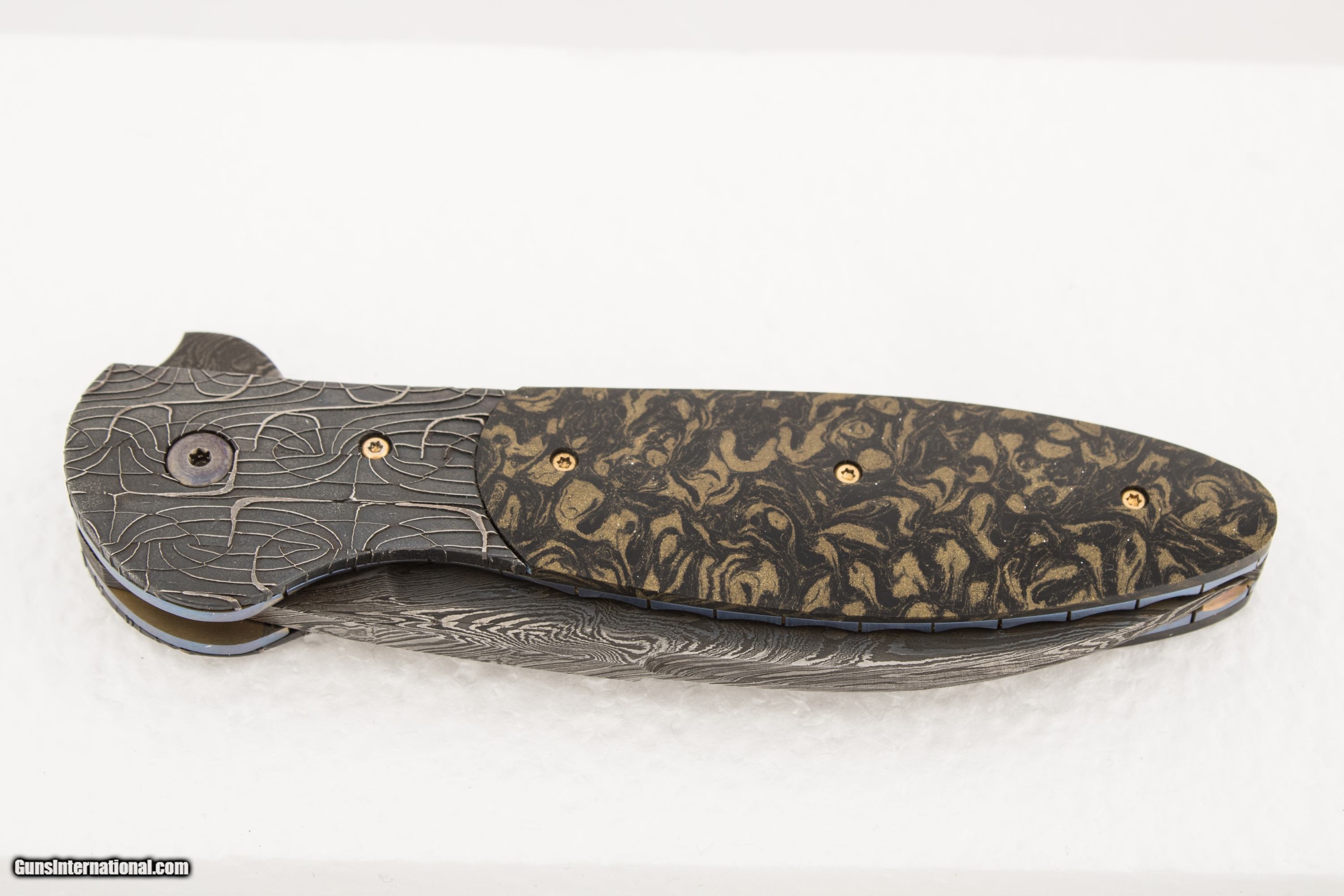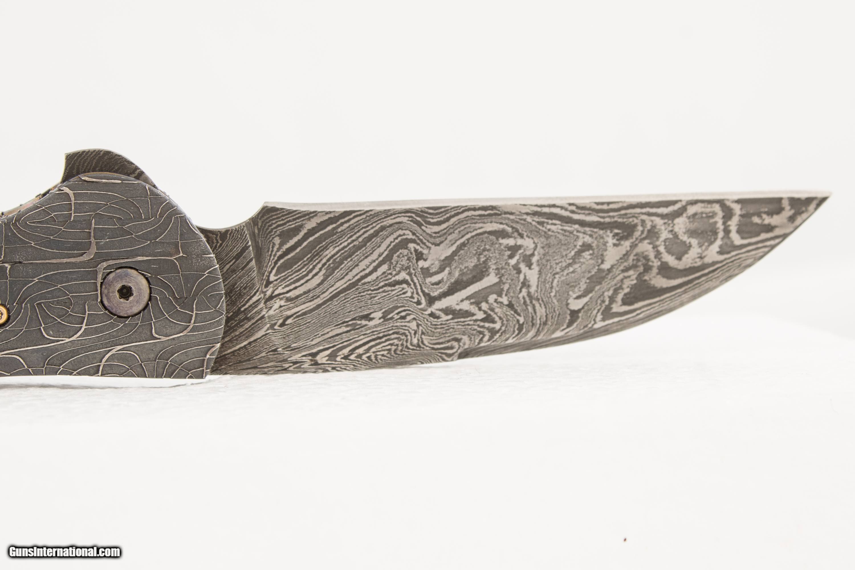 Description: Bill Keller custom folding knife featuring a 3 1/8 inch blade made of twist Damascus multi-bar Damascus bolsters M3 black & gold scales and 7 7/8 inch overall length. This knife comes with a protective soft case and is in excellent condition.