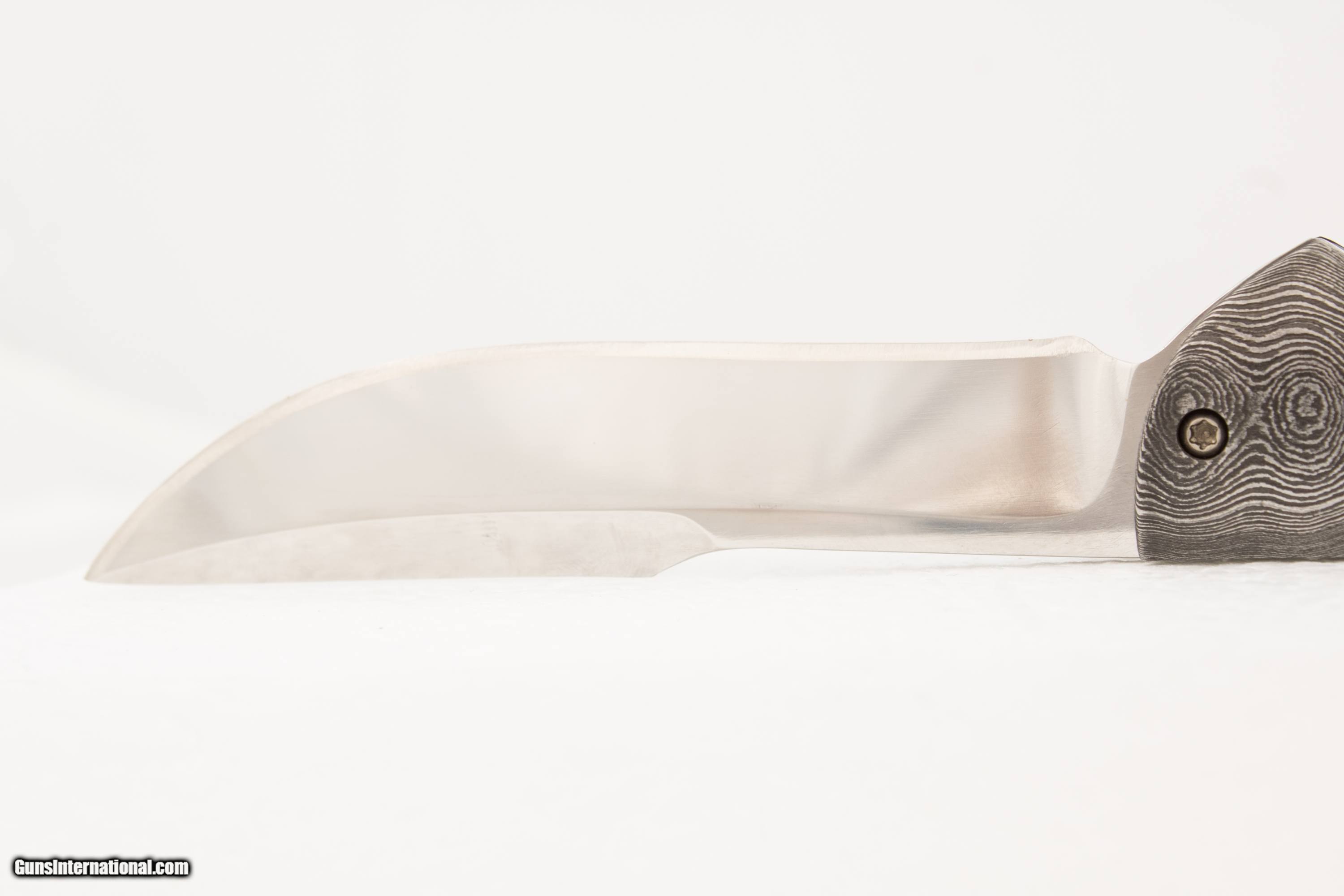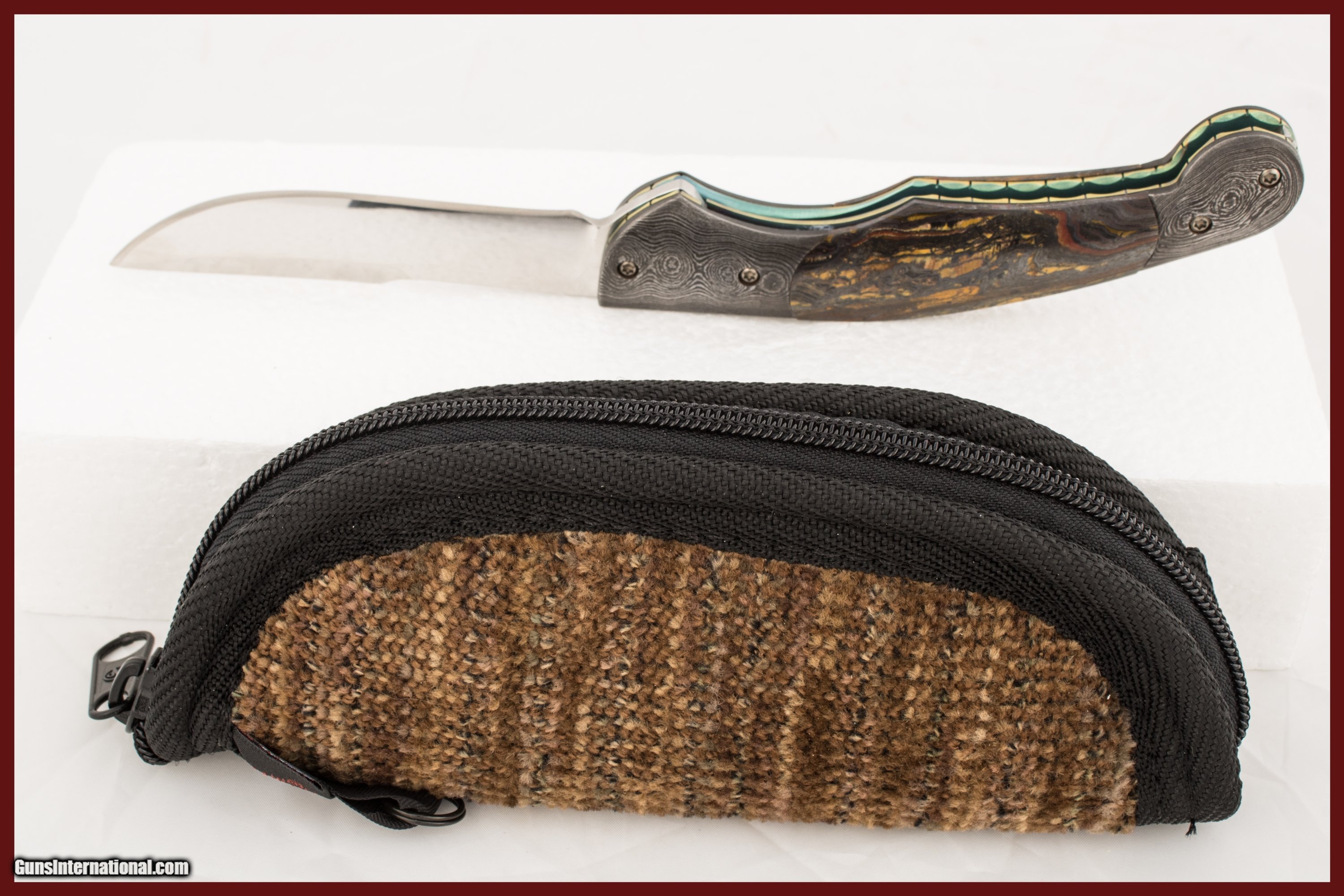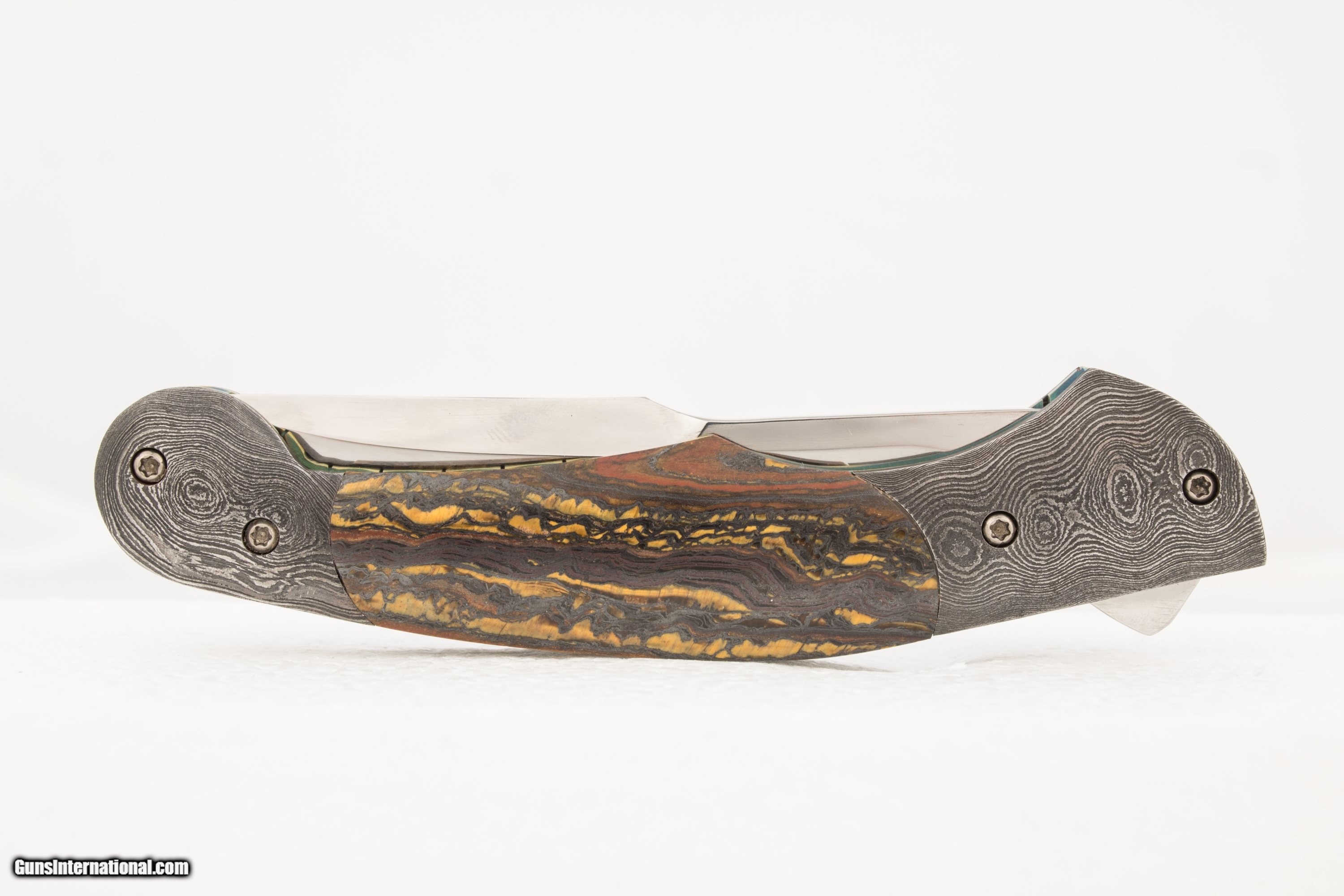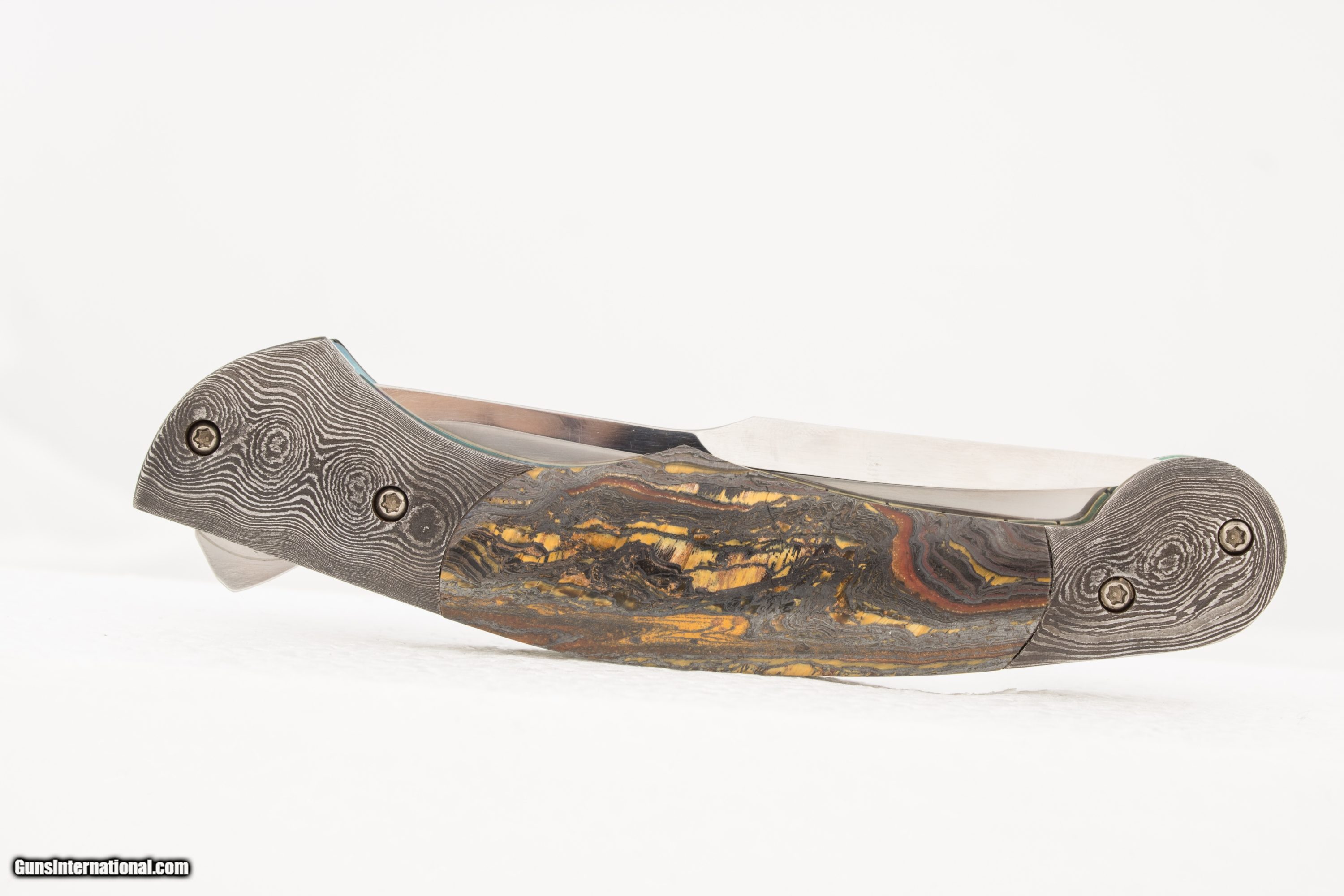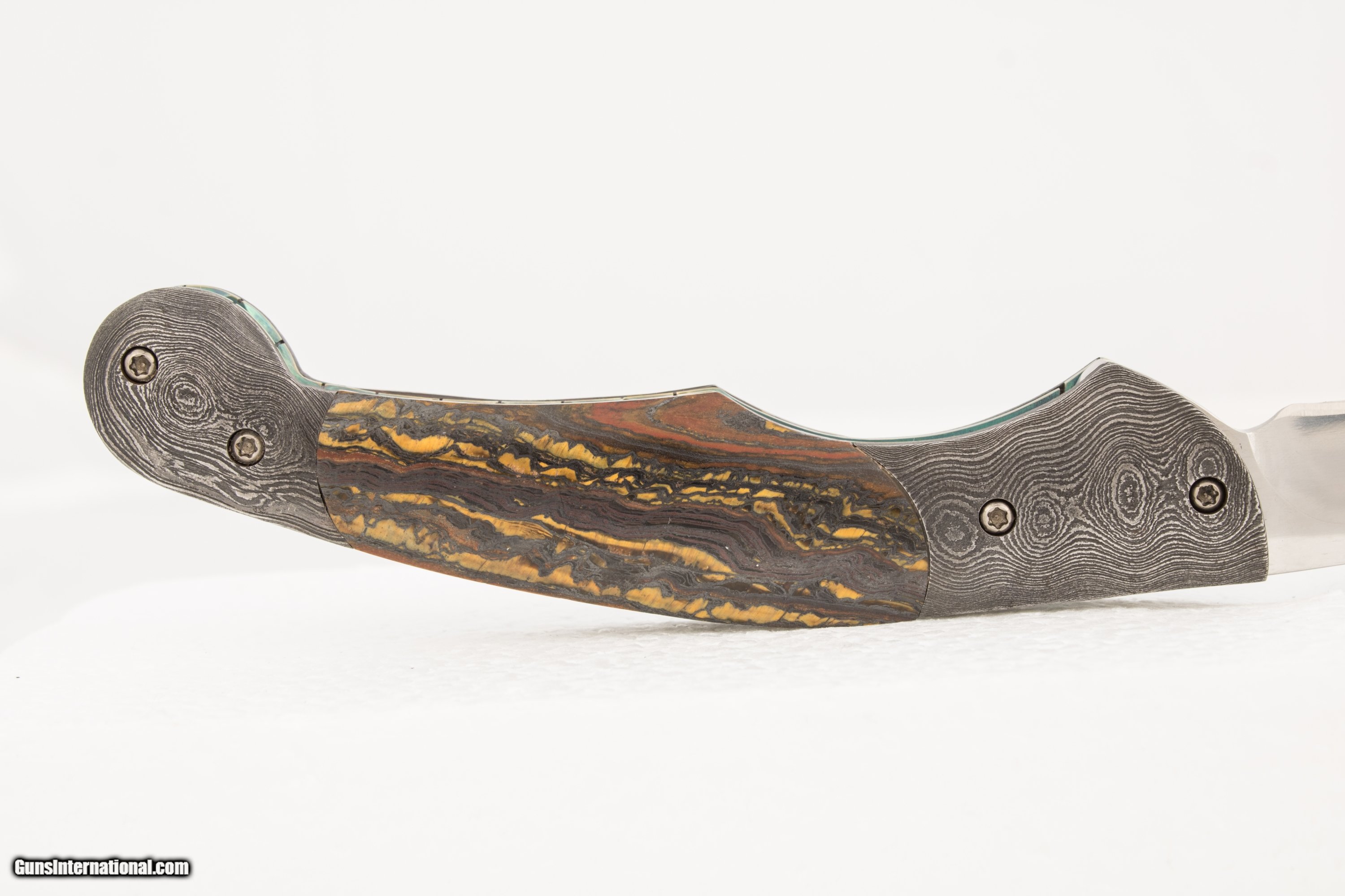 Description: Bill Keller custom folding knife featuring a 3 3/4 inch blade made of CPM 154 ladder Damascus bolsters tiger iron stone scales and 9 1/8 inch overall length. This knife comes with a protective soft case and is in excellent condition.