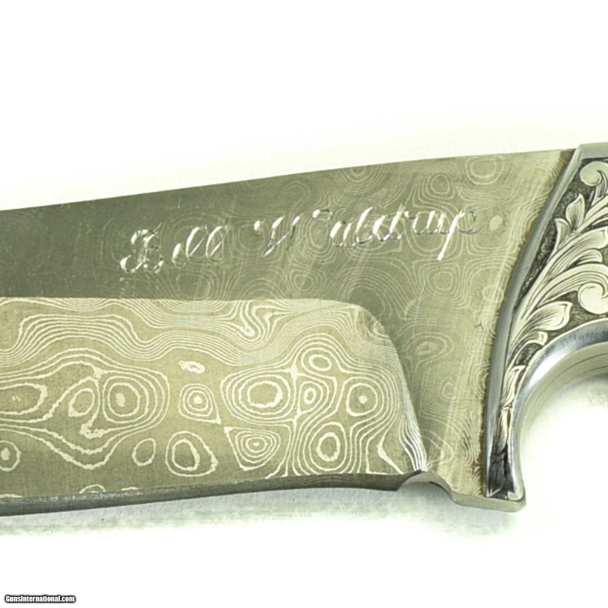 Description: Bill waldrup knife resin and scrimshawed handle, painted with scenes of wolves. Damascus steel blade. PERIOD: Contemporary ORIGIN: Bill Waldrup SIZE: 10 1/4", 5" blade SOLD |