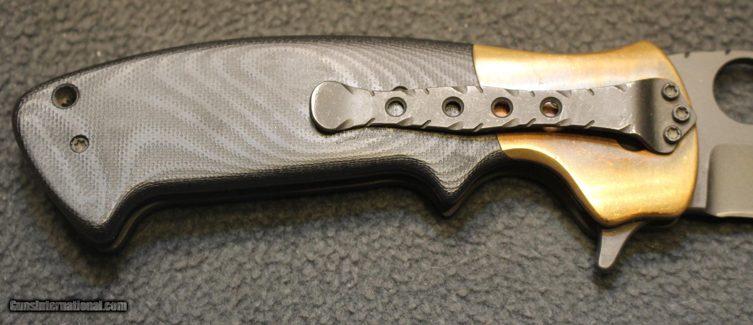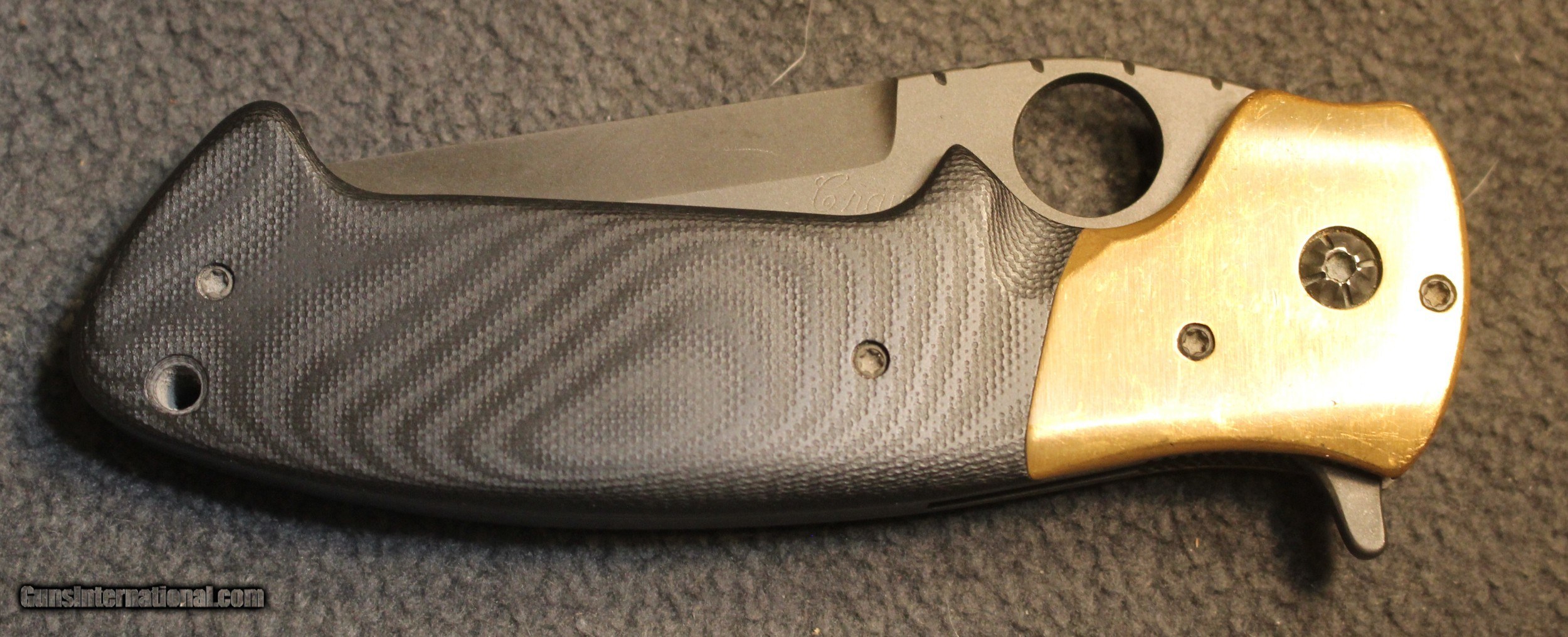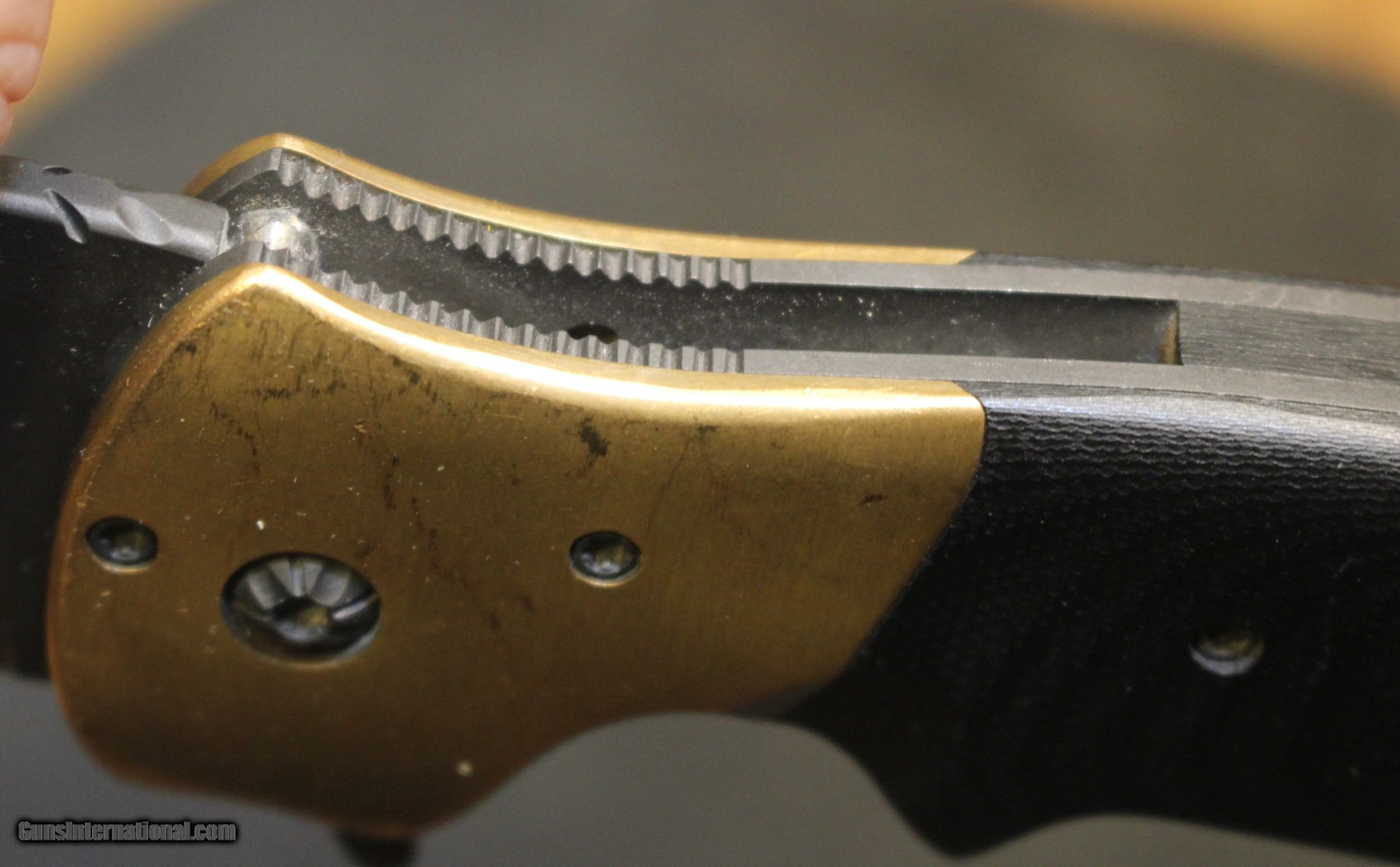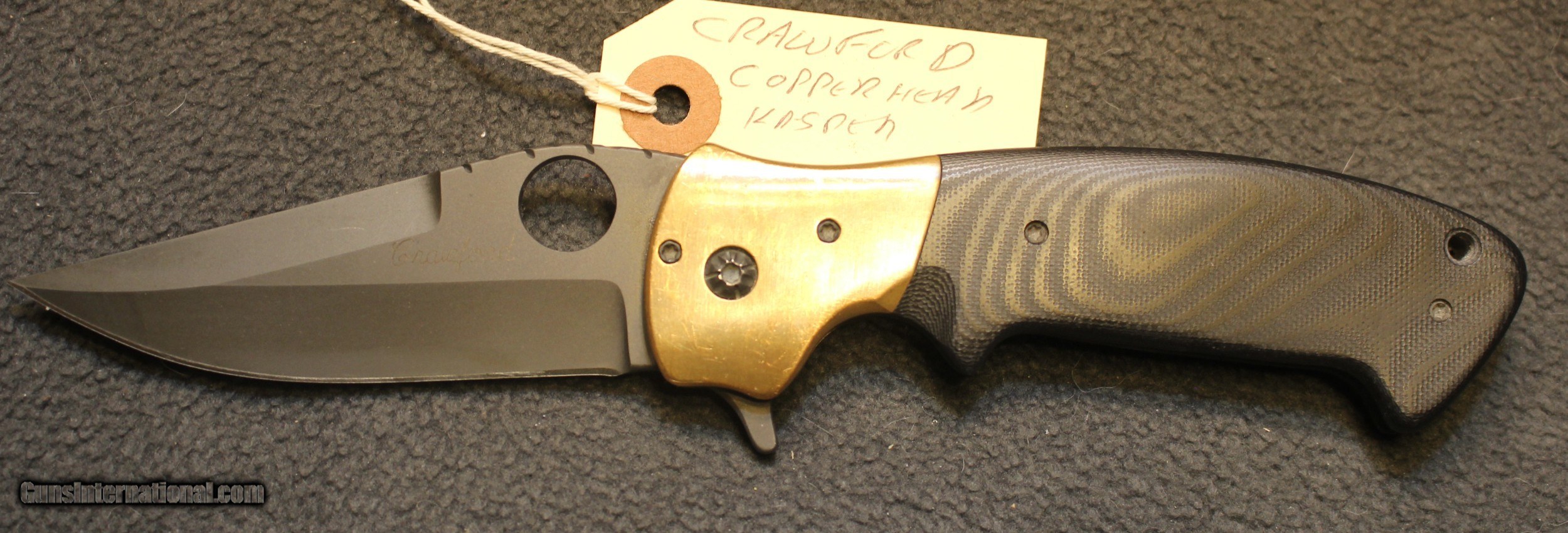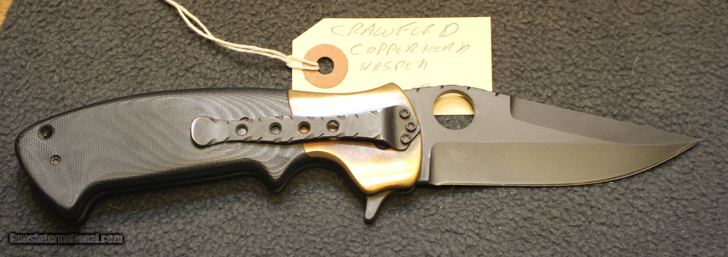 Description: Custom Crawford Copperhead Kasper Flipper Knife Copper/G-10 (3.875" Black) The knife has clearly been used and carried. There is plenty of "pocket fuzz" visible as well and handling marks on the copper bolster and some shine on the pocket clip. Blade is sharp and clean. Has it cut through "red woods" in the jungle of the amazon, heck no. I am certain it has cut its fair share of boxes and tape on boxes but that is about all. There is only the knife, nothing else Copied from an ad on the Blade HQ listing describing the knife ............................... The Crawford Copperhead Kasper Flipper is hand-made and of the highest quality. This Kasper is a large knife with titanium liners, black G-10 scales and copper bolsters. The blade is made from premium stainless steel with a black finish, filework on the spine, and opens by flipper or thumb hole. Comes fitted with a black finished titanium pocket clip with decorative filework. The Crawford Kasper folding knife feels great in hand and performs flawlessly. SPECIFICATIONS