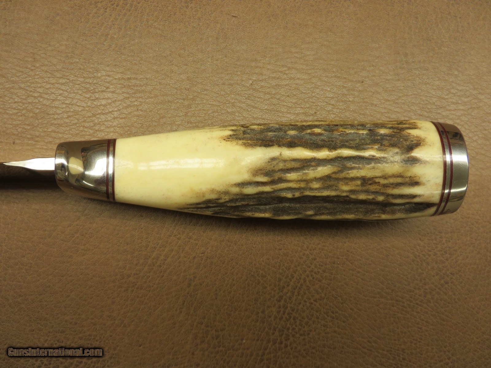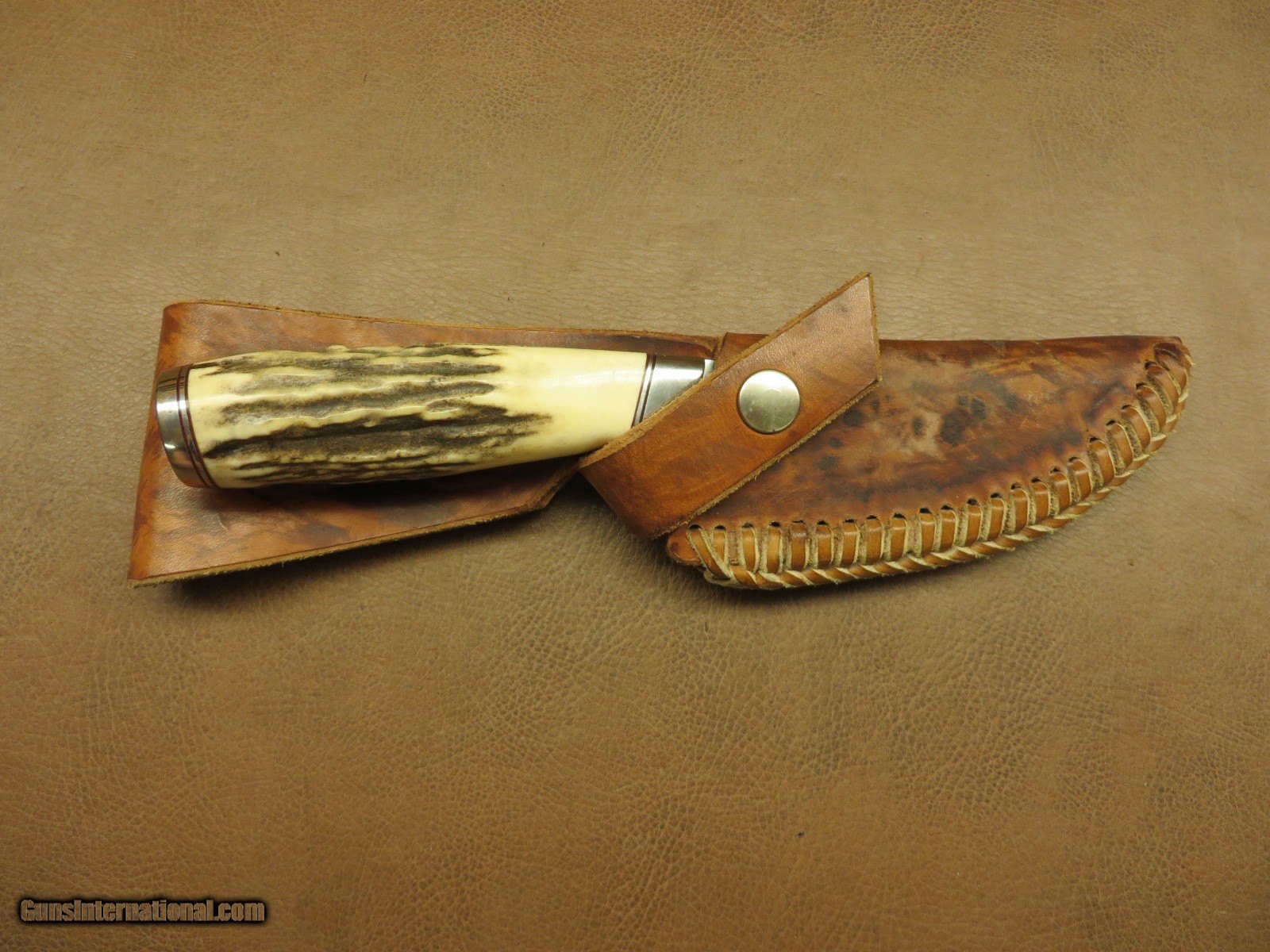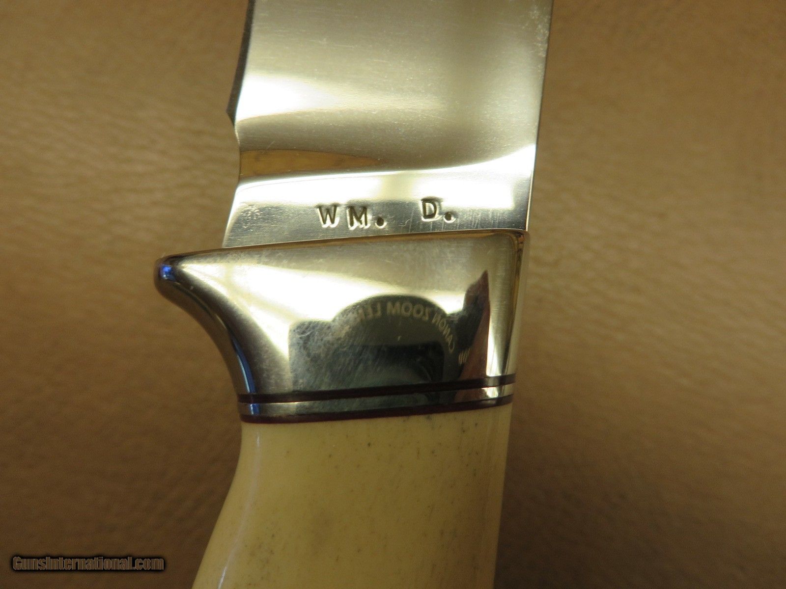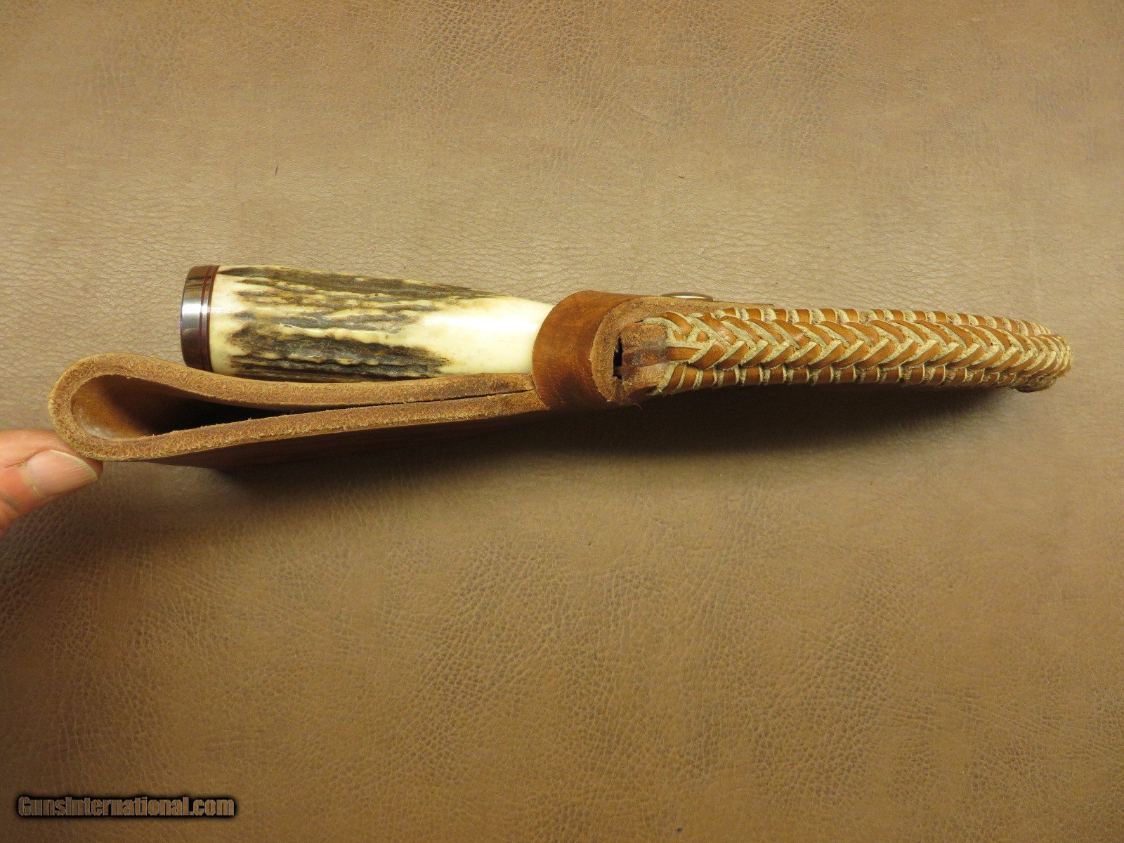 Description: 4 inch blade marked Wm. D. on one side and S. S. on the other. Sambar stag handles. Heavy leather sheath. SOLD |