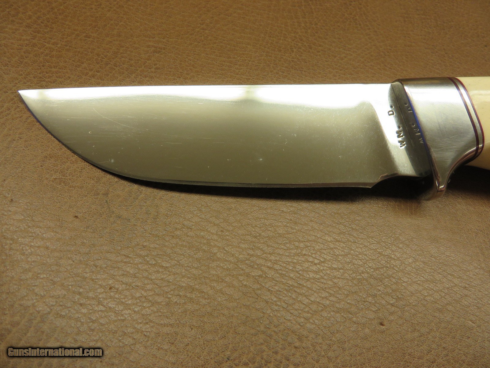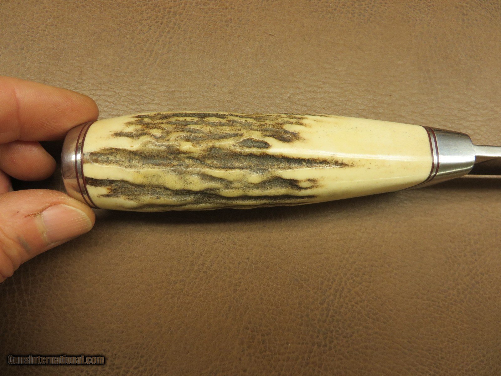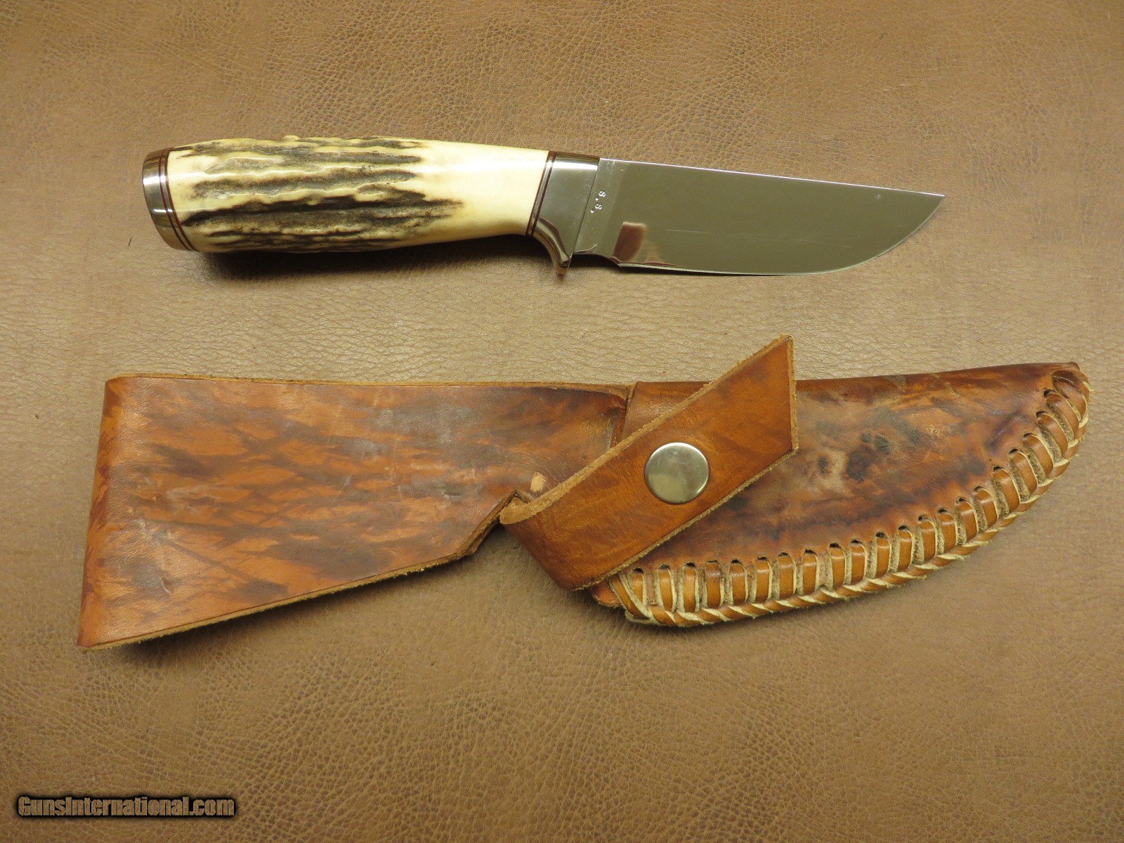 Description: 4 inch blade marked Wm. D. on one side and S. S. on the other. Sambar stag handles. Heavy leather sheath. SOLD |