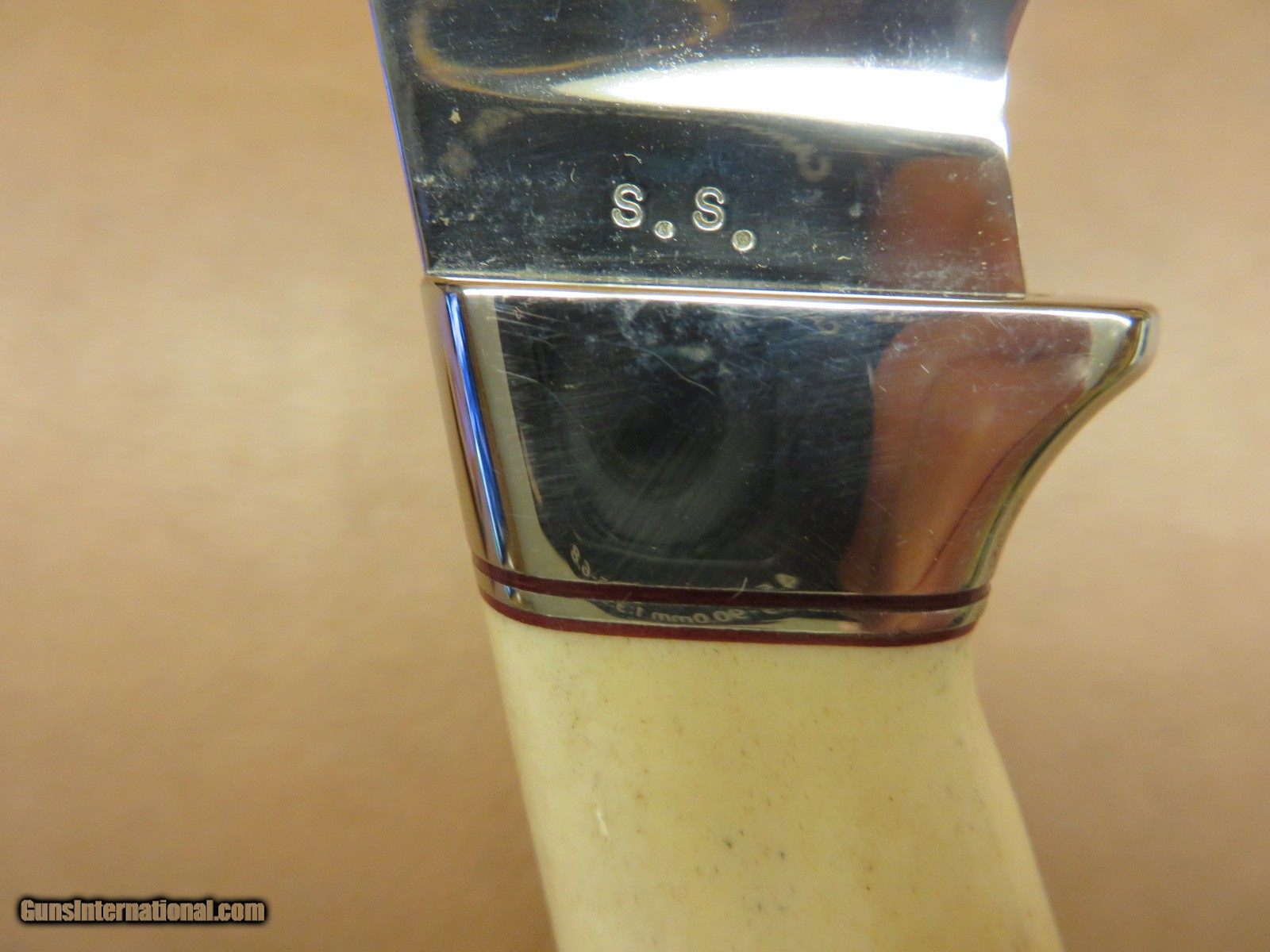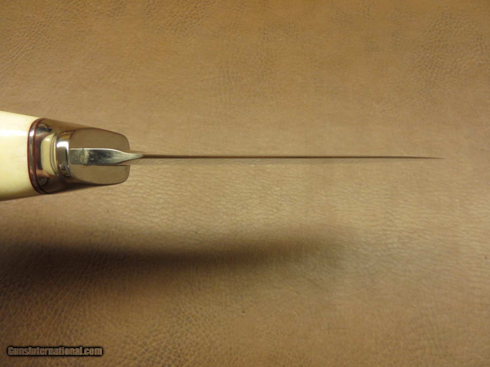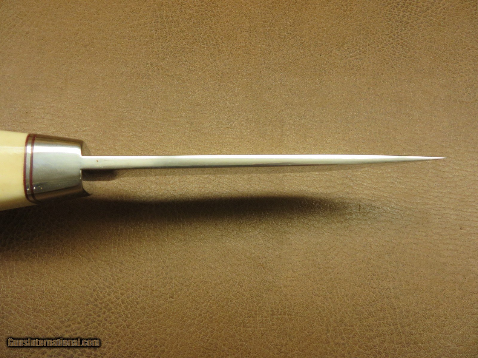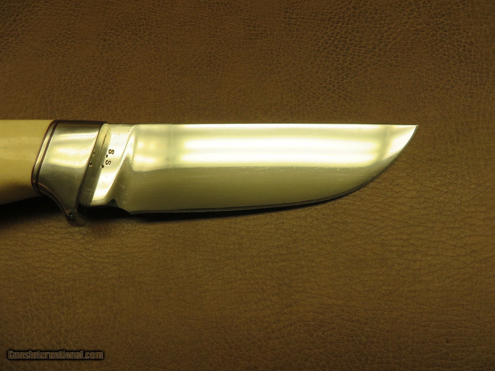 Description: 4 inch blade marked Wm. D. on one side and S. S. on the other. Sambar stag handles. Heavy leather sheath. SOLD |
