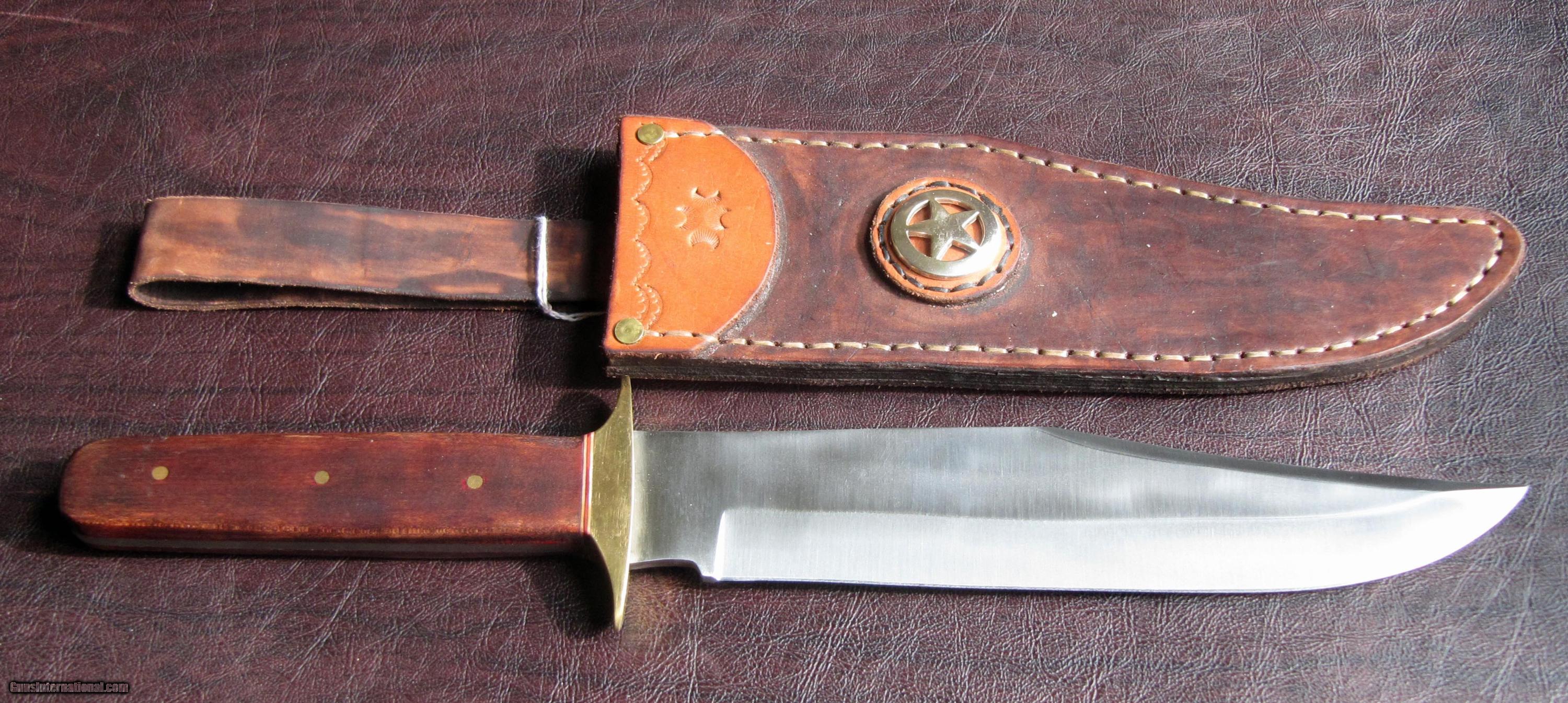 Description: Custom Bowie knife 10" Stainless steel blad with a Hard maple handle and a custom hand made lather sheath, SOLD |