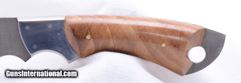 Description: Unknown maker..very faint logo stamped on blade, see photo. This is a nice, fairly stout, damascus staright edge hunting knife. 11 1/2" overall length, 6 1/8" overall blade (5 1/2" edged). Thick hardwood handles and bottom finger notches makes for a knife that is very comfortable in the hand. Excellent condition. SOLD |