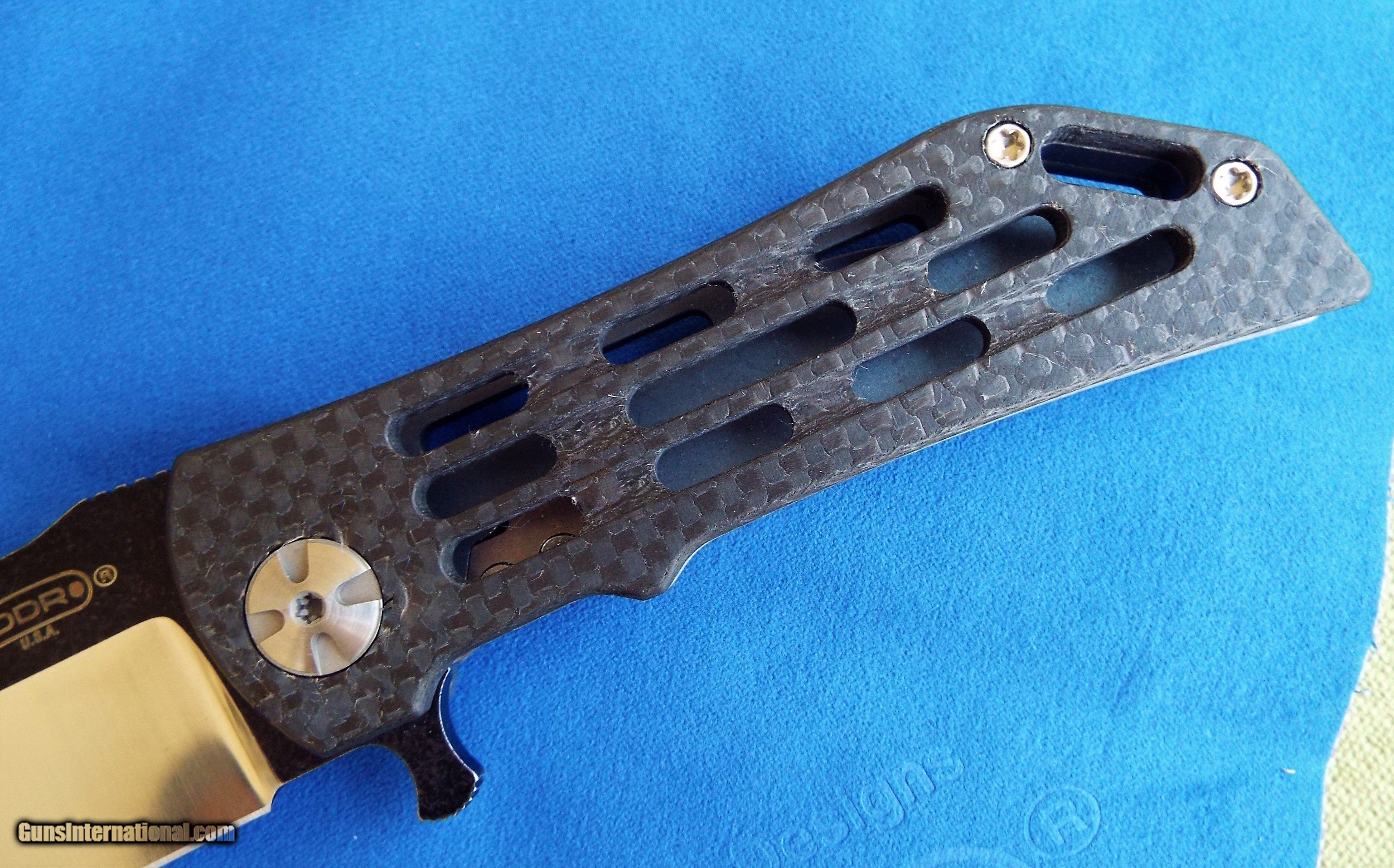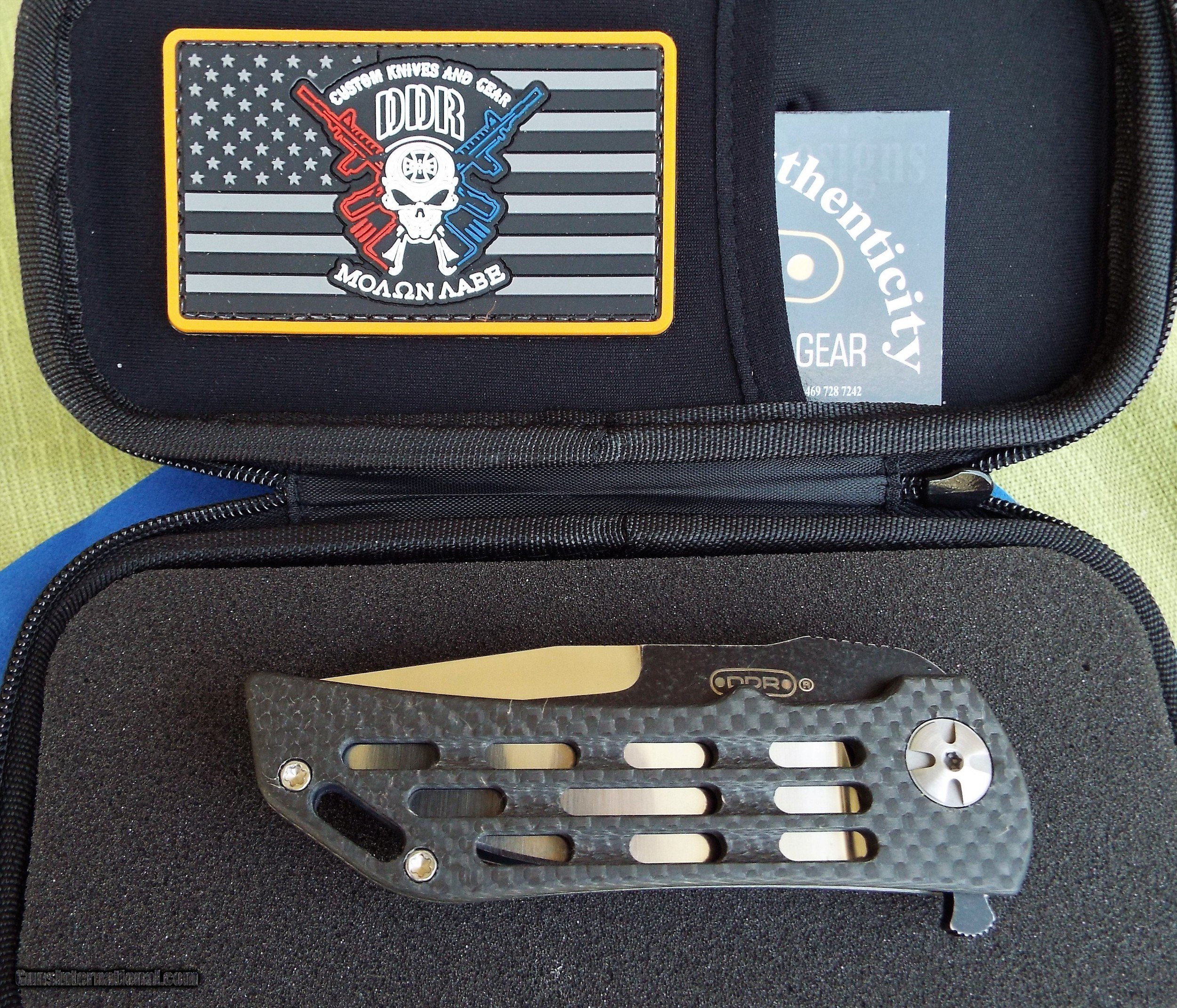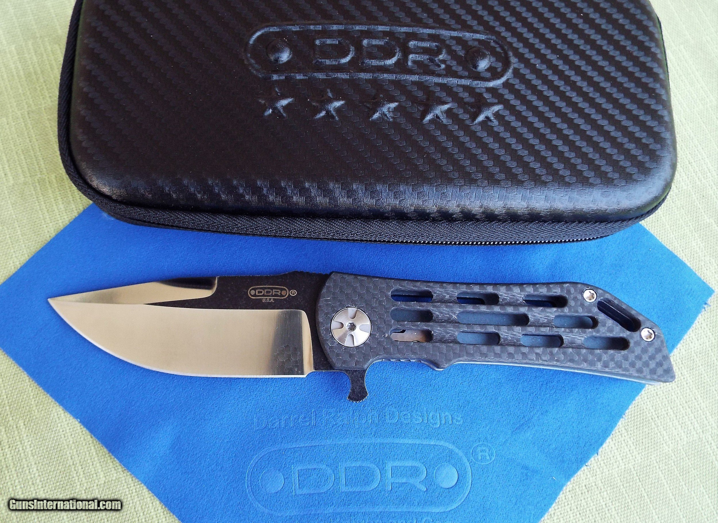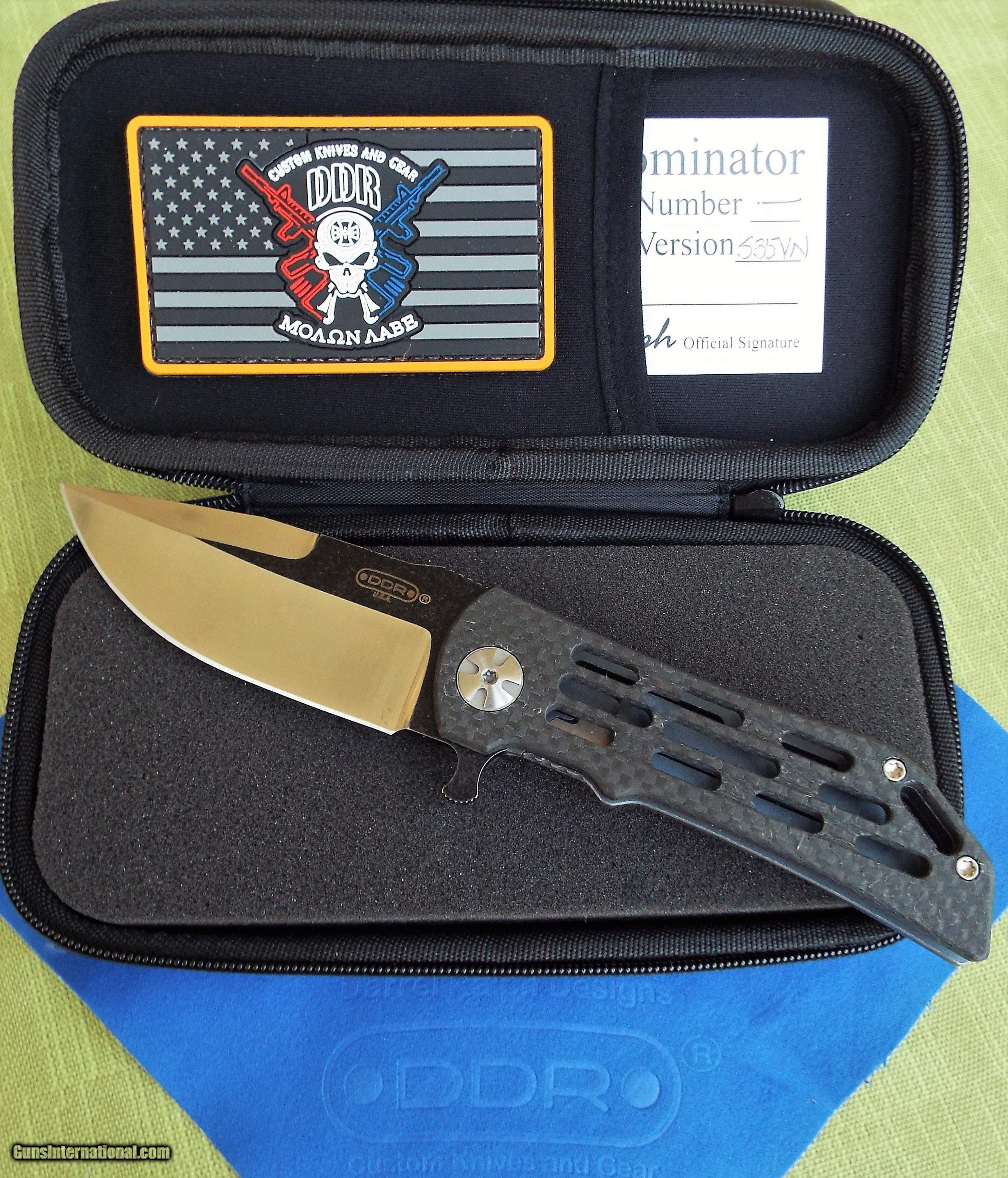 Description: Darrel Ralph DDR Custom 3.5 Ventilator Dominator CARBON FIBER / TITANIUM ~ Brand new dealer item NEVER SOLD ~ NEVER CARRIED ~ NEVER SHARPENED This Darrel Ralph custom Ventilator knife features a skeletonized carbon fiber front handle and a tumbled titanium frame lock with milled grooves for reduced weight. This super smooth light weight knife is perfect for Every Day Carry and CLASSY enough for any occasion! It has a unique two-tone blade (battle worn & satin) in a clip point Bowie style made from premium stainless steel. A curved titanium pocket clip tops off this one of a kind custom design. Included is DDR COA, limited lifetime warranty, embossed DDR cloth, & Zippered Case. Shipping is $9 USPS priority mail No international shipping! SPECIFICATIONS Overall Length:7.75" Blade Length:3.50" Blade Thickness:0.15" Blade Material:CPM-S35VN Blade Style:Clip Point Blade, Grind:Hollow, Finish:Satin Edge Type:Plain, Handle Length:4.25 SOLD |