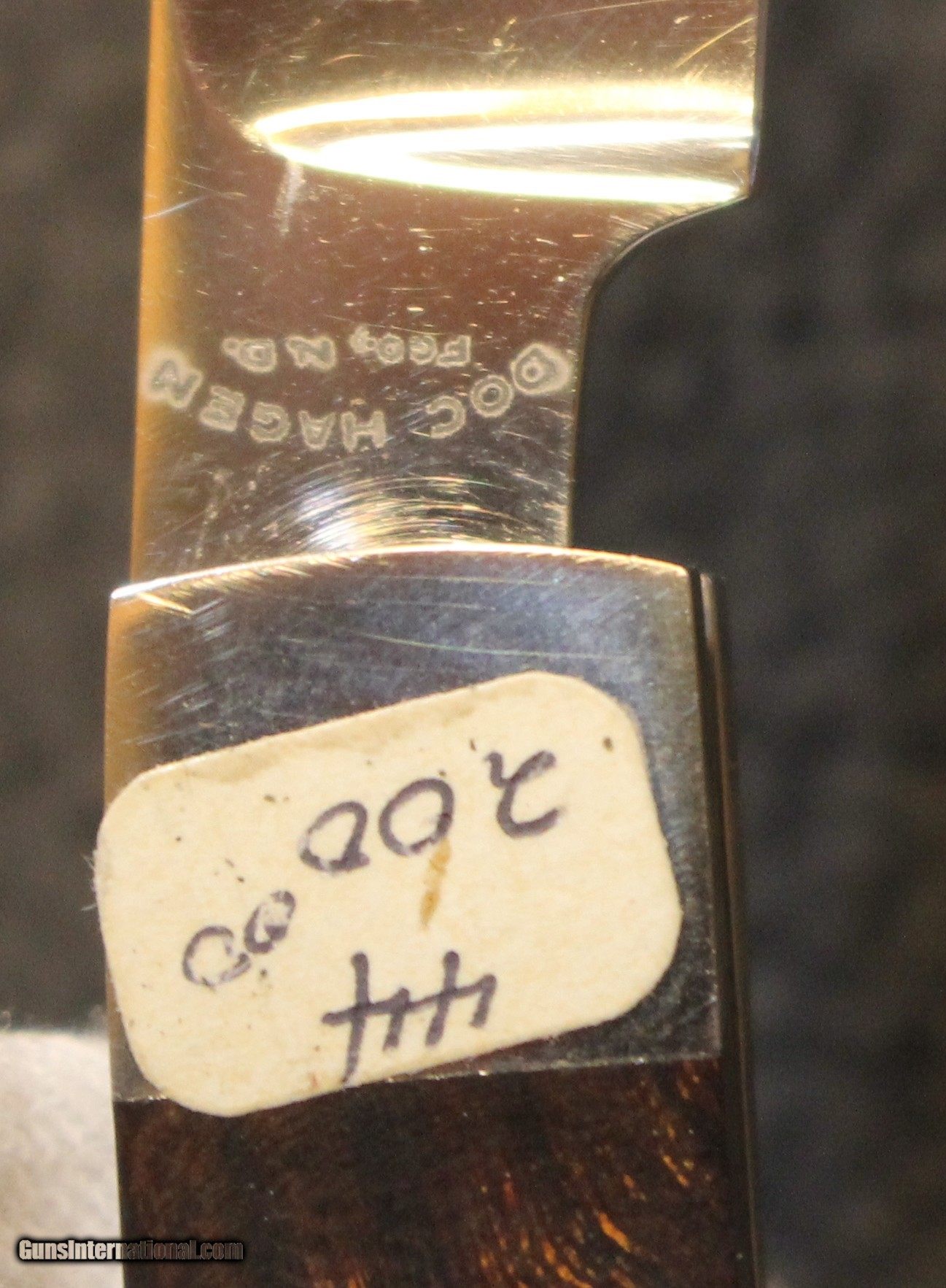 Description: Doc Hagen One of a kind Miniature Custom Folding Lock Blade Knife, Vintage Collector Lock Blade. Doc Hagen is from Pelican Rapids MN and sold his first knife in 1975. He specializes in folders of all kinds in W2, 440C, 154CM, and his own Damascus. Copied from Arizona Custom Knives.....................................Hagen, Philip L. (Doc) I have been making knives since 1973 and have been a voting member of the Knifemakers Guild since 1976. Membership in the Knifemakers Guild was one of the highlights of my life, and I am constantly trying to upgrade the quality of custom made knives. I've been a dentist in private practice since 1962, and working with my hands and concentrating on detail has been my way of life. Utilizing many of the same skills, knifemaking offers me the ultimate in creative expression. All of my knives are completely handcrafted. Folders have become my specialty, however I enjoy making all types of knives, including special designs that suit the particular needs of the customer. Natural handle materials are my preference... the more exotic the better! The steels I use are 440C stainless and Udeholm UHB stainless. Heat treating is done by me in my own controlled-atmosphere oven. I have been forging blades since 1982. I make both 01-mild Damascus and 10/70 spring steel nickel Damascus. I guarantee my forged blades will not break................................................. There is only the knife. We have no other information on this piece. Guessing this piece was built 30 or 40 years ago as the estate had it in a display case when the store closed 25 years ago. The price tag you see on it was the store's price tag.?????? NOTE: Look close at the pictures as the item you see is the one you get. As is means AS IS so There is NO, Refund. This came from the estate of an FFL/SOT Gun Smith, Gun Store that is out of business. The estate was an avid collector. This is from the collection or was inventory of 100 plus straight and folders. There will be countless other listings from this inventory and other inventories. We are selling for the estate/store. This is NOT a liquidation. There are no lists and will be no lists. Please check our other listings for more items Please also check our Webpage and or Facebook page at P&T Partners Shipping is included. Shipping is NOT FREE. Just included for Priority Mail, Full Insurance and a Signature at the receiving end. You can let me know if NO signature due to your work schedule. Credit in any form, shape or manner add 3.5% and credit by PHONE only. Personal checks accepted, we do not hold until clear for parts. Postal Money orders also accepted. If you are in Texas and purchasing from Texas you are subject to Texas State Sales Tax For those that are local, there is no Face To Face. On Line means On Line. Again if you are Local there is NO local pick up. We ship only SOLD |