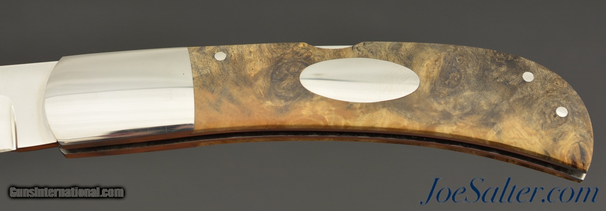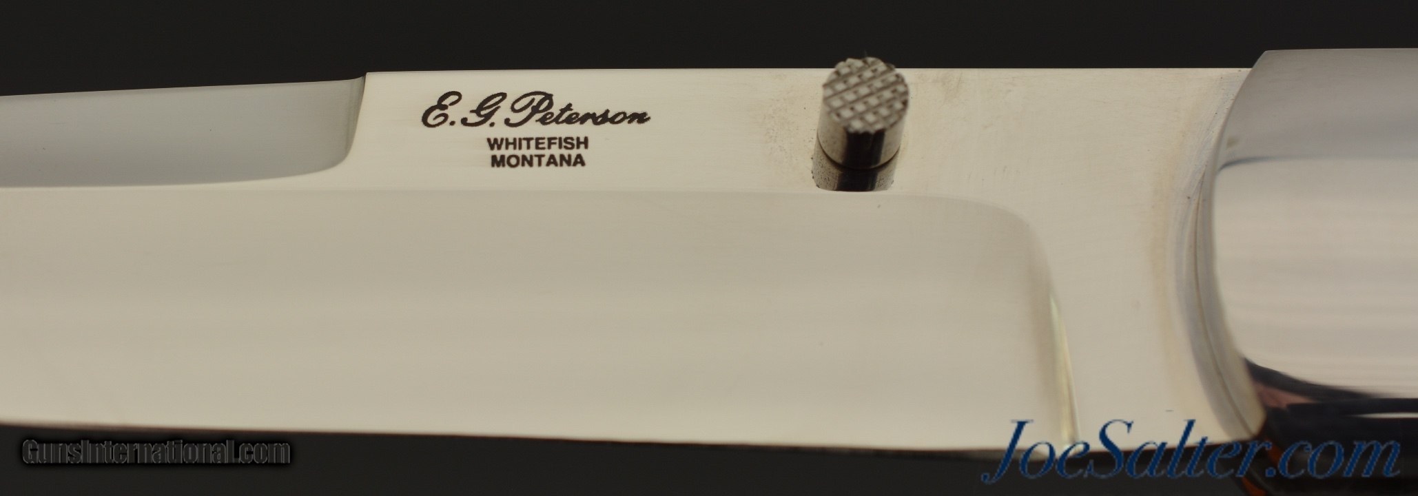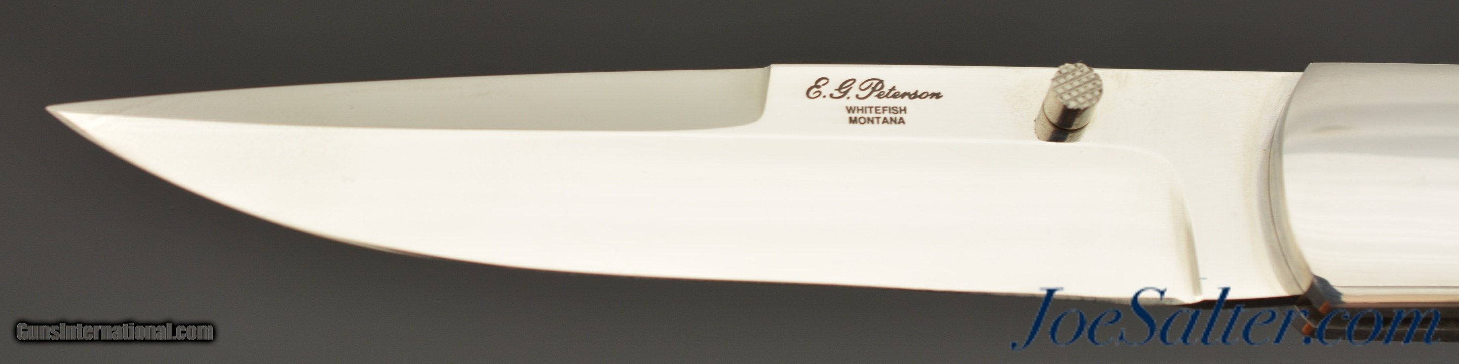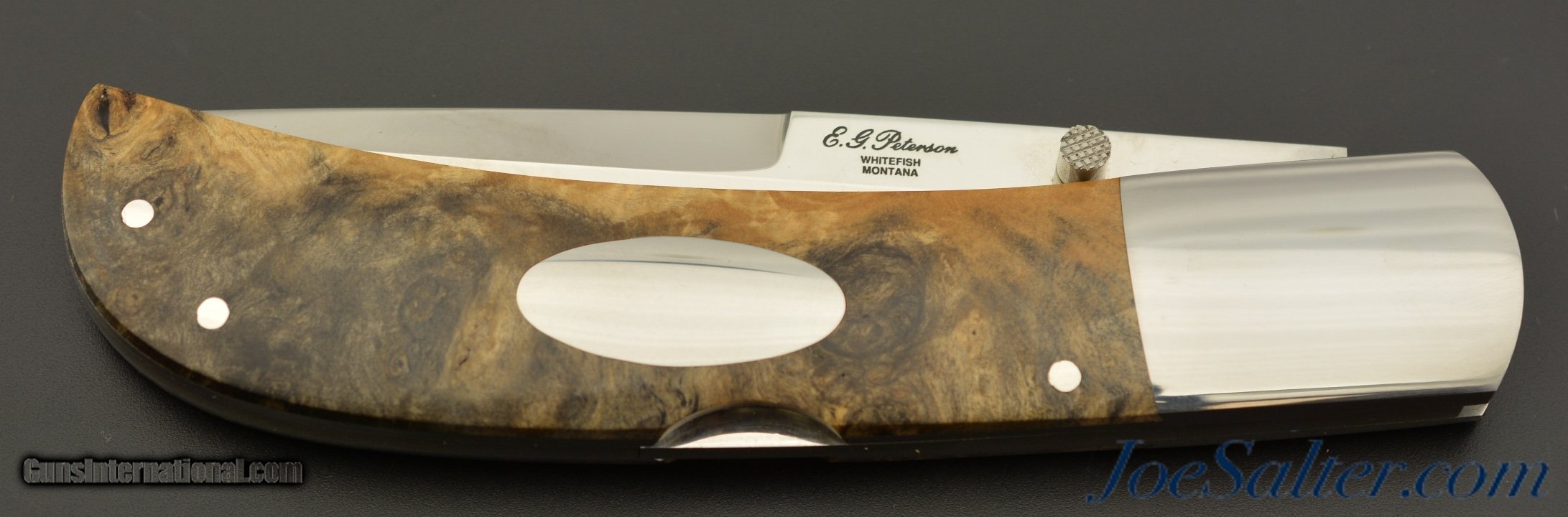 Description: This is a custom lockback folding knife made by Eldon Peterson of Whitefish, Montana. The large centerlock knife measures 5 1/4" with a 4 1/2" drop point blade equipped with 2 1/2" unsharpened false edge and checkered thumb stud. The blade remains bright, unsharpened has etched "E.G. Peterson" signature maker mark on the obverse cheek. The nickel silver bolster retains all its bright mirror polish and the stabilized burl scales remain in excellent condition each fastened by three small bright pins. The obverse scale has a brightly polished large oval inlaid shield ready for custom engraving. Included with the knife is a copper tone velvet pouch with tongue flap. An attractive and very collectible chute style lockback. SOLD |