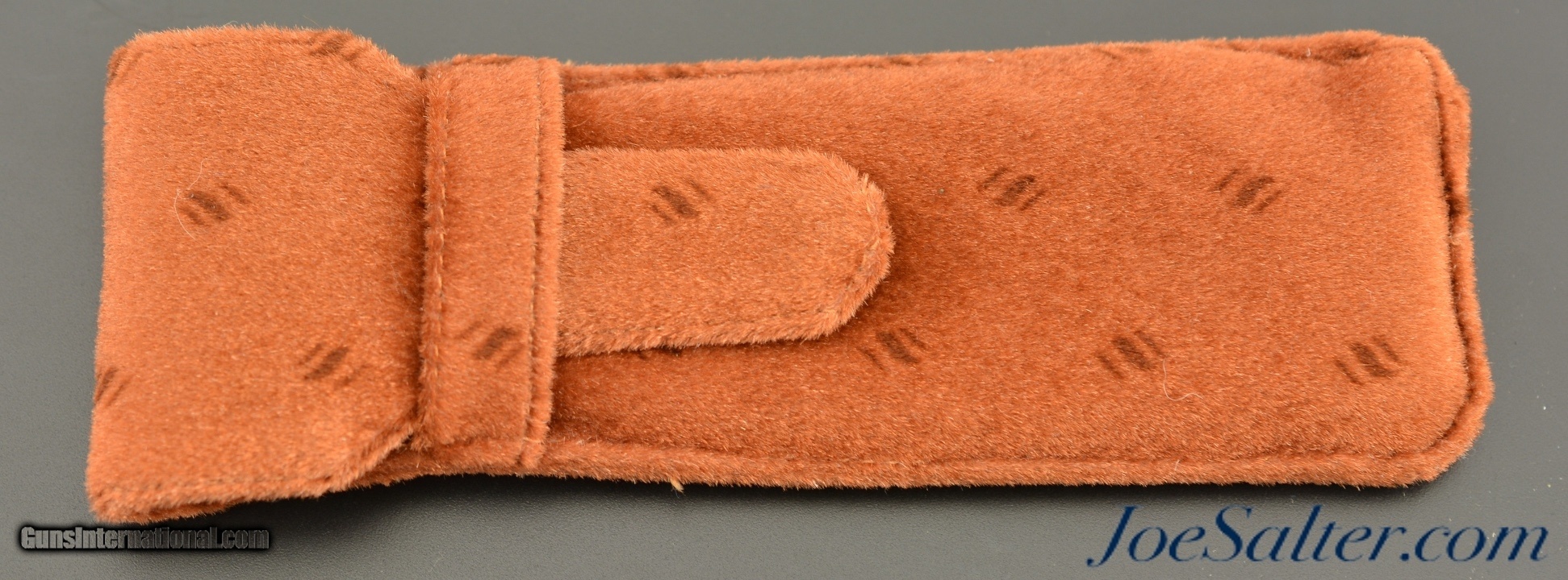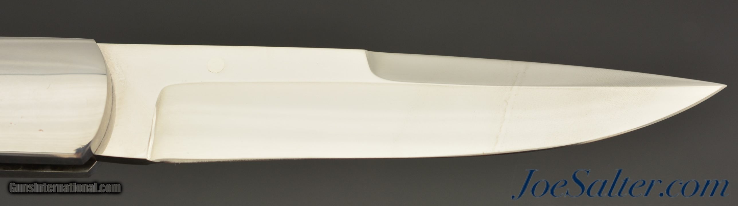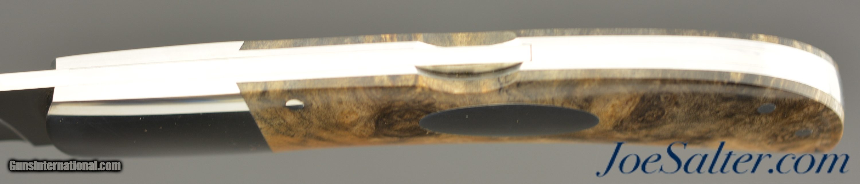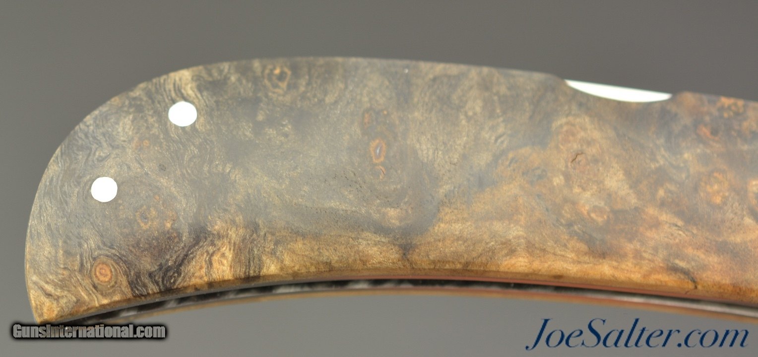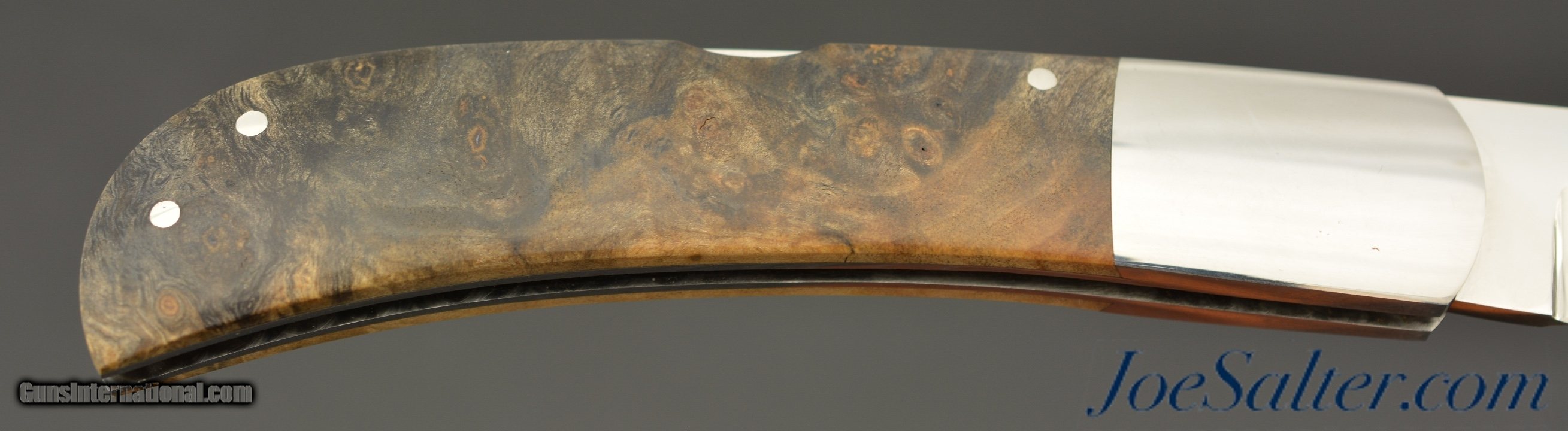 Description: This is a custom lockback folding knife made by Eldon Peterson of Whitefish, Montana. The large centerlock knife measures 5 1/4" with a 4 1/2" drop point blade equipped with 2 1/2" unsharpened false edge and checkered thumb stud. The blade remains bright, unsharpened has etched "E.G. Peterson" signature maker mark on the obverse cheek. The nickel silver bolster retains all its bright mirror polish and the stabilized burl scales remain in excellent condition each fastened by three small bright pins. The obverse scale has a brightly polished large oval inlaid shield ready for custom engraving. Included with the knife is a copper tone velvet pouch with tongue flap. An attractive and very collectible chute style lockback. SOLD |
