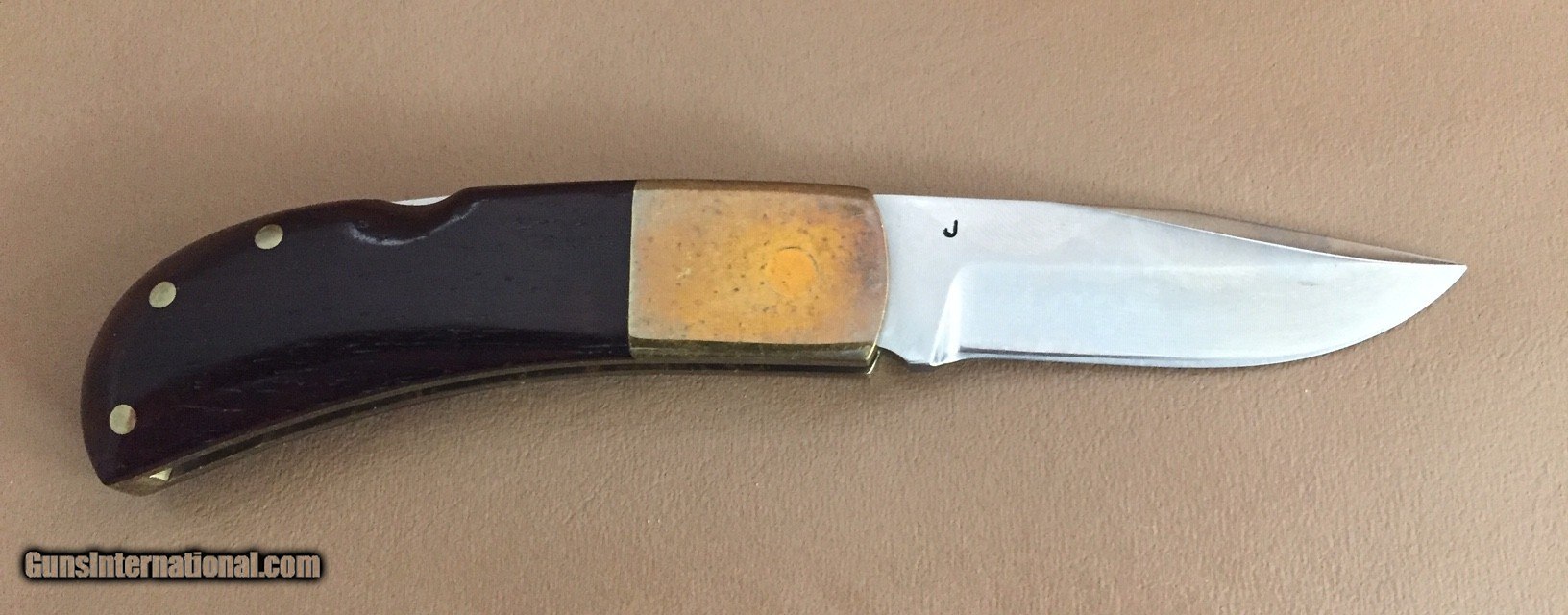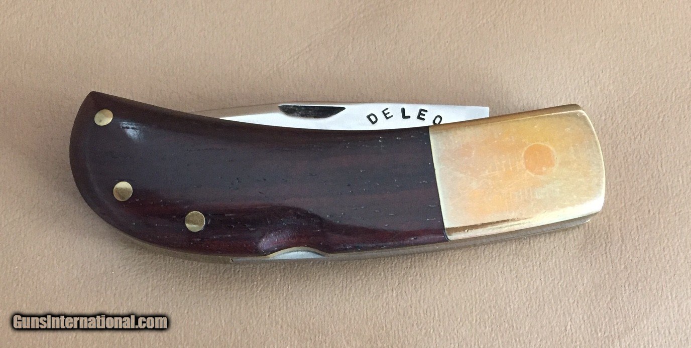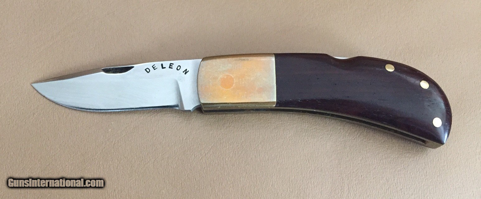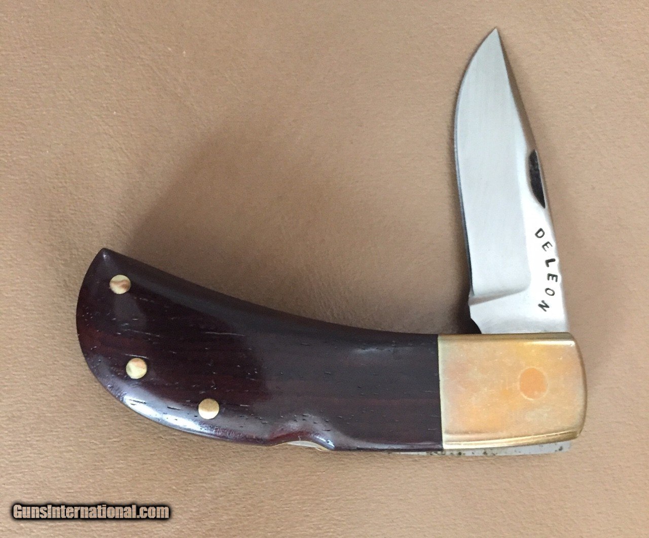 Description: ENEDINO DE LEON - FOLDING HUNTER KNIFE TWO AND ONE-HALF INCH BLADE: This offers for sale a “FOLDING HUNTER“ KNIFE with two and one-half inch (2.5”) blade and scales of Cocoa Bolo wood, hand-made by Enedino De Leon in New / Unused Condition with canvas belt sheath. (Note: De Leon’s 2.5 inch and 6 inch blade Folding Knives were the rarest of his folding knife line.) Enedino did not enjoy making folding knives as much as he enjoyed making straight knives. Consequently, he made very few “Folding Hunter” knives, after he departed from the Ralph Bone Knife Company in 1978 and established his own company, “De Leon Made Knives”. Yet, De Leon’s catalog, “De Leon Made Knives” listed his Folding Hunter knife models, available with two and one-half inch, three inch, three and one-half inch and six inch blades with a choice of scale material. The subject two and one-half inch blade “Folding Hunter” knife remains in new, unused condition, is very rare and is among very few Models J “Folding Hunter” knives of such blade-length made by Enedino De Leon. Note: A fully documented and highly illustrated account of the custom knife making careers of Enedino De Leon and Ralph P Bone, along with Bone’s gun-making and Master Engraving career is provided in seller’s book “The Artistry Of Ralph P Bone”. Now at age 85, Seller is liquidating his small collection of Ralph Bone and Enedino De Leon custom-made knives. SOLD |
