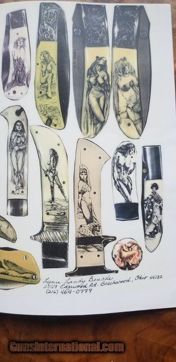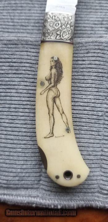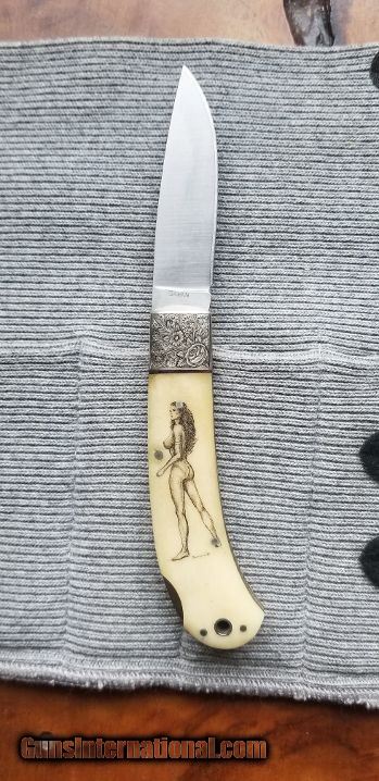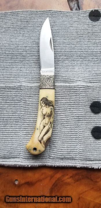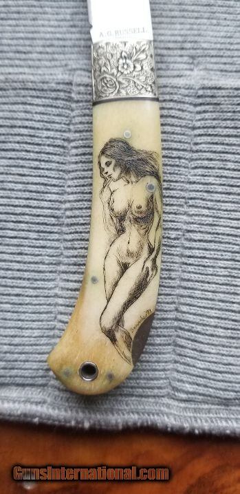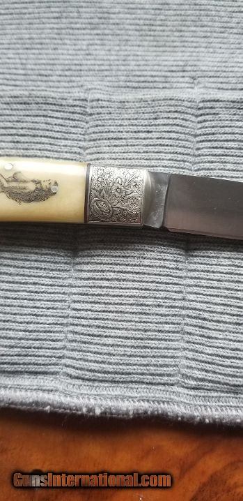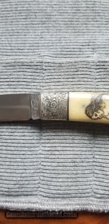 Description: Price reduced An exotic Custom A. G. Russell gentleman folder engraved by A. Bee and scrimshaw by Lynn Benede in like new condition. Knife is a 3 inch lock back made in Japan with horn grips. Absolute a beautiful knife to carry and look at ! $ 325.00 plus shipping. SOLD |