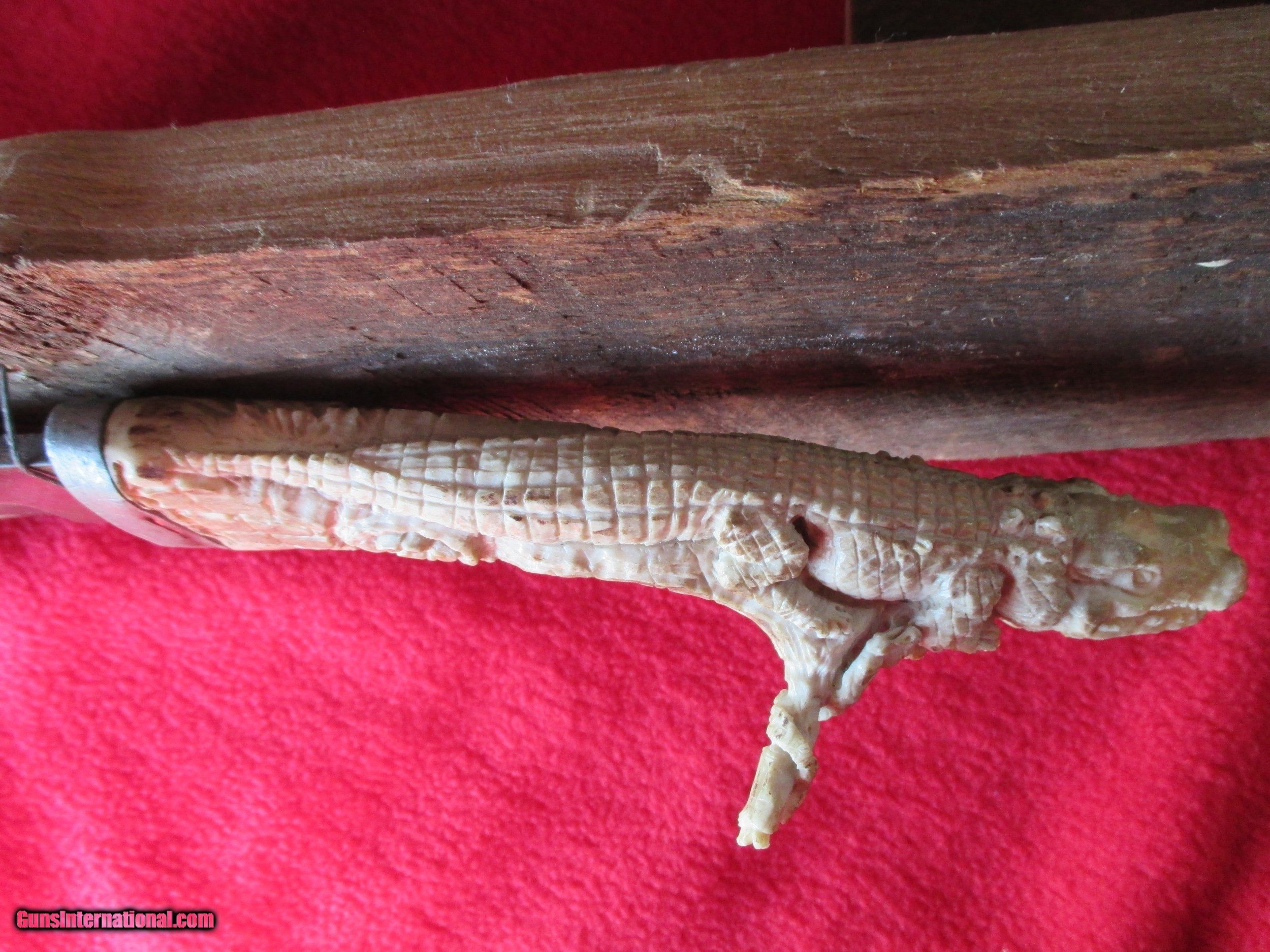Description: I picked this up at an antique weapon show years ago in Florida. It's a large Bowie with a hand carved Gator grip. The knife is 16 1/2 inches long with a 9 1/4 inch blade. There is a snake on the blade. I mounted it on an old board to protect the Gator and the branch it is on. The detail of the Gator is amazing. The entire presentation is very solid. Alan 810-922-4279 or email me between the hours of 10 am to 7 pm est. SOLD |