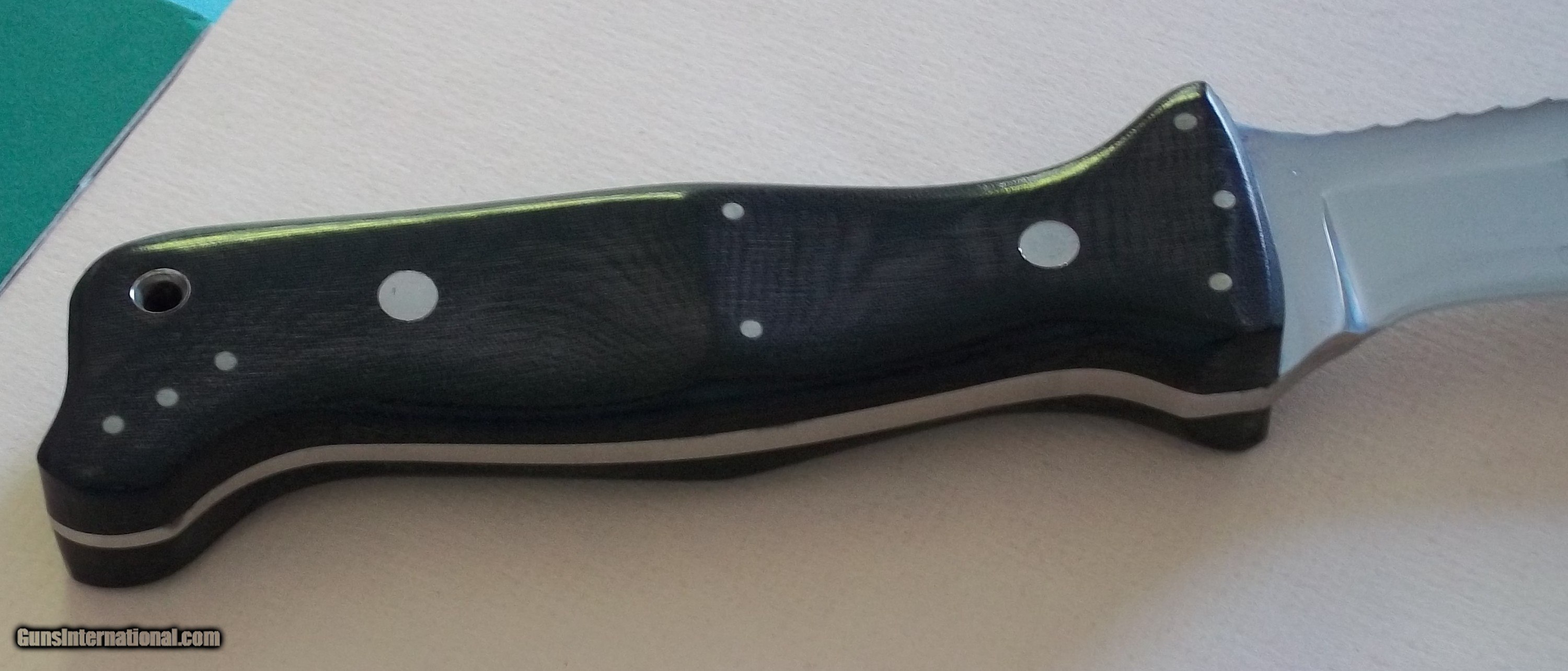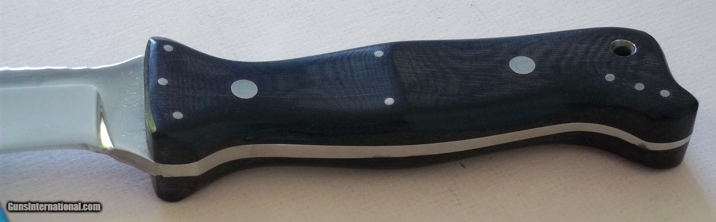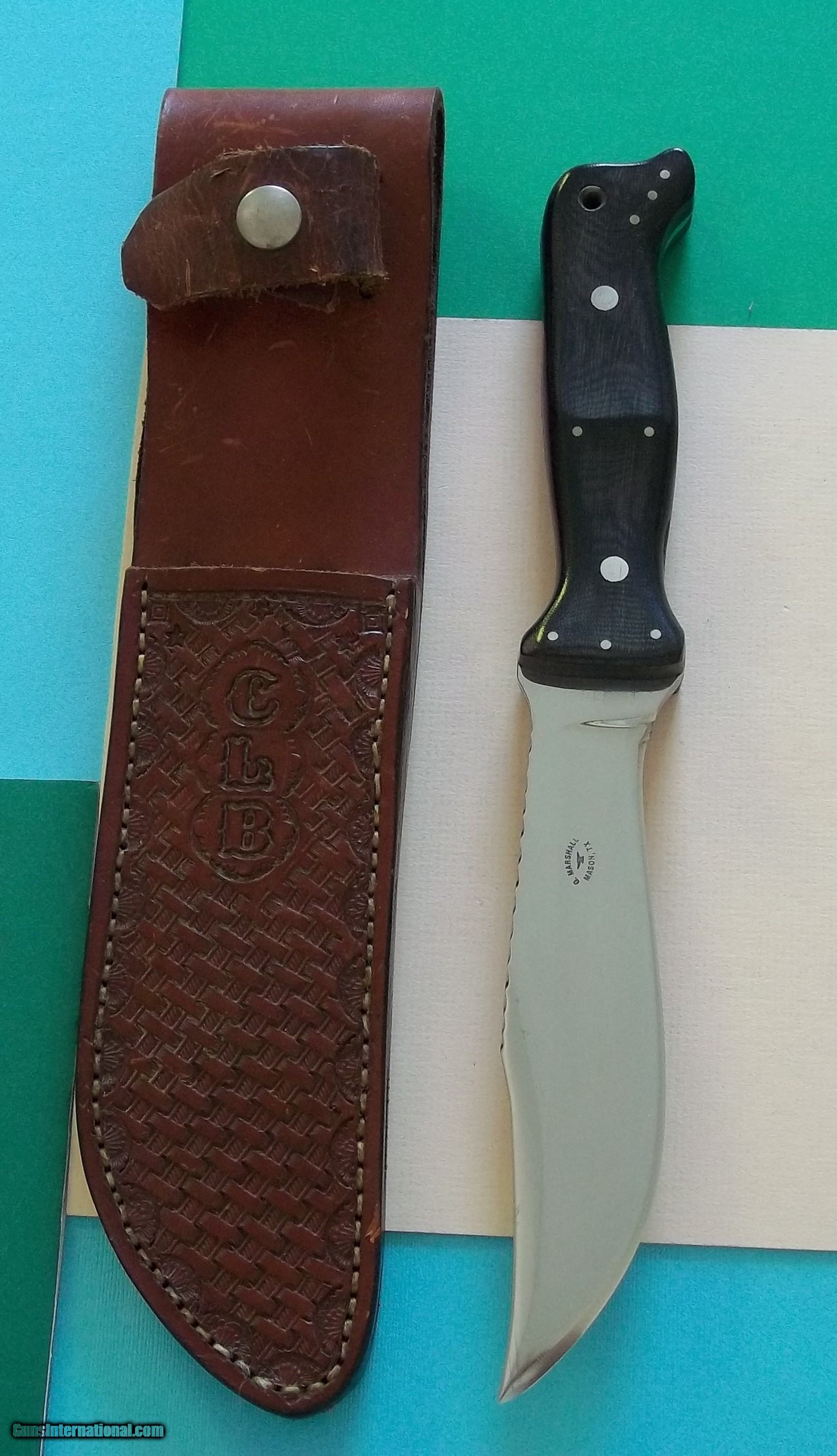 Glenn Marshall - Bud Lang One-of-a-kind Award Knife from 1998. Original carved leather scabbard by the maker. Never to be reproduced. by the now deceased great Texan knifemaker. BLade is 6-1/2" by 1-3/8", made from D2 steel stock, fancy file work on top of blade and tang, black micarta scales handle, stainless steel pins. Free shipping in the US only with signature required and delivery conformation. Sold "AS IS" no refund, no exchange. I do not ship to a P.O. Box. Thank you for looking.