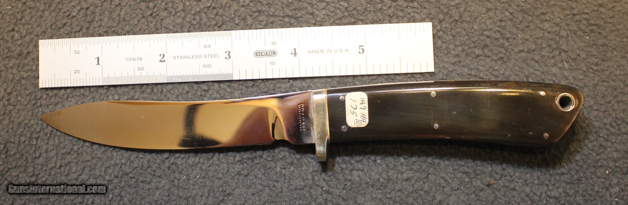 Description: Graham Custom Fixed Blade Knife NO Sheath. As for as which Graham. We do not know. Did a bit of internet search and could not find a "Graham" with the logo shown on the knife. There is only the knife. We have no other information on this piece. Guessing this piece was built 30 or 40 years ago as the estate had it in a display case when the store closed 25 years ago. The price tag you see on it was the store's price tag.?????? NOTE: Look close at the pictures as the item you see is the one you get. As is means AS IS so There is NO, Refund. This came from the estate of an FFL/SOT Gun Smith, Gun Store that is out of business. The estate was an avid collector. This is from the collection or was inventory of 100 plus straight and folders. There will be countless other listings from this inventory and other inventories. We are selling for the estate/store. This is NOT a liquidation. There are no lists and will be no lists. Please check our other listings for more items Please also check our Webpage and or Facebook page at P&T Partners Shipping is included. Shipping is NOT FREE. Just included for Priority Mail, Credit in any form, shape or manner add 3.5% and credit by PHONE only. Personal checks accepted, we do not hold until clear for parts. Postal Money orders also accepted. If you are in Texas and purchasing from Texas you are subject to Texas State Sales Tax For those that are local, there is no Face To Face. On Line means On Line. Again if you are Local there is NO local pick up. We ship only SOLD |