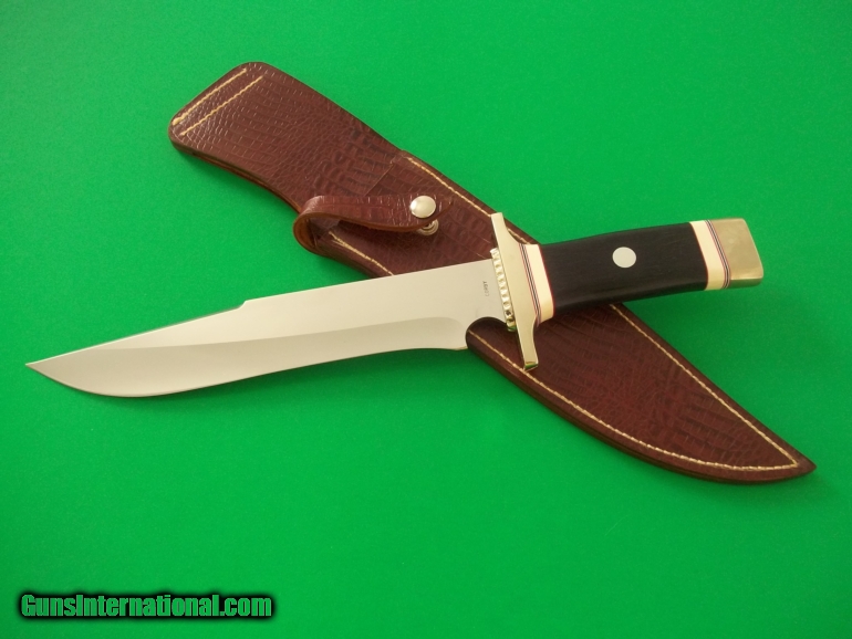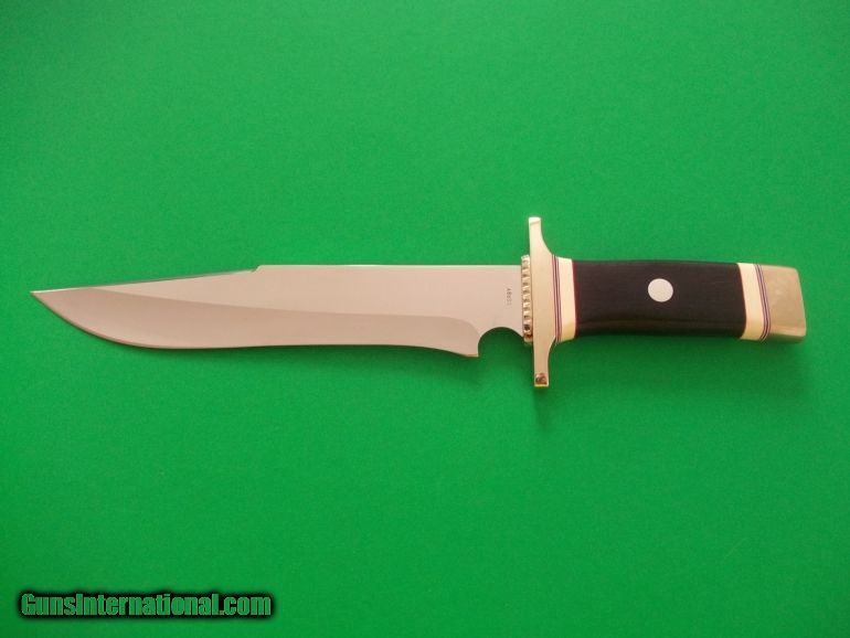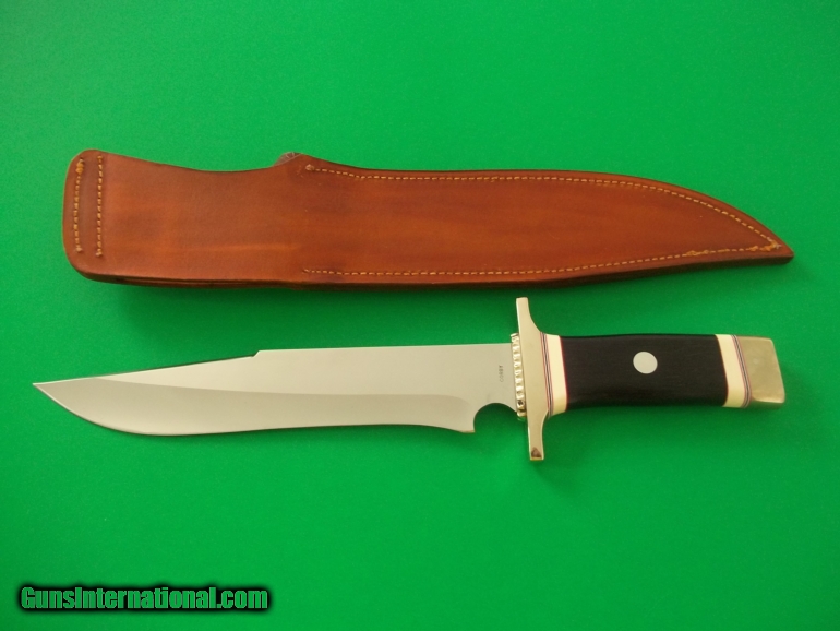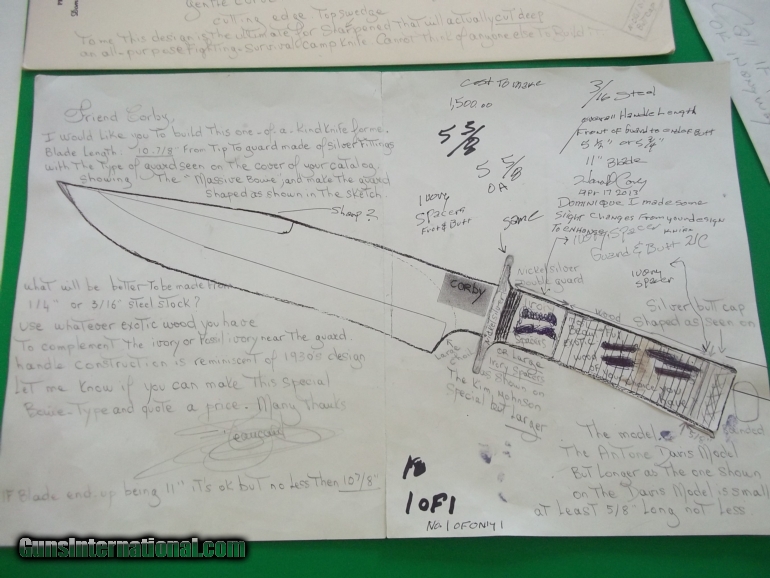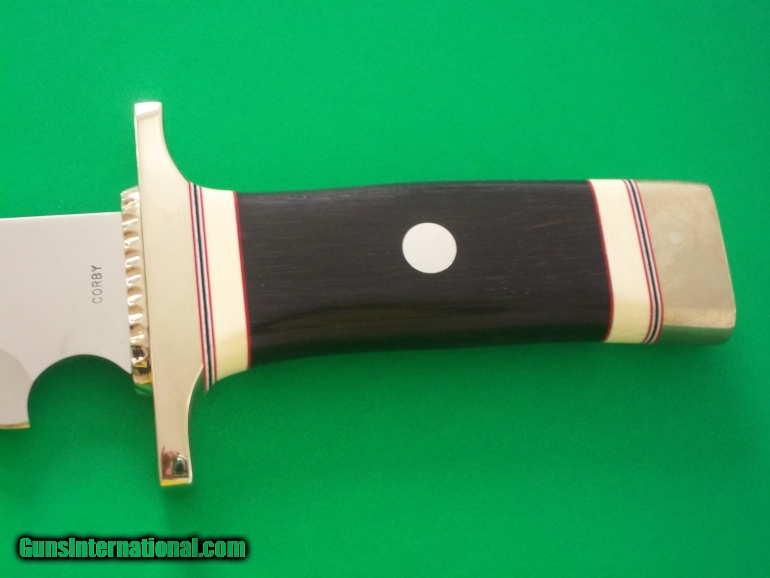 Description: Harold Corby one-of-a-kind Bowie type fighter-camp-survival knife is a masterpiece. Designed by myself over 30 years ago, Harold made this unique knife based on all sketches, drawings and the original masterplate I made. Harold completed this knife in April 17, 2013 when I personally went to pick it up in TN. This knife will never be reproduced as it is a one-of-a-kind model and all the original plates were destroyed in front of me. The blade is over 11 inches in length, has a double German silver guard, a pure 99.99 % silver fluted collar with fancy file work, a rare and unique combination of African ebony handle with ivory spacers, and a round German silver name plate with 1 of 1 engraved in it and a large German silver butt cap. This is an astonsihing piece of the highest quality, Corby has always made the most beautiful knives availlable anywhere when it comes to make knives by the stock removal method. Comes with a high-grade leather scabbard covered with alligator skin as a touch of class to an already spectacular knife. This is a big knife folks !. All drawings, sketches come with the knife, including Harold's latest revised sketch and drawing showing changes, added notes explaining why it was necessary to change the knife's bevels and grinding lines as opposed to what I had designed to insure full thickness at the ricasso. Ths is a very beautiful, one of the finest and gorgeous knife like you will never see anywhere today. I do not engage in any sort of trading. Free shipping within the U.S.A only . This is by far the finest and most amazing Bowie availlable. Harold has been known for putting an unsurpassed mirror finish on his blades. Knife is in an absolute immaculate, pristine condition as I handle my knives with the utmost care and respect. A very high quality buffalo hide custom made carrying zipper case is included with the knife. ( I do have other Corby's knives-.please inquire within if interested ). Thank you for looking . SOLD |