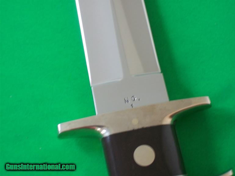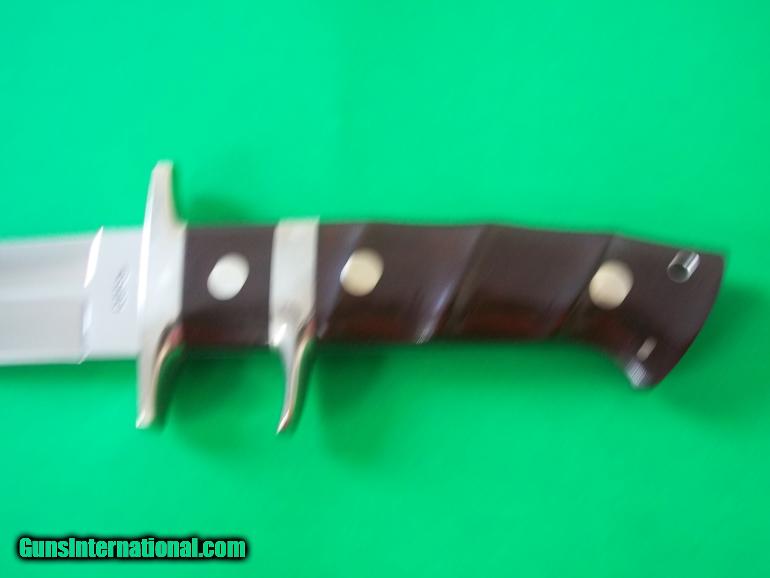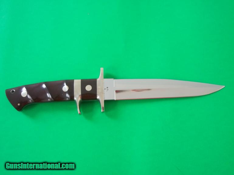 Description: HAROLD CORBY ONE-OF-A-KIND FIGHTER made in 1977 was never reproduced by this extremely talented maker whose knifemaking skills are unmatched today and whom has been recognized by his peers as one of the best knife maker in the US if not the best for his unsurpassed skills in knife making . Knife has a 6- 3/8 " by 1- 1/8 " blade with a never duplicated especially-designed sculpted ergonomic " three-D " old antique burgundy Westinghouse ( long discontinued and no longer availble) micarta handle. Blade is stamped CORBY and 01 in what is a stunning,astonishing knife of extreme beauty and way above crasftsmanship as it is the only such ever produced knife in existence . This sub-hilted fighter is as means as it looks and was constructed as a full tang model with all silver fittings ( guard,sub-hilt and pins) throughout its amazing construction. This knife represents the epitome of a true Harold Corby combat/fighting knife as a superlative and absolute collector's ite. Harold is a National tresaure to the most discriminating collectors when it comes to have produced the most spectacular handmade knives there is. Price include shipping priority mail, insured USPS. This model is a rarity. I have a large collection of one-of-a-kind knives by Corby inquire within if interested. This sub-hilted fighter repreents the best in what one can have today-matching that mdel will be practically impossible by any of the modern so-called makers today as there is only one Corby around ! Shipping included ( USPS, priority mail, insured ( Thank you for looking. SOLD |