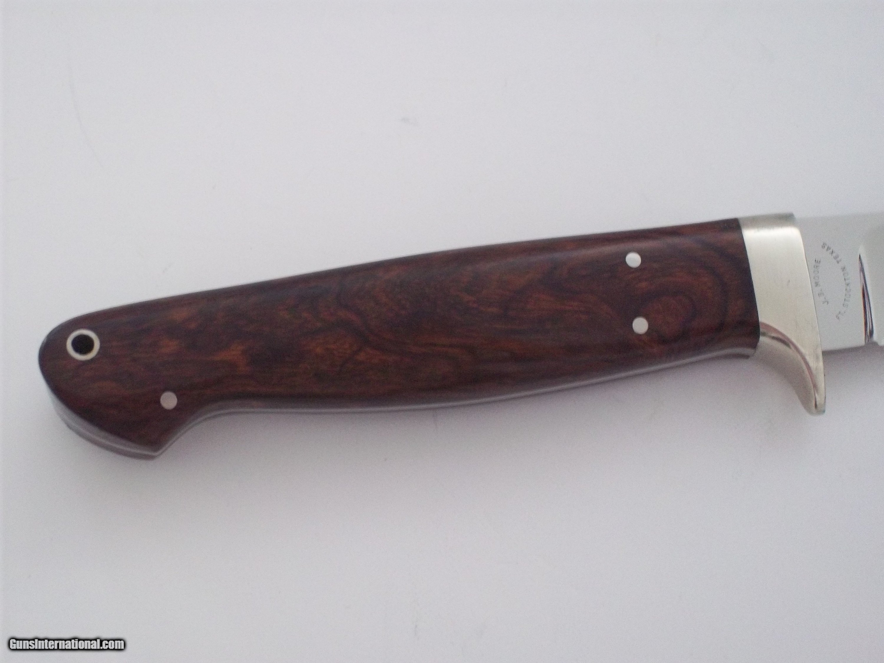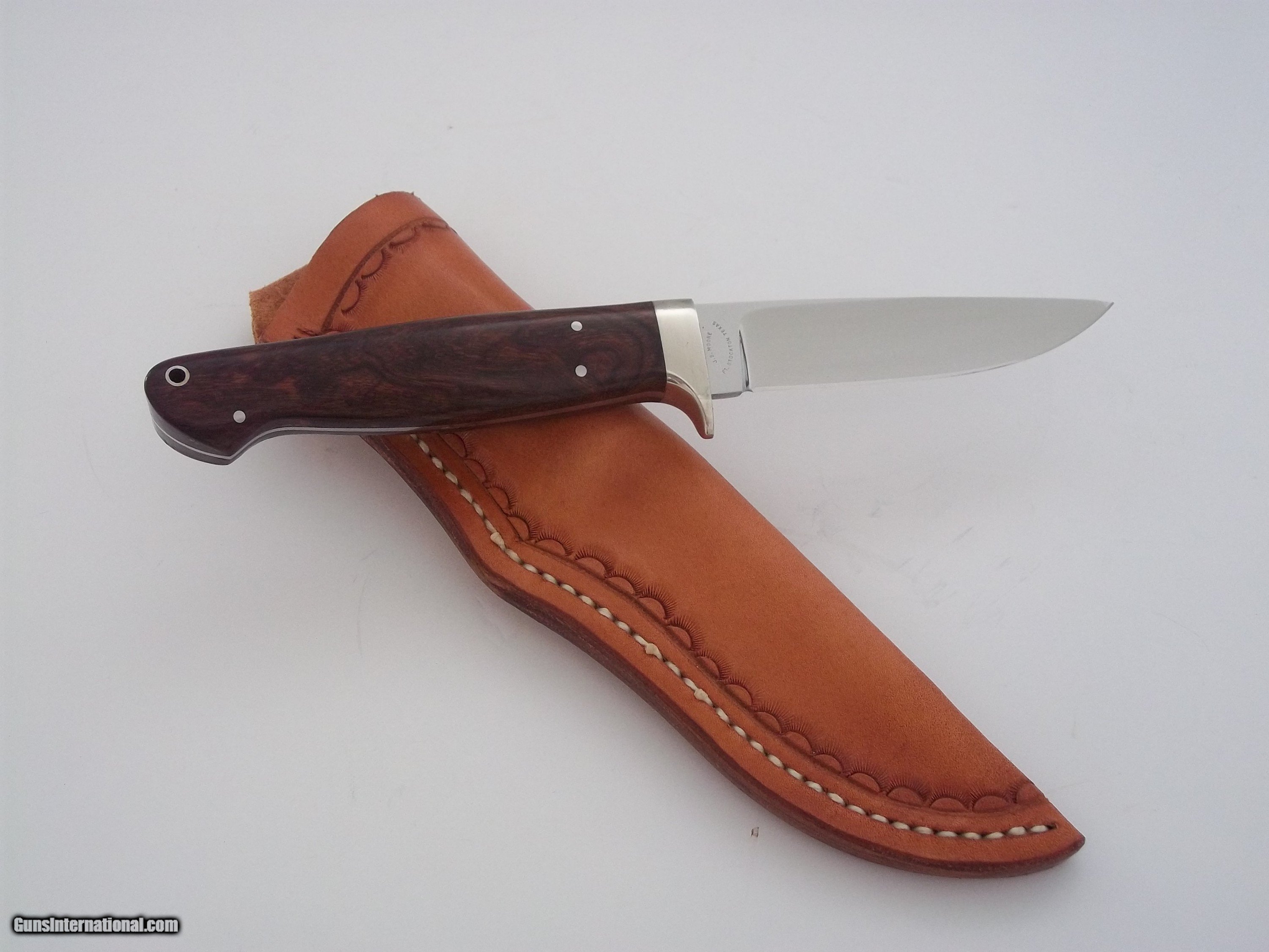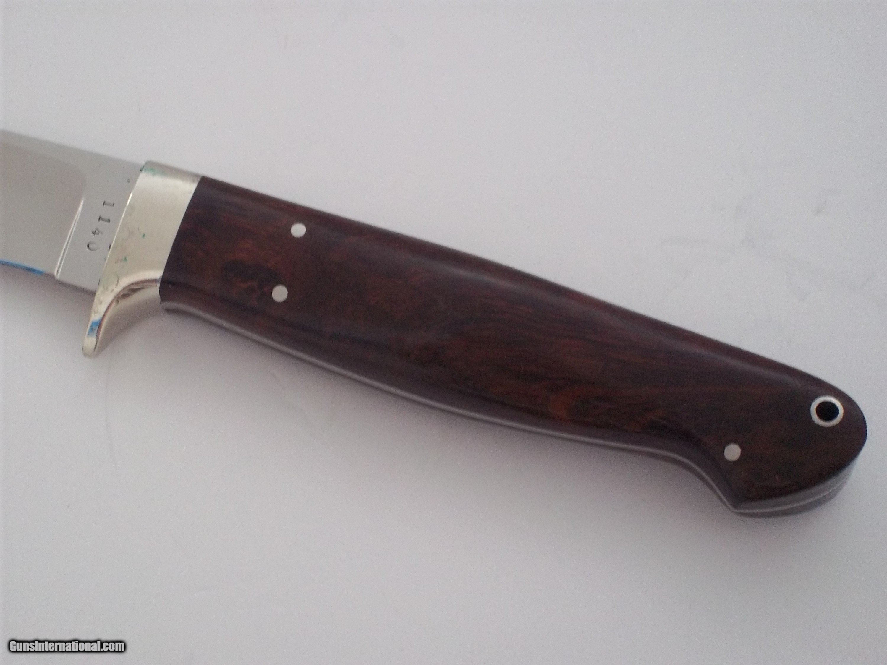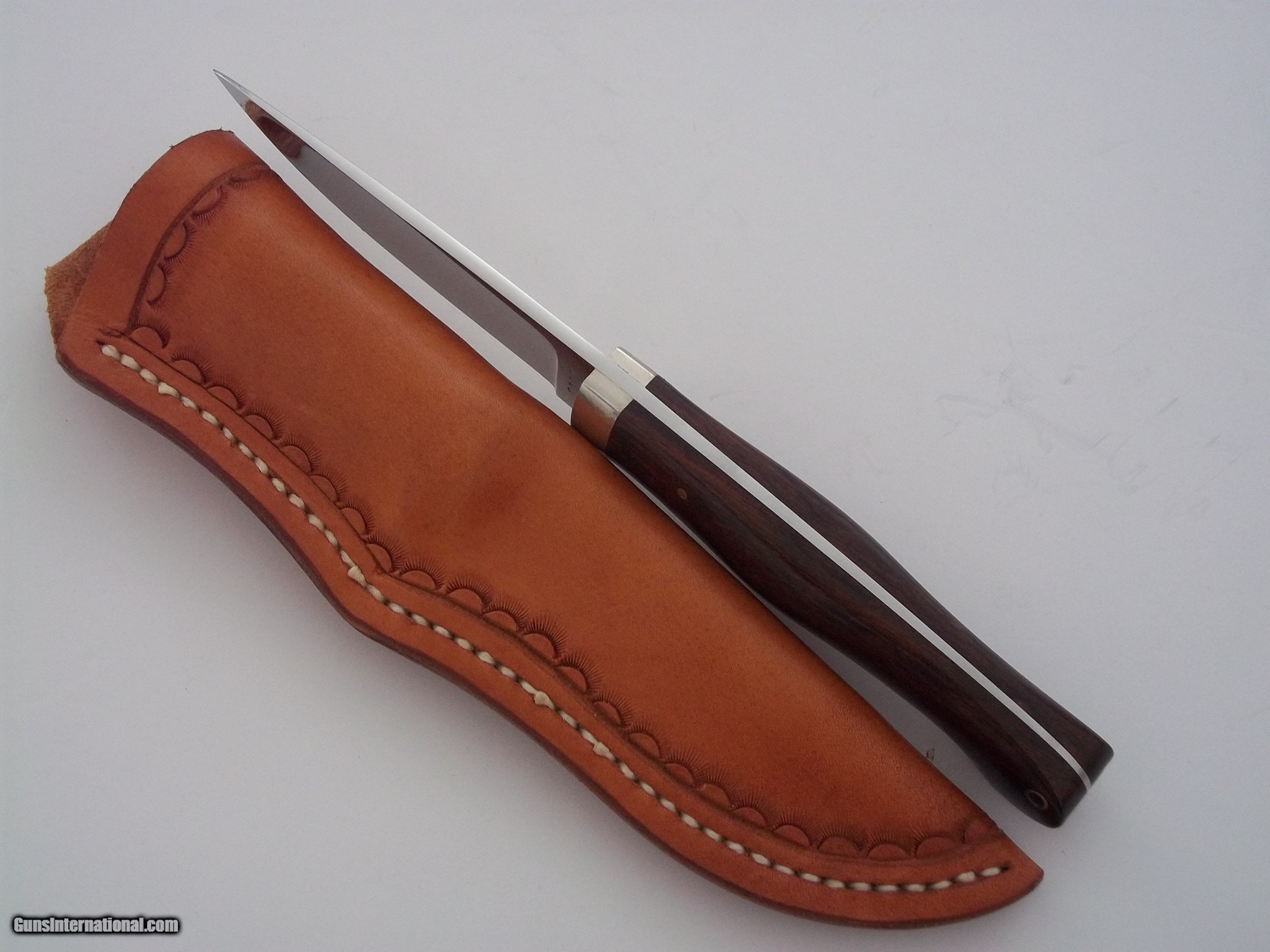 J .B. Moore spectacular and exceptional scarce type small utility/skinner with a 4" stainlesss steel blade, this is a full tang constructed model of the highest quality from a now retired knifemaker. German silver single guard and exotic wood handle with German silver pins, wrist thong. Original leather scabbard, this is knife # 1140. Based on a Bob Loveless design it is a gorgeous and flawless knife of the highest quality . See the companion to this model in another separate listing. Original leather scabbard. Free shipping USPS with tracking # and signature required. Sold "AS IS" and as a final sale.