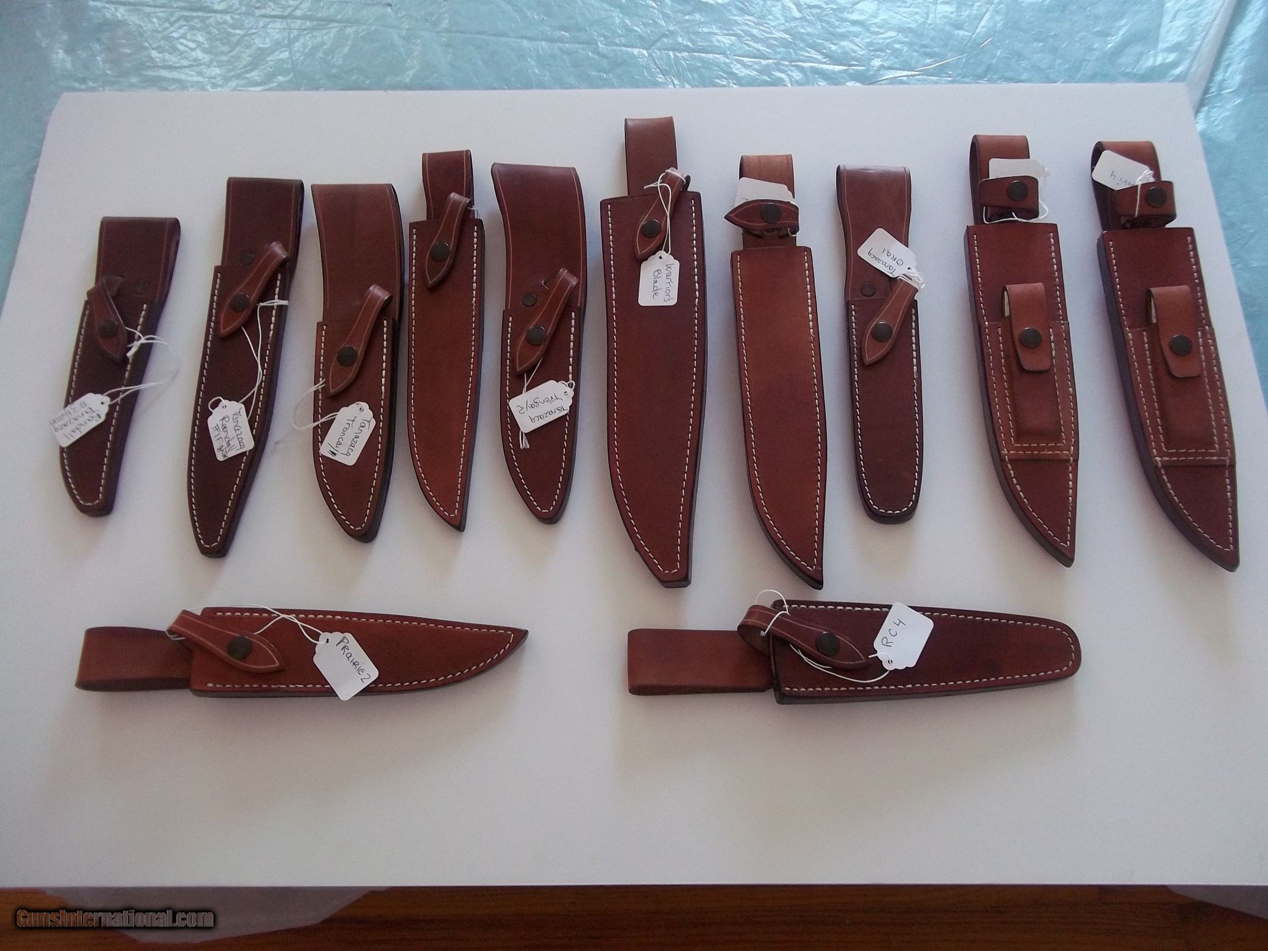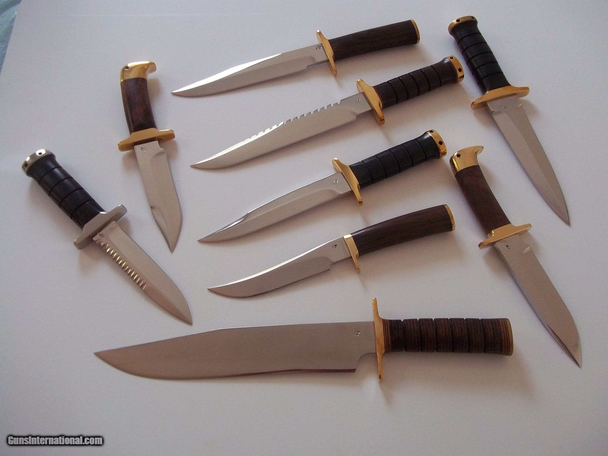 Jean Tanazacq knife colection: Includes diving, hunting,skinning,camp/survival/fighter,hunting dagger aka "Pig Sticker", "Warrior's Blade," survival knife Bavi 2,Tanazacq's interpretation of Randall Model # 1 with the extremely rare double logo/markings on blade ( Wild Boar head and France's map), Model # 3 (blades were heat-treated back in 1973 and "discovered " recently and completed) and Legionnaire dagger model. All knives in an absolute pristine,immacuclate, new, mint condition. All contained in very beautifully handcrafted leather scabbard. Each knife can be had separately. If truly interested feel free to send a message and I will quote you a firm price on the model (s) of your liking. Two knives can be seen listed separately. Free shipping (USPS with tracking #) in the Continental United States only. No foreign orders, no exception. There are a total of nine ( 8 ) knives being offered. Thank you for looking.