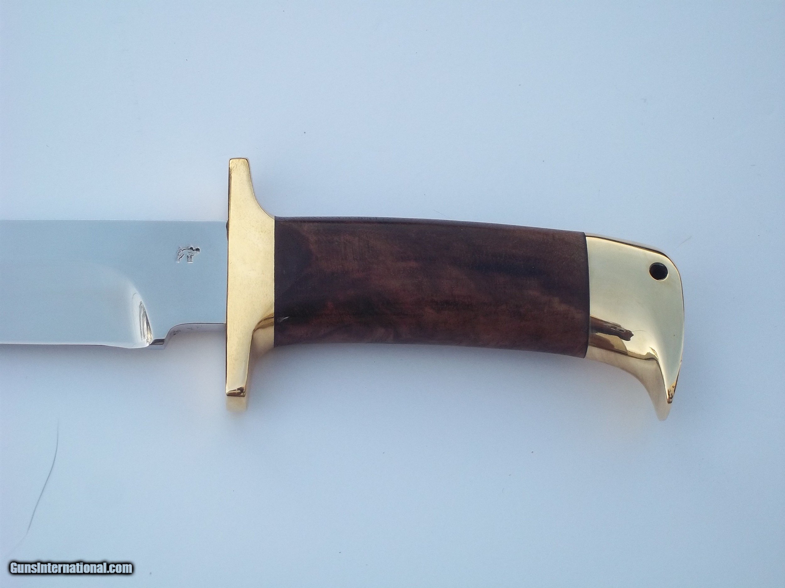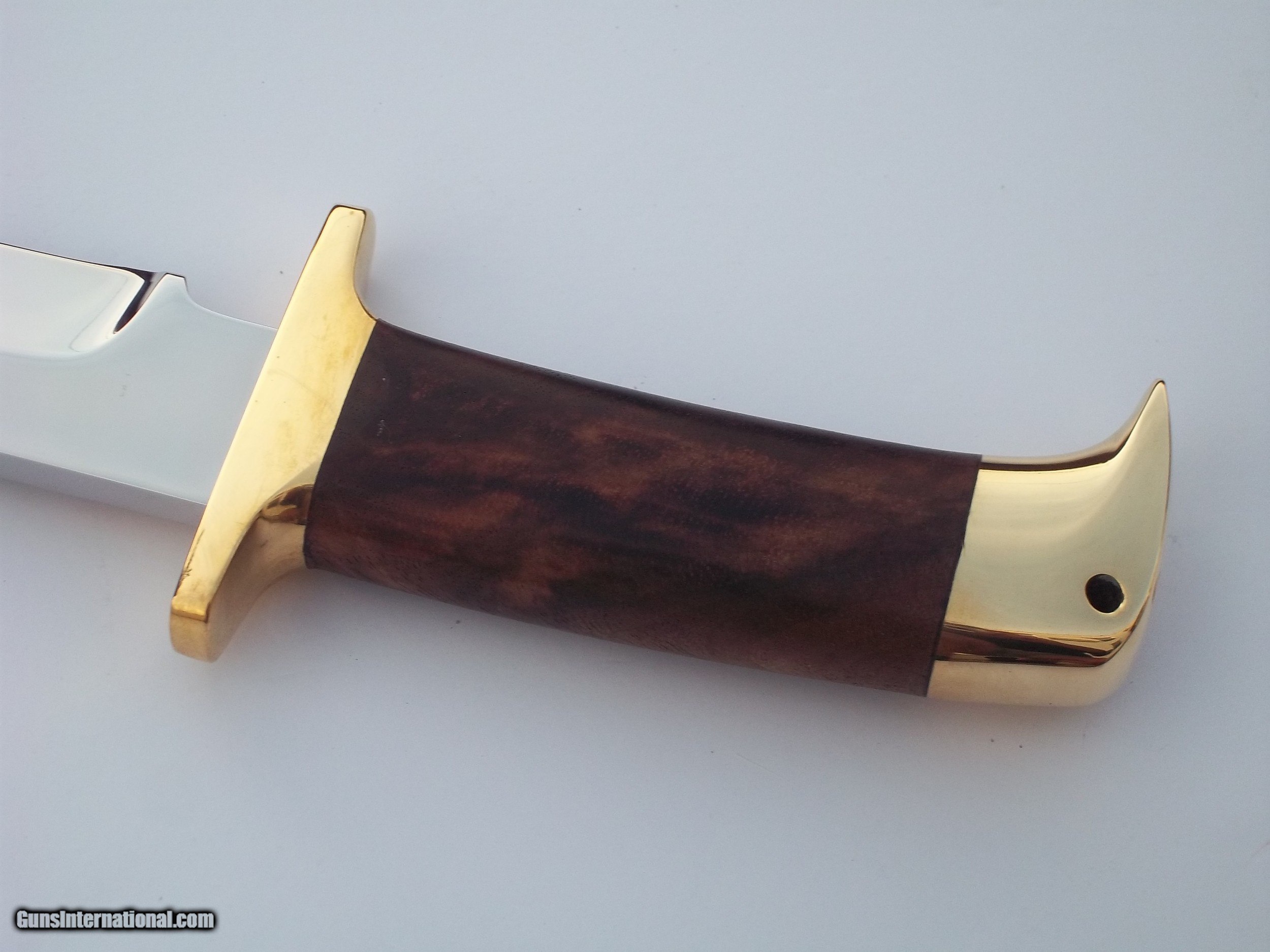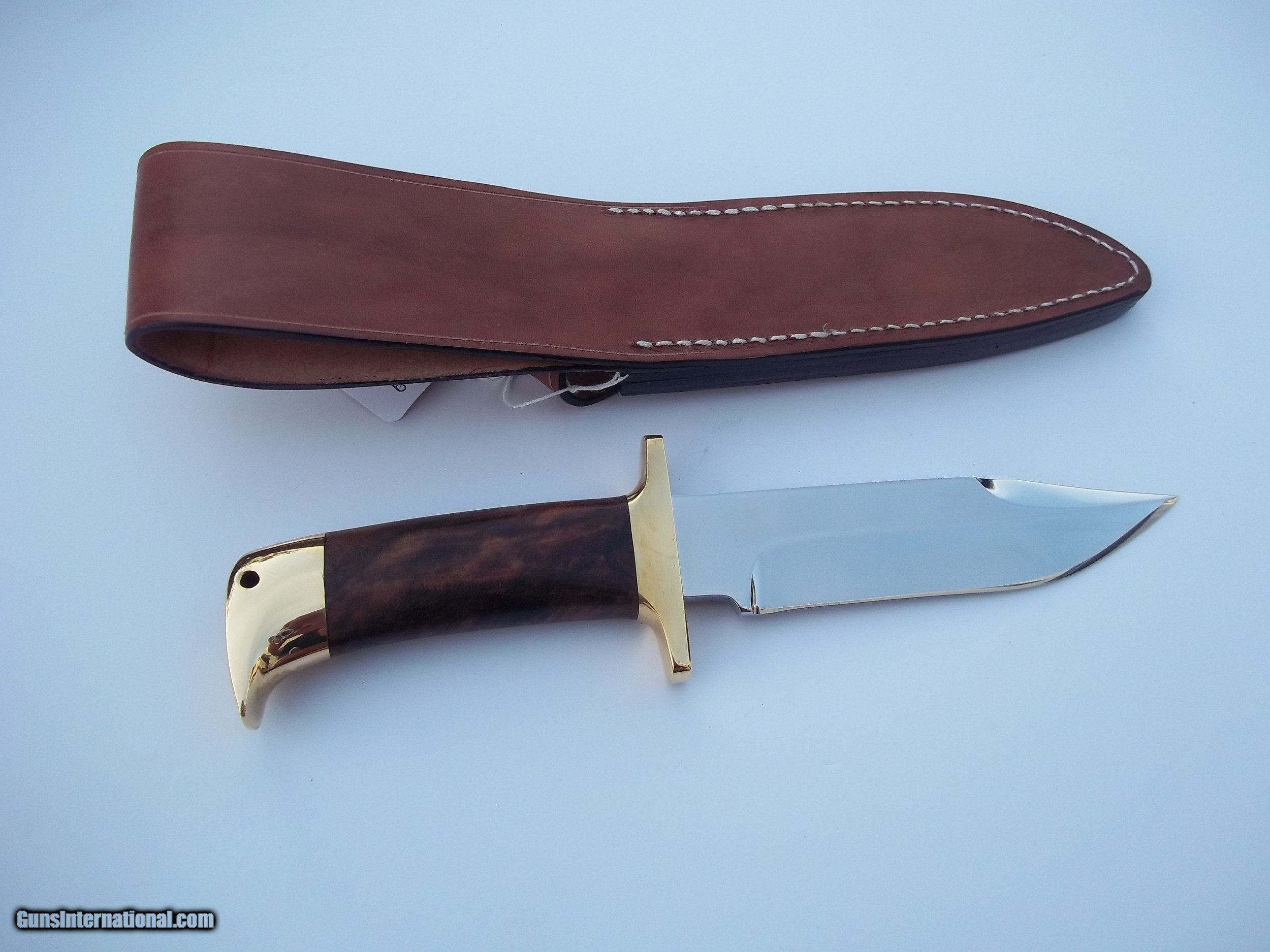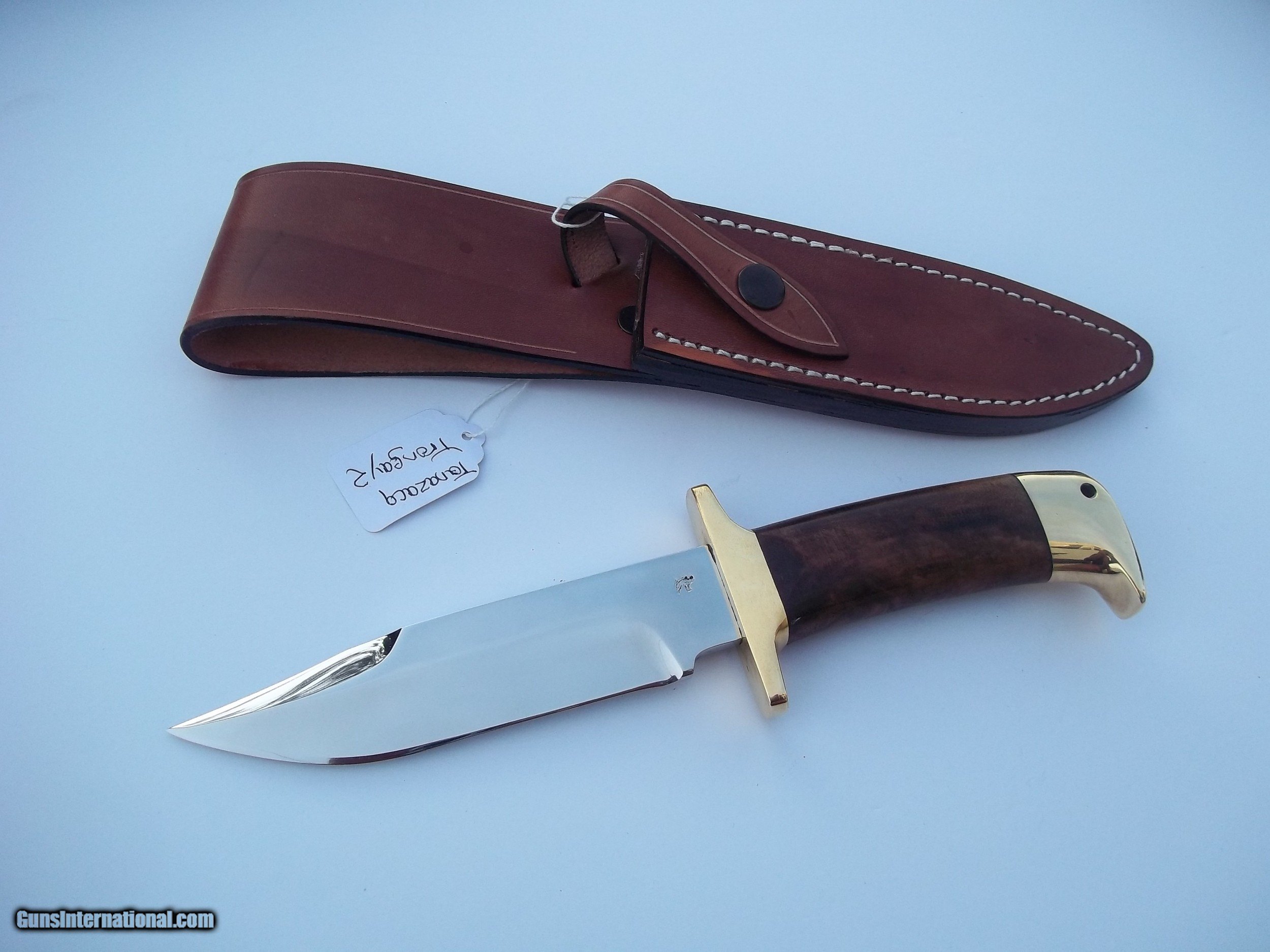 Jean Tanazacq TRONCAY 2 (Bowie type) differs from the TRONCAY 1 only in the shape at the point or tip which is convex as to present a clear path that opens an animal to the return. After the model TRONCAY 1, it is the most manufactured model as being known of universal use for hunting. Strong, well in hand, neither too long or too short, it can contribute to skin a small or big game. The TRONCAY 2 requires a little more fingering at the time of opening, thus avoiding to pierce the viscera because of its engaging trajectory. With the same characteristics as seen on the model TRONCAY 1, it possesses the famous curved counter-cutting or false edge which is concave in its final shape, immortalized by Jim Bowie, more penetrating but more fragile than the lanceolate point as seen on the TRONCAY 1. All the knives from the Troncay's family have a hidden tang, the same gorgeous walnut handle shape which is slightly curved, a solid brass guard and brass butt cap. May 3, 2019 production.