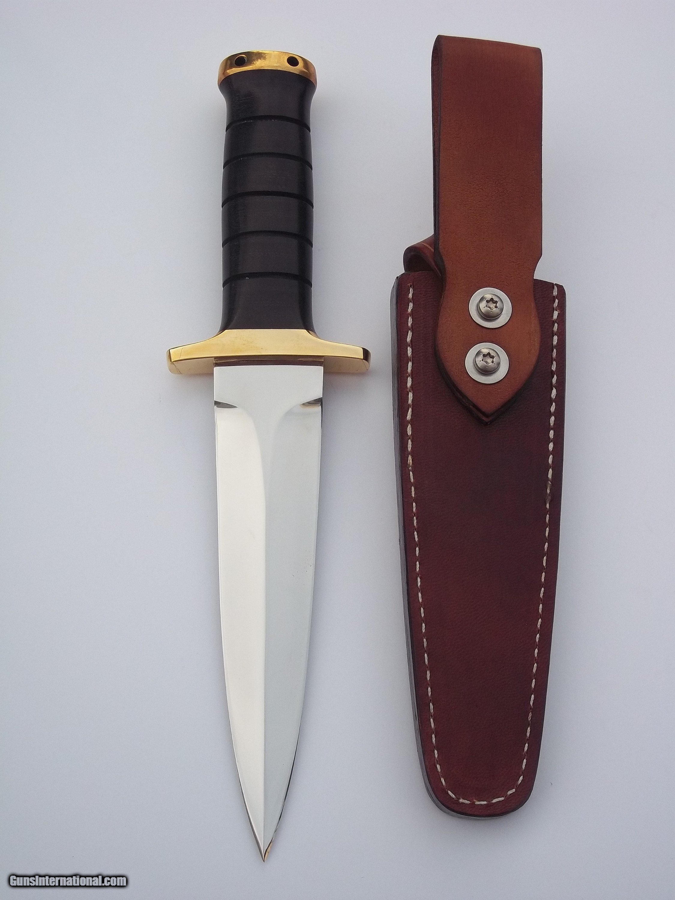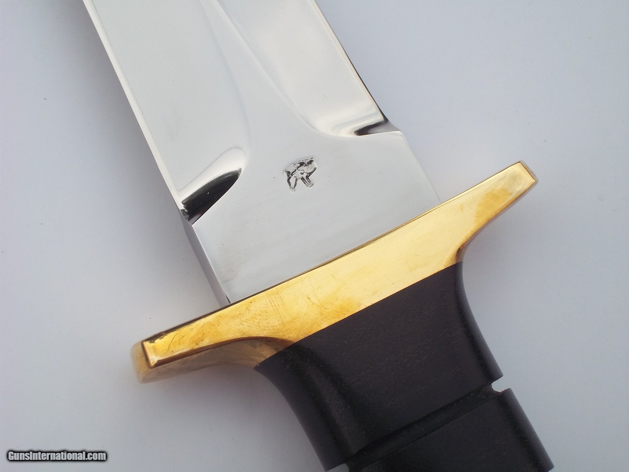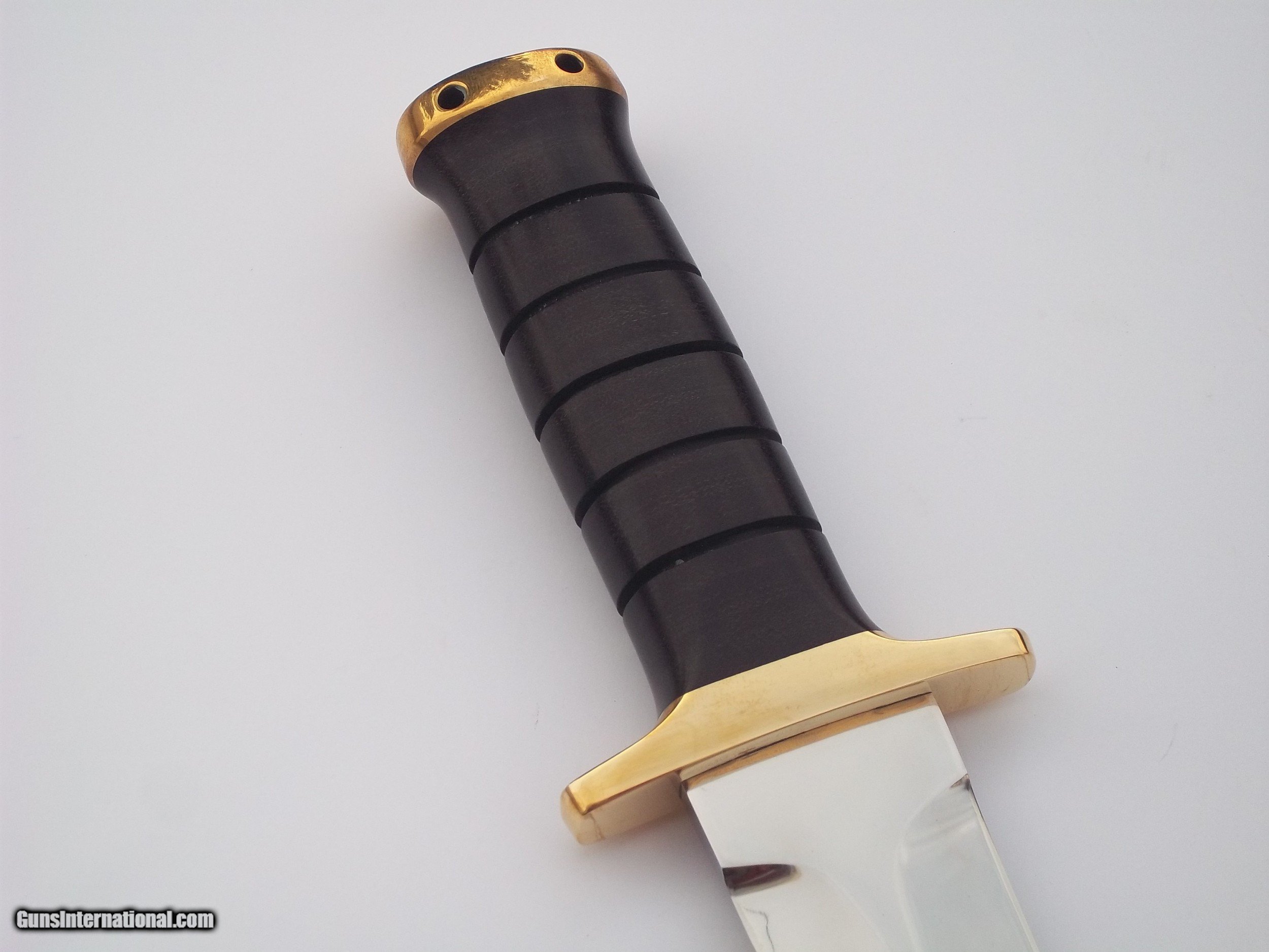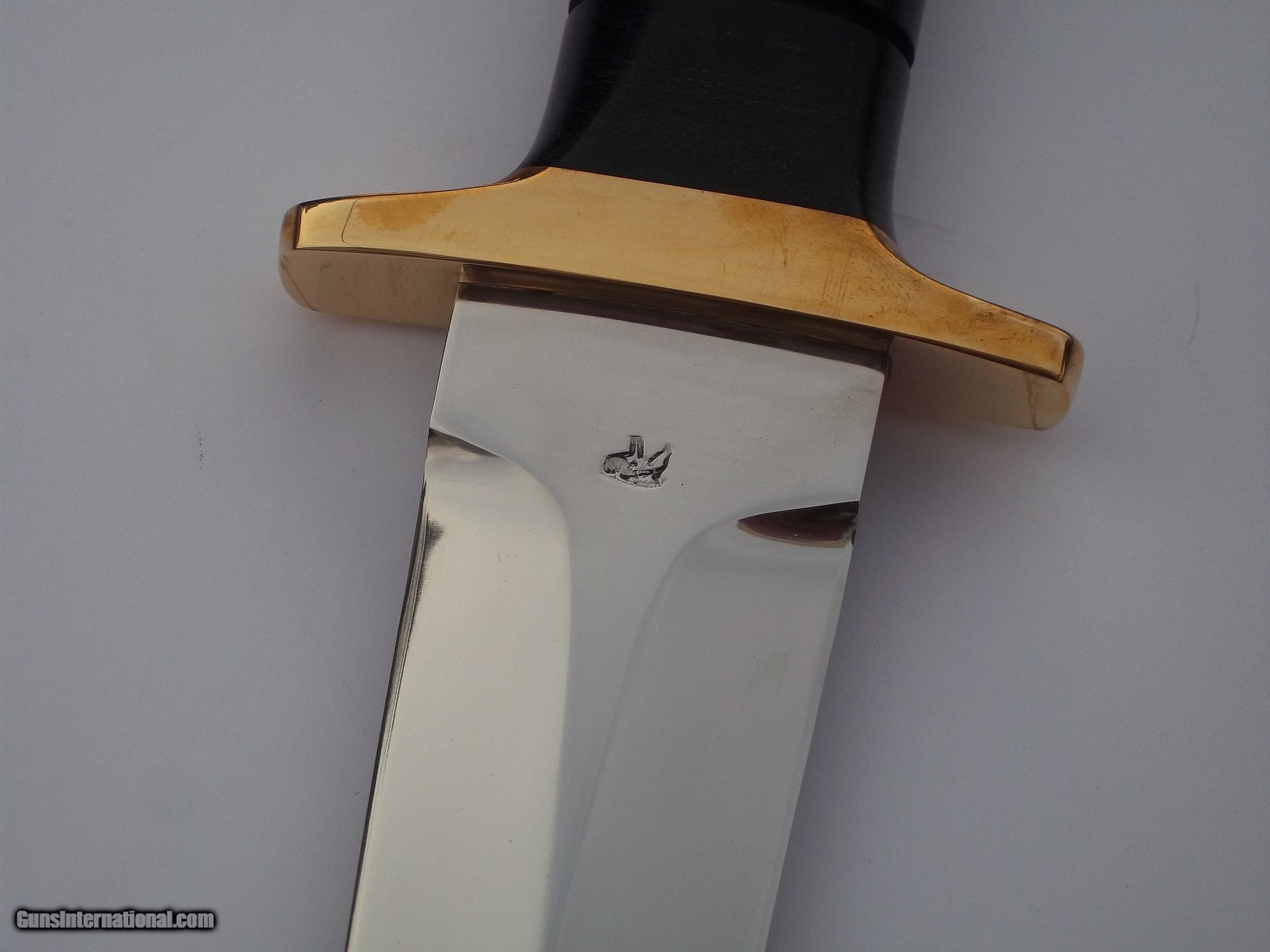 Description: Model RC4 Originally designed in conjunction with a Legionnaire who had expressed his desire in wanting a very powerful dagger to be made, for which he had sent a sketch to the maker, and after confrontation of many mixed ideas, Tanazacq came up with a definitive pattern. Incidentally, this legionnaire never took possession of his order and Jean adopted such piece by giving it the name of Colonial Route No.4, that of Cao Bang-Langson,(Indo-China conflict). However, it can serves as well as a mighty hunting dagger created solely for big game bow hunters, some of which had asked Tanazacq for a blade that will be capable of going to search for their arrows deeply embedded in a tree branch, stump, or even in its trunk. When ordered for such purposes, the tip of the blade is reinforced and delivered as such. Made only from D2 steel stock, its blade is 7" by a bit more than 5/16" stock ( 175/180mm pour 7mm epaisseur de la lame), guard and butt cap made from brass, handle made from thick layers of black micarta ( 100 EUROS extra). The main purpose of this blade is first to finish off an animal and skin it if necessary, (deer, wild boars, big game etc) with a proven design that is both strong and sturdy. The model RC4 is Tanazacq's most expensive knife.
