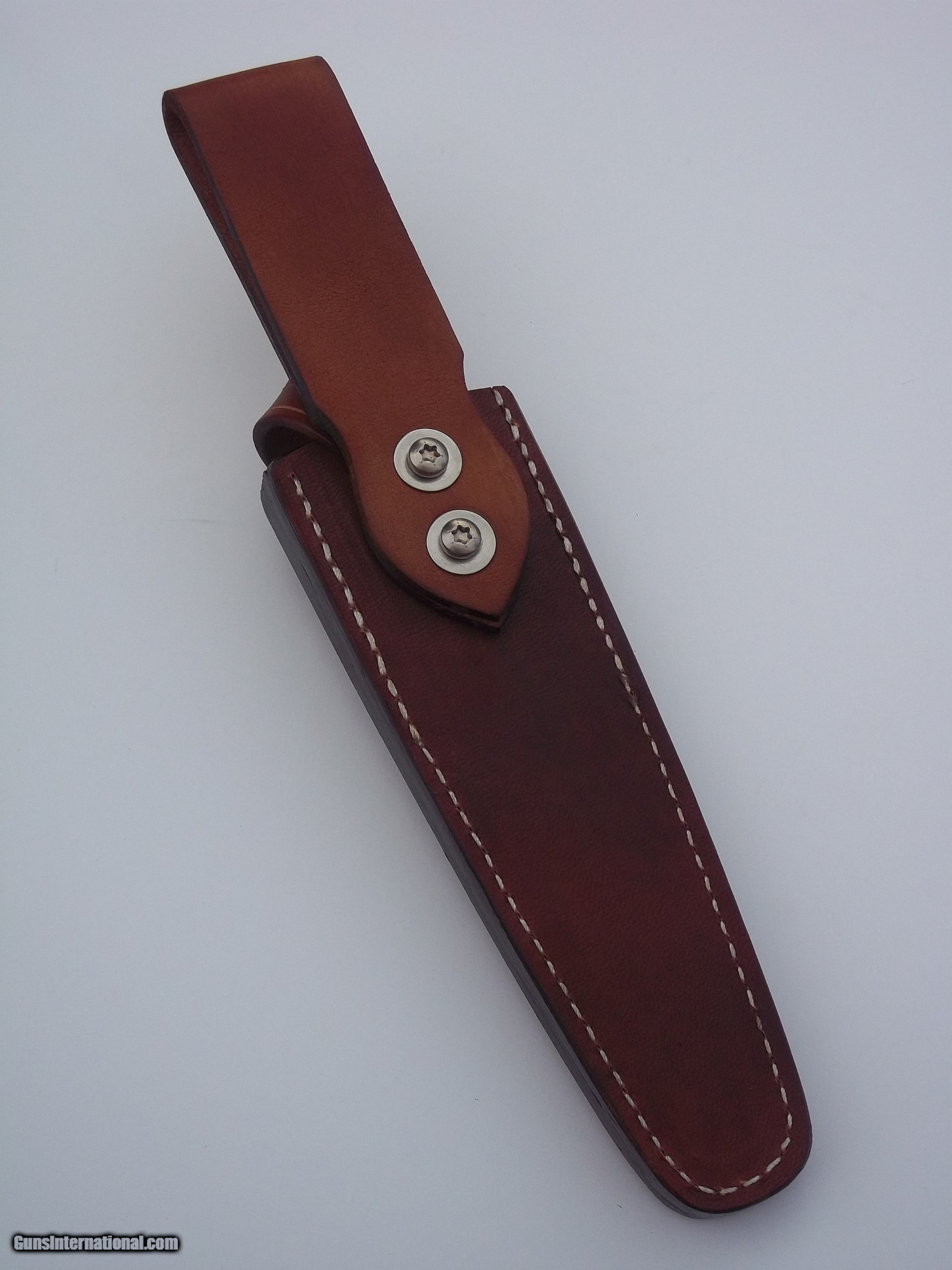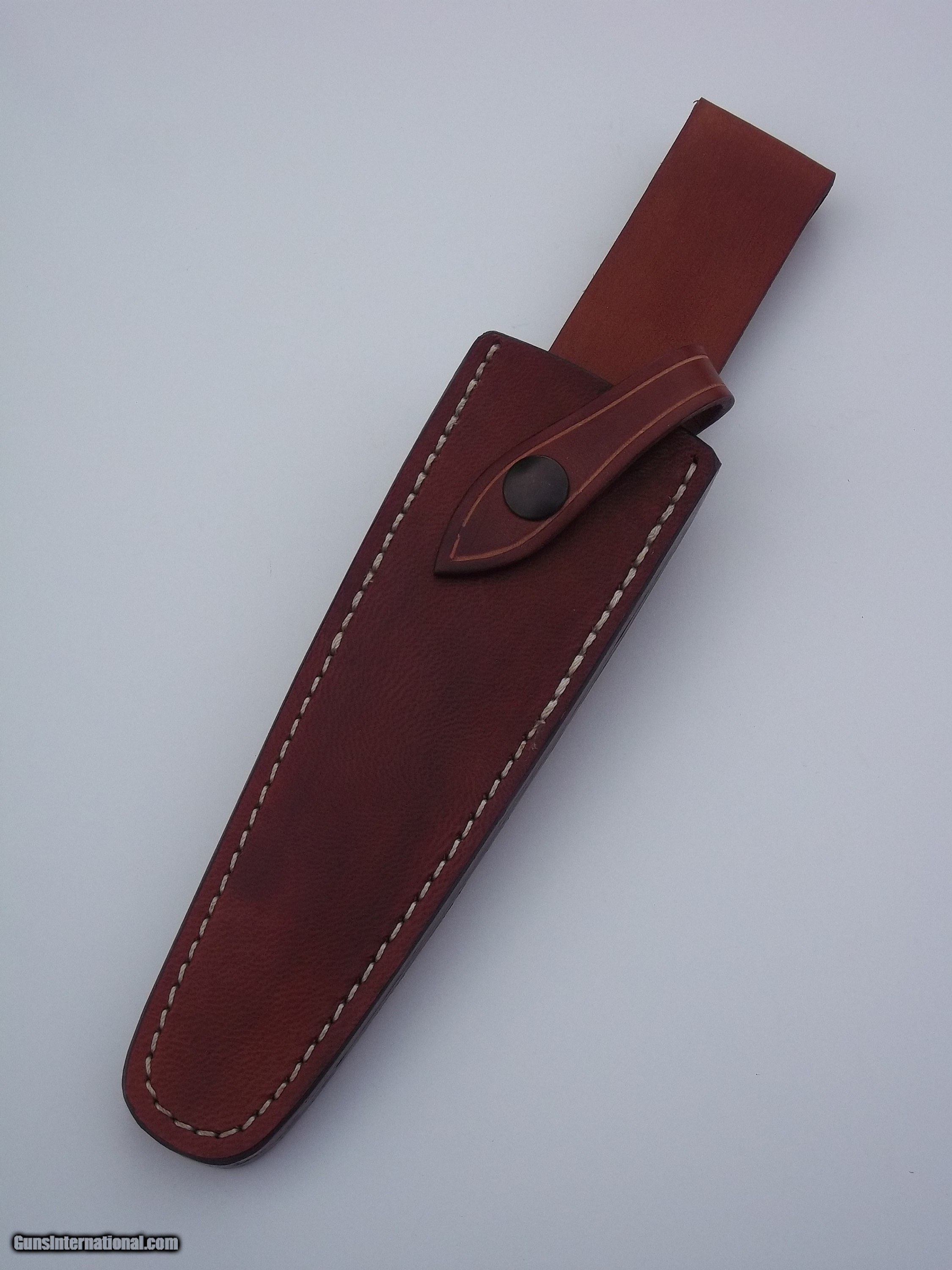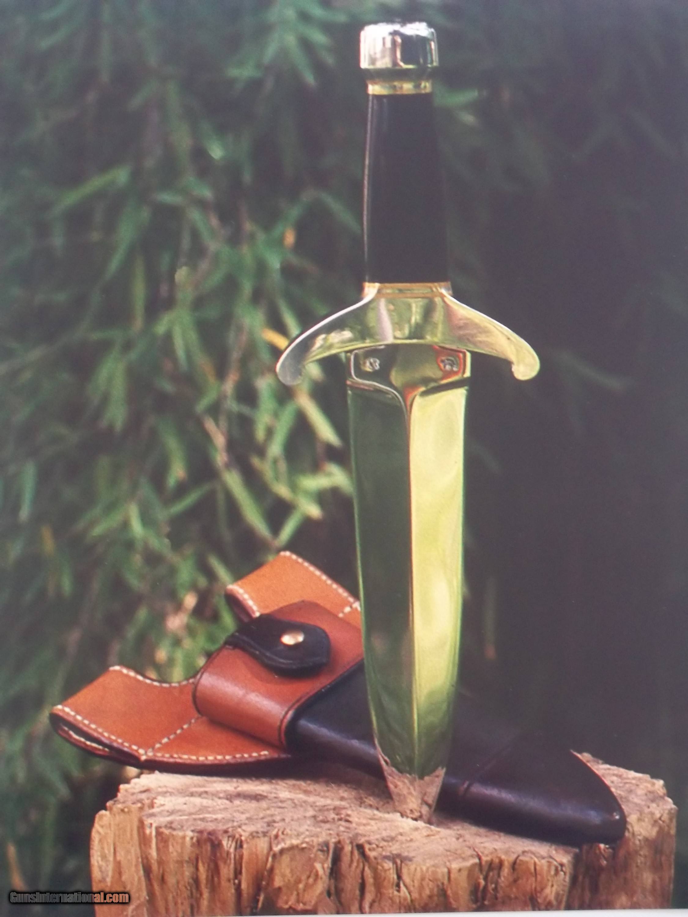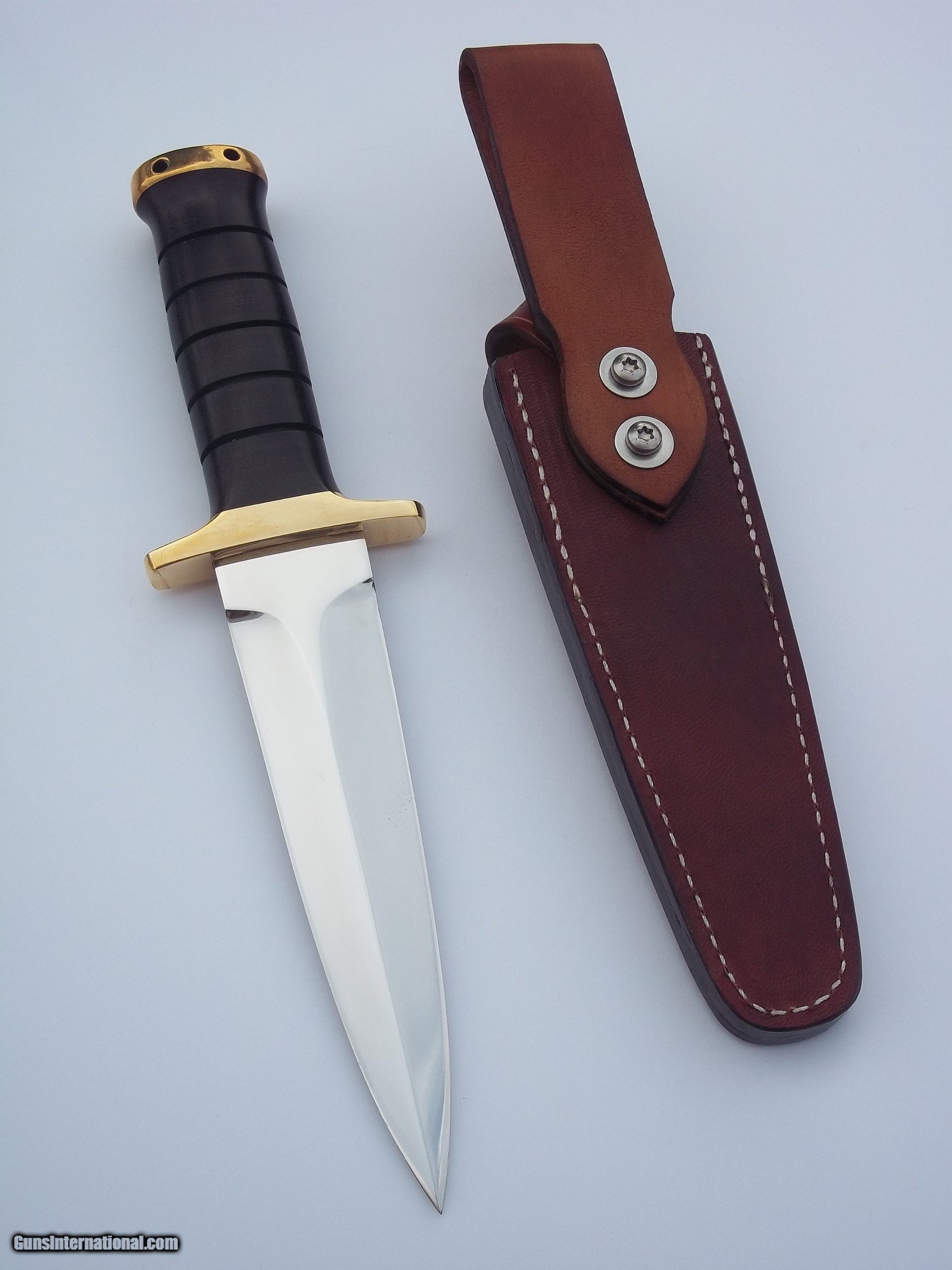 Description: Model RC4 Originally designed in conjunction with a Legionnaire who had expressed his desire in wanting a very powerful dagger to be made, for which he had sent a sketch to the maker, and after confrontation of many mixed ideas, Tanazacq came up with a definitive pattern. Incidentally, this legionnaire never took possession of his order and Jean adopted such piece by giving it the name of Colonial Route No.4, that of Cao Bang-Langson,(Indo-China conflict). However, it can serves as well as a mighty hunting dagger created solely for big game bow hunters, some of which had asked Tanazacq for a blade that will be capable of going to search for their arrows deeply embedded in a tree branch, stump, or even in its trunk. When ordered for such purposes, the tip of the blade is reinforced and delivered as such. Made only from D2 steel stock, its blade is 7" by a bit more than 5/16" stock ( 175/180mm pour 7mm epaisseur de la lame), guard and butt cap made from brass, handle made from thick layers of black micarta ( 100 EUROS extra). The main purpose of this blade is first to finish off an animal and skin it if necessary, (deer, wild boars, big game etc) with a proven design that is both strong and sturdy. The model RC4 is Tanazacq's most expensive knife.