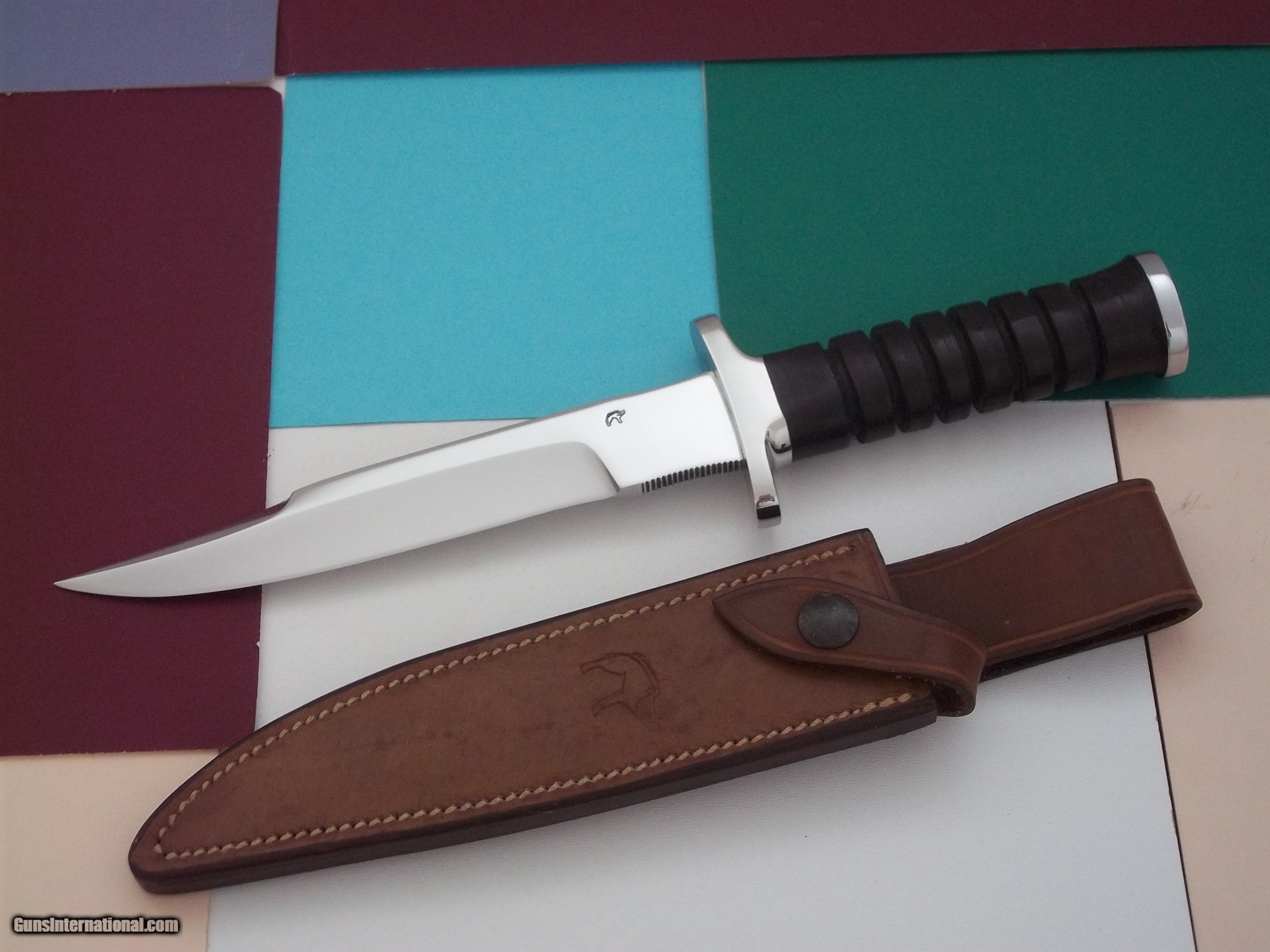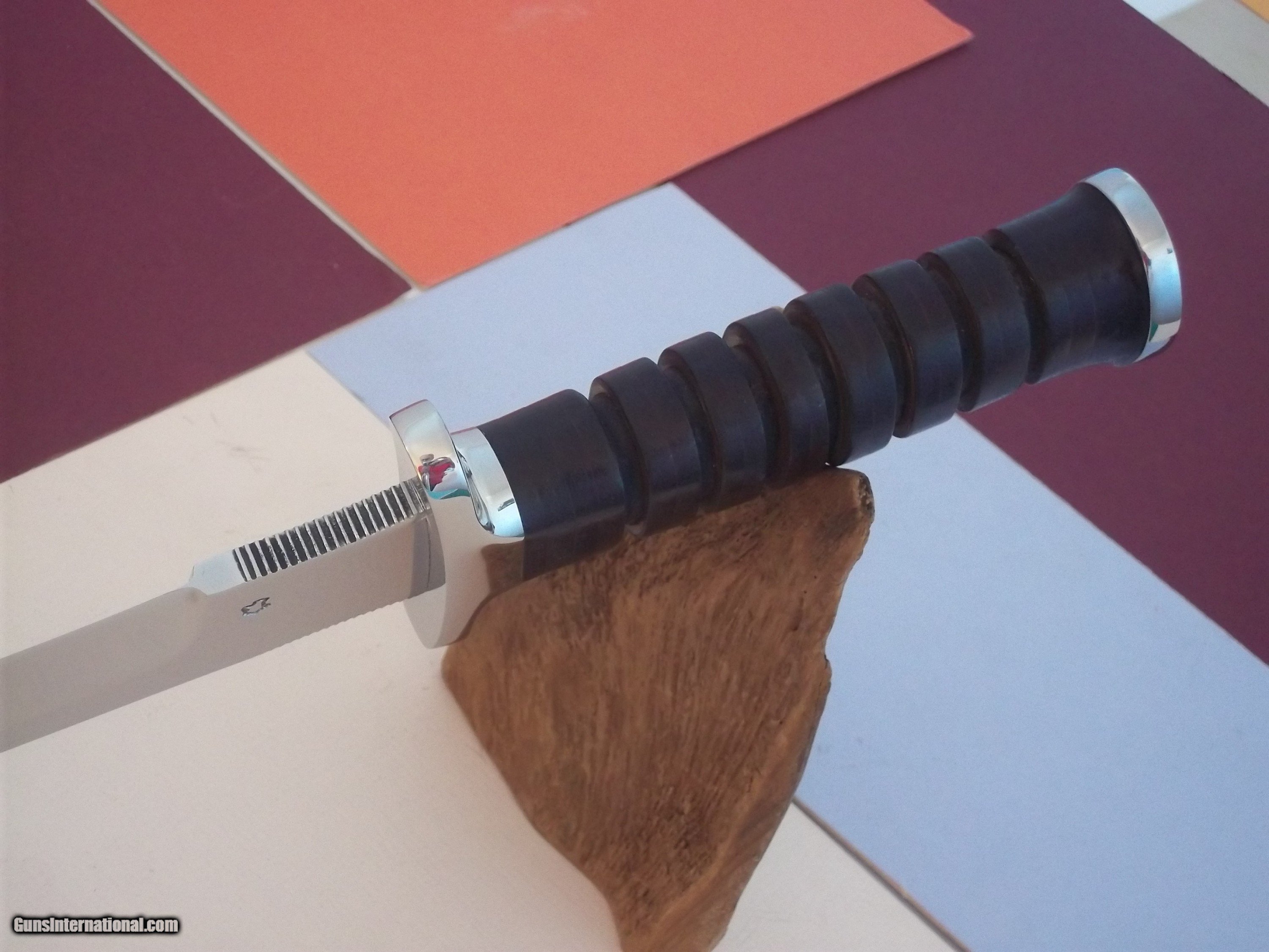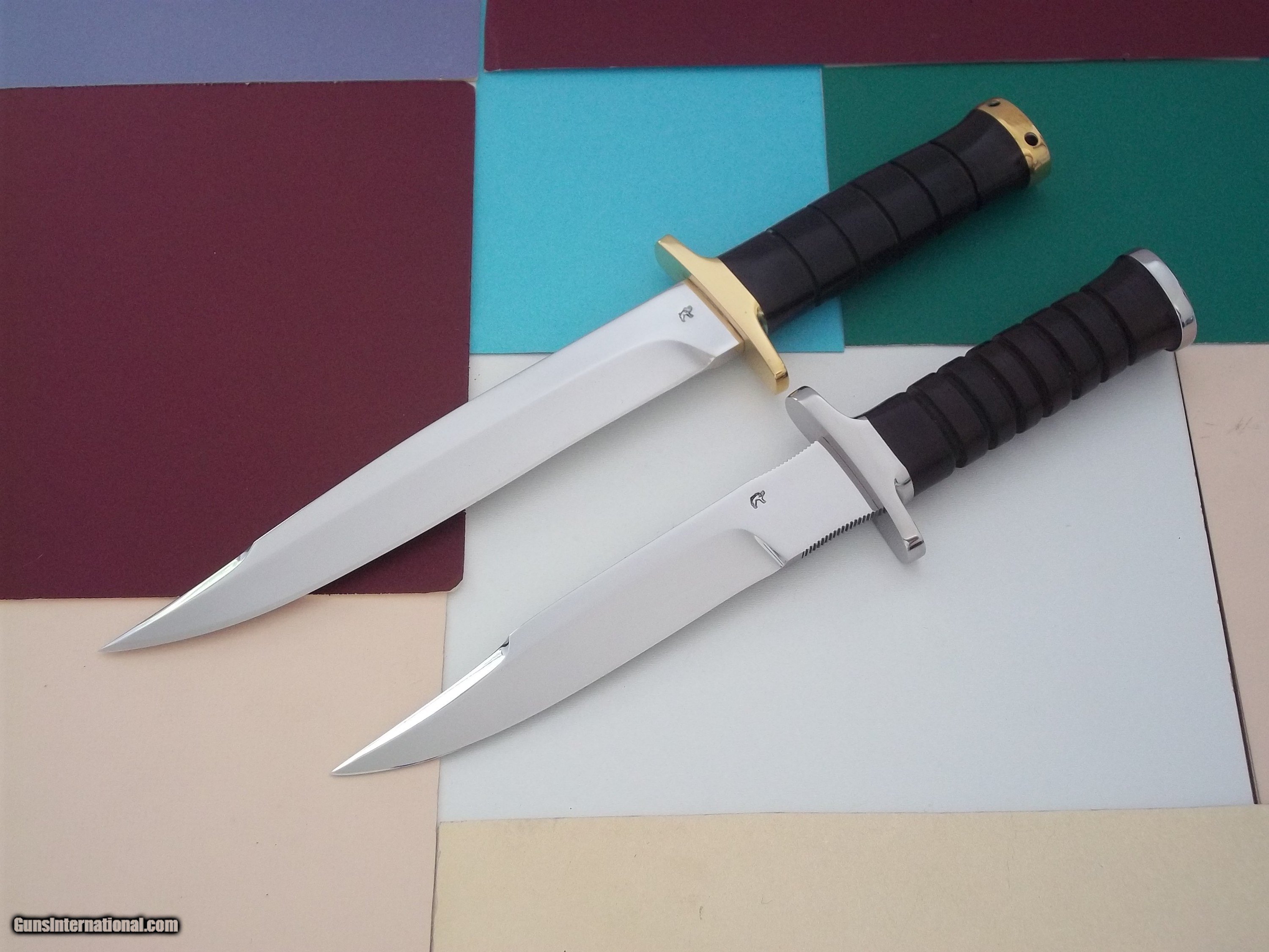 Description: PRAIRIE I ( March 17,1988) PRAIRIE 2 (June 22,1986) Jean Tanazacq is one of the most illustrious French cutlery artisans. His productions all exude a very strong personality, superb ergonomics, and they are closer to a piece of art than a knife. This model comes in two blade lengths 8-5/8" for the PRAIRIE 1 and 7-1/8" for its companion. Both knives are constructed and made from 1/4 " 440C steel stock, reinforced tip with a mirror polished blade. The solid brass pommel has two opening to tie up security laces, while both knives comes with a double brass guard for hand protection., rare thumb notches on top and bottom of balde on one model. Extra heavy-duty leather scabbard of the highest quality,( very few US makers offers such constructed leather scabbards today, that are very thick in their final manufacture, if not none). Buyer pays shipping USPS with tracking # U.S.A. only. Can be had separately if desired... Superb set of two hunting knives Jean TANAZACQ model Prairie 1 & 2. Like new, chocolate leather cases.The knives and scabbard was made by Jean Tanazacq in the Ardennes in 1988. Both blades are stamped with the wild boar emblem of the Ardennes , one with map of France. No trade. Knives # 38-39/40. SOLD |
