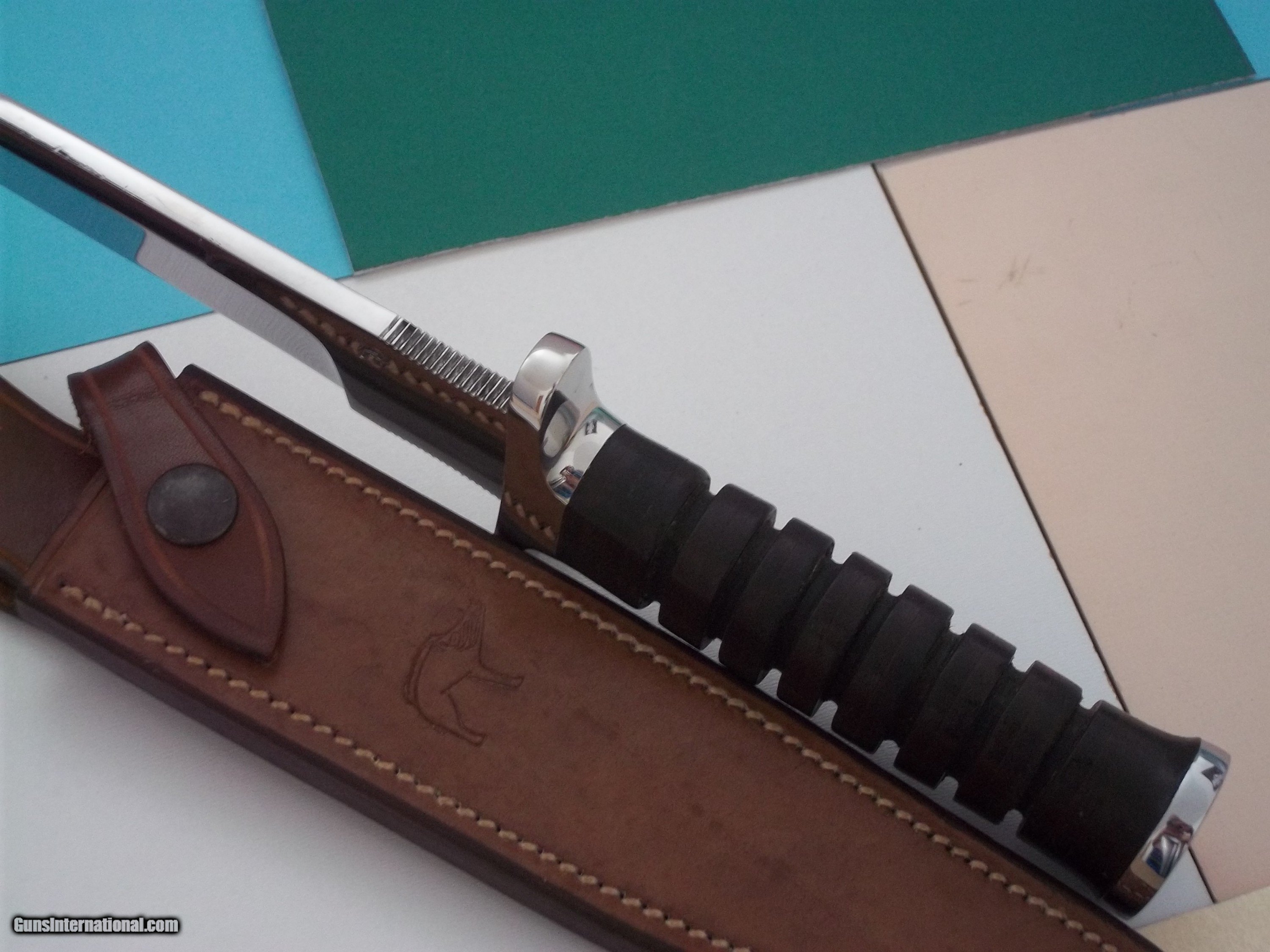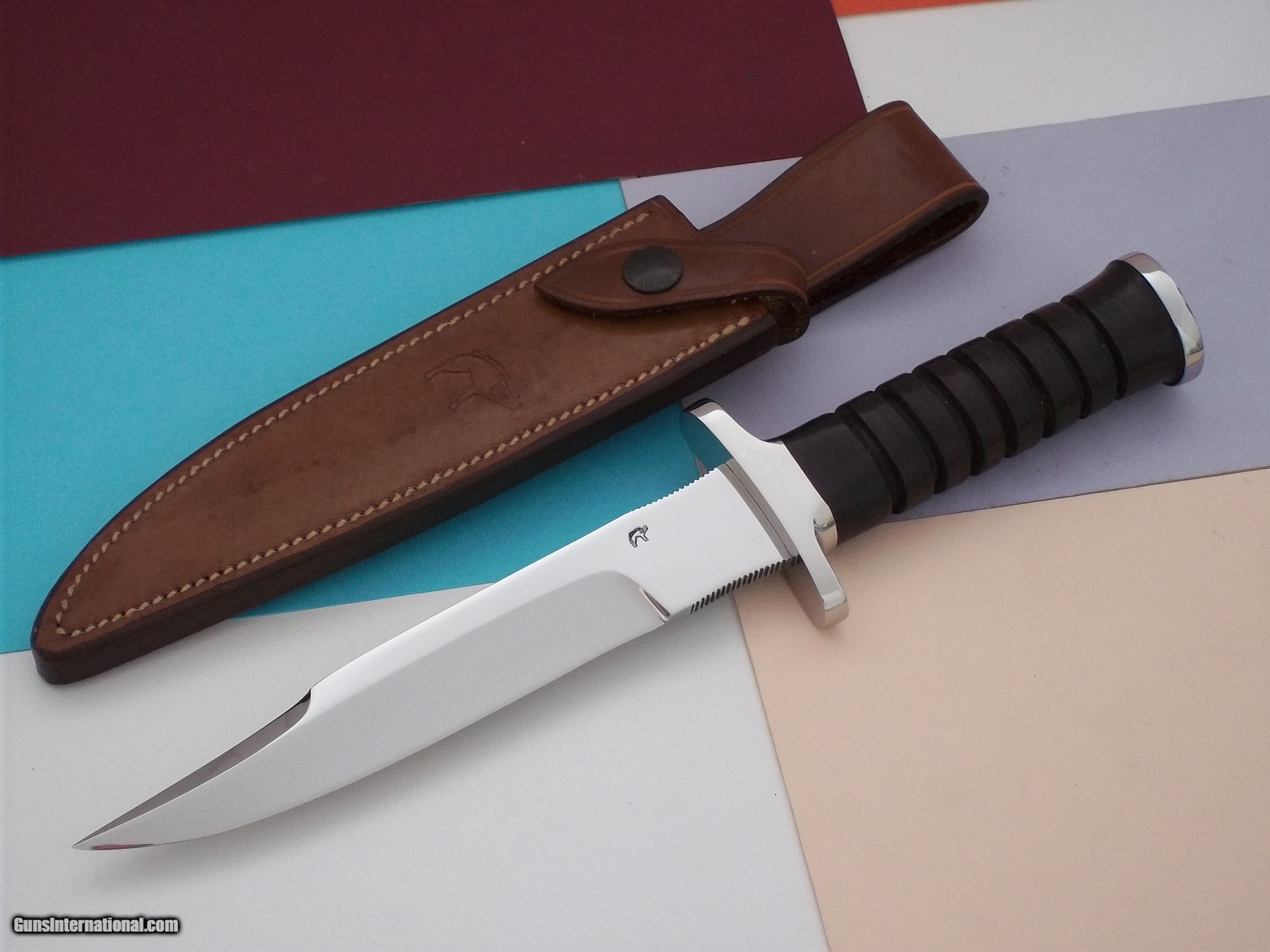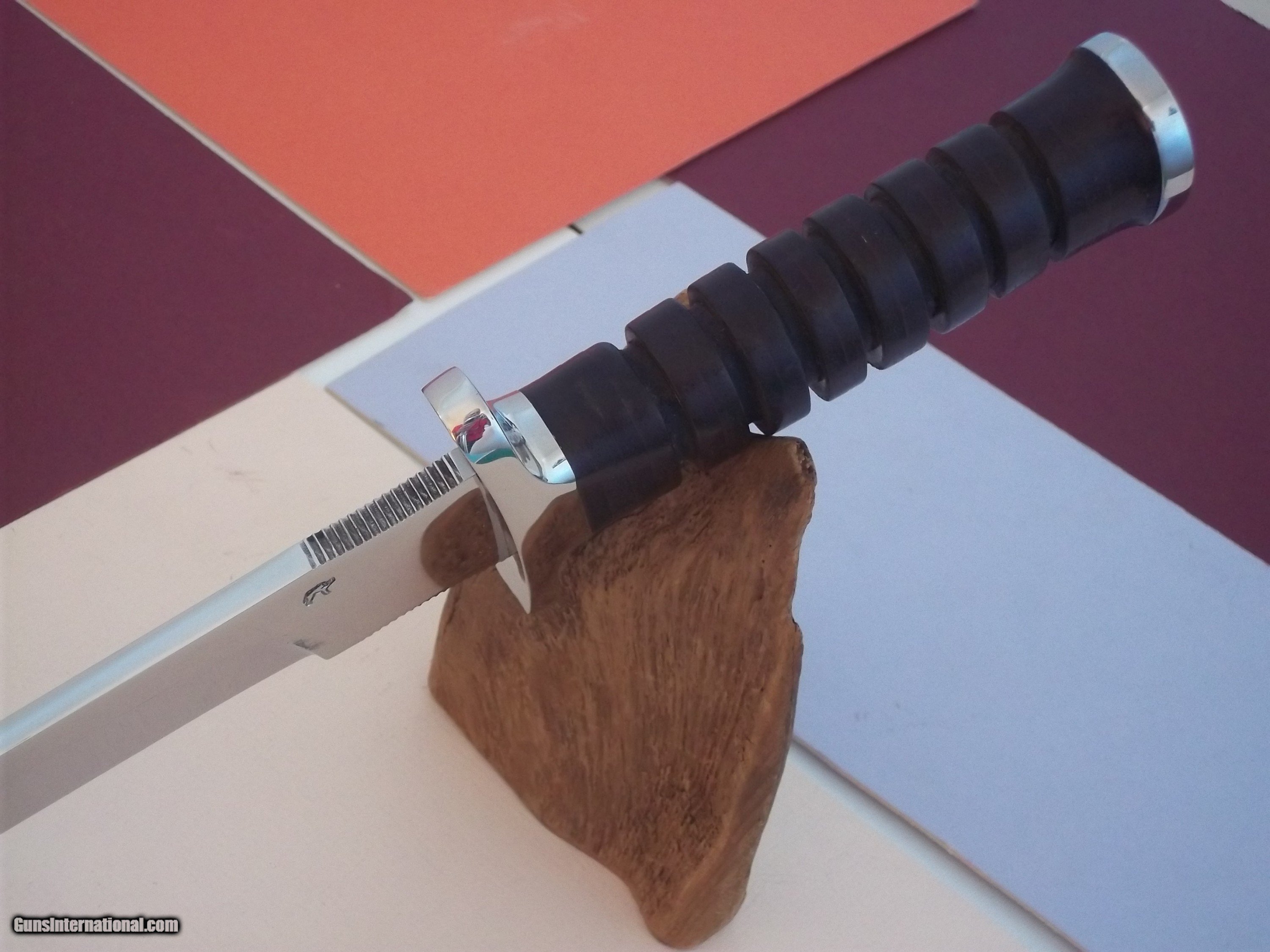 Description: PRAIRIE I ( March 17,1988) PRAIRIE 2 (June 22,1986) Jean Tanazacq is one of the most illustrious French cutlery artisans. His productions all exude a very strong personality, superb ergonomics, and they are closer to a piece of art than a knife. This model comes in two blade lengths 8-5/8" for the PRAIRIE 1 and 7-1/8" for its companion. Both knives are constructed and made from 1/4 " 440C steel stock, reinforced tip with a mirror polished blade. The solid brass pommel has two opening to tie up security laces, while both knives comes with a double brass guard for hand protection., rare thumb notches on top and bottom of balde on one model. Extra heavy-duty leather scabbard of the highest quality,( very few US makers offers such constructed leather scabbards today, that are very thick in their final manufacture, if not none). Buyer pays shipping USPS with tracking # U.S.A. only. Can be had separately if desired... Superb set of two hunting knives Jean TANAZACQ model Prairie 1 & 2. Like new, chocolate leather cases.The knives and scabbard was made by Jean Tanazacq in the Ardennes in 1988. Both blades are stamped with the wild boar emblem of the Ardennes , one with map of France. No trade. Knives # 38-39/40. SOLD |