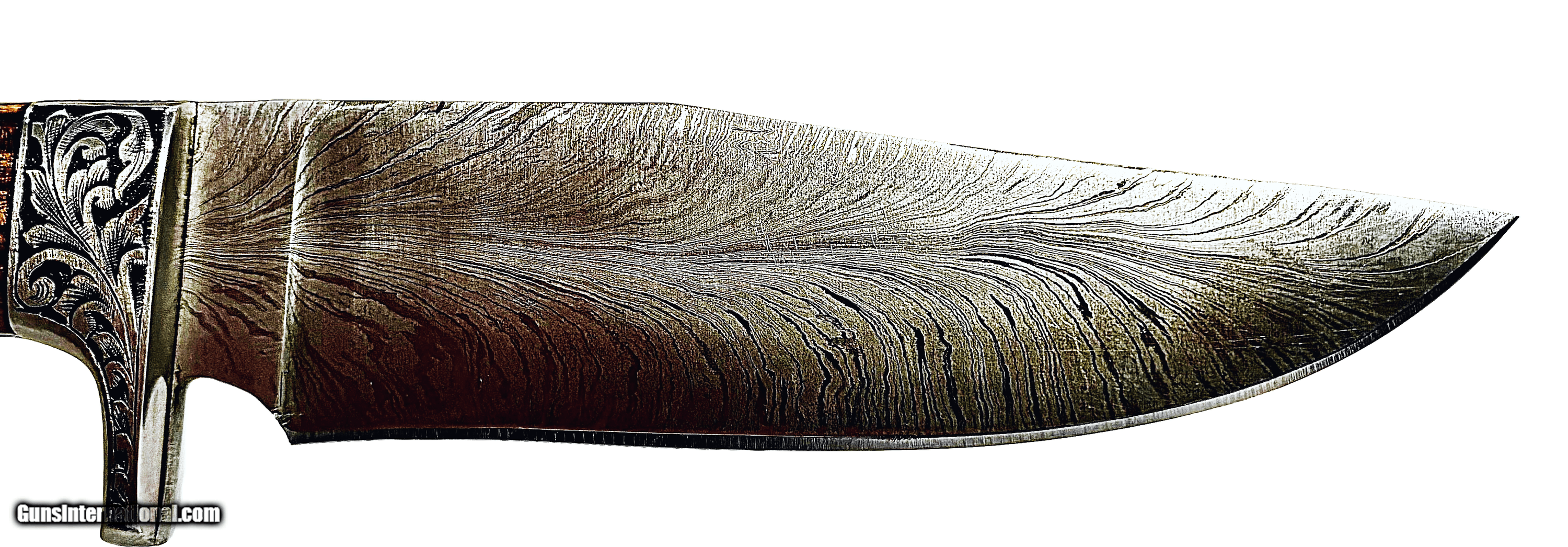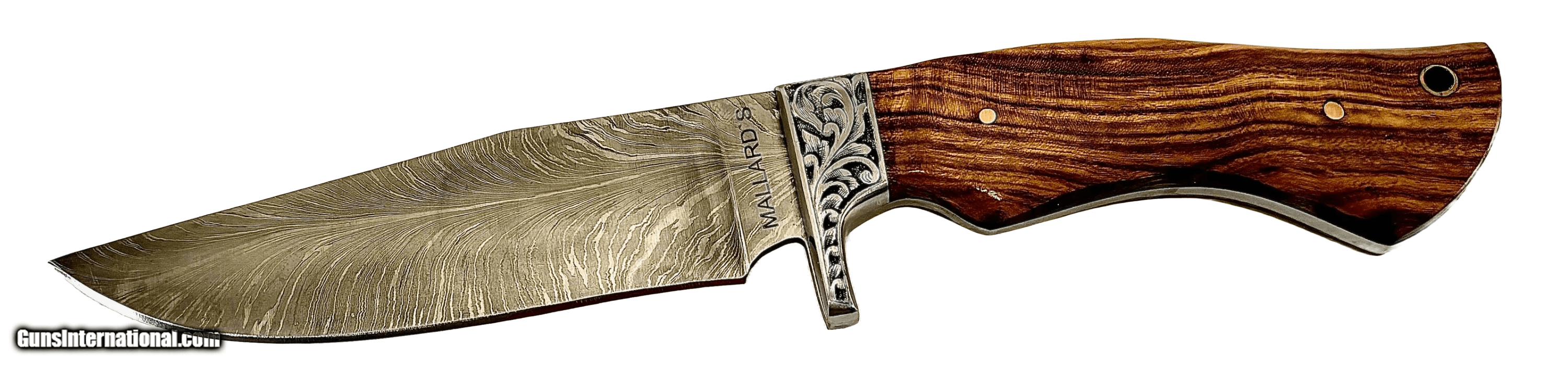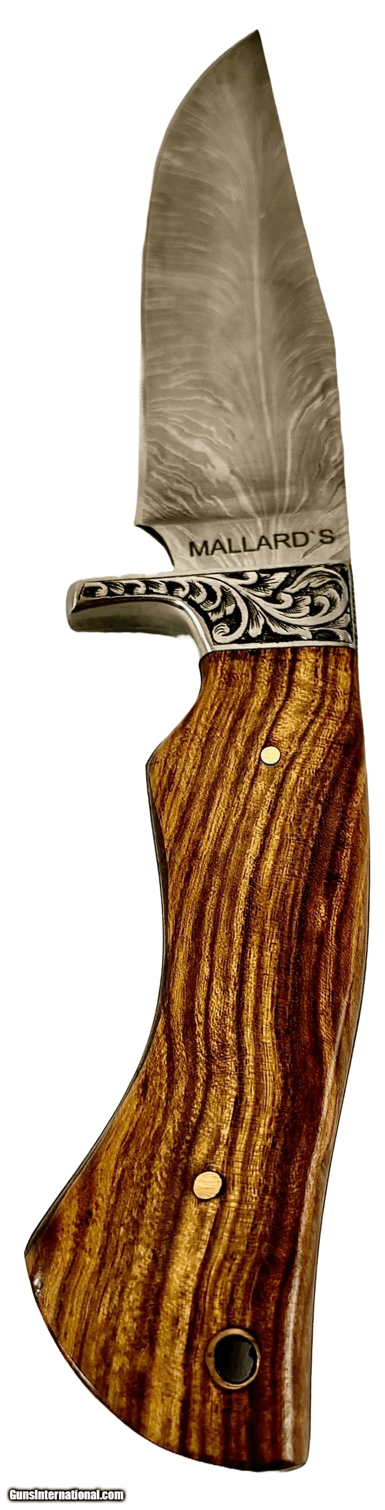 Description: MALLARDS SHOOTING SUPPLY AND APPAREL, FIXED BLADE HUNTING KNIFE COMMISSIONED BY ONE OF THE WORLD'S TOP KNIFE MAKERS EXCLUSIVE DUCK FEATHER DAMASCUS BLADE WITH HIGHLY FIGURED GUN STOCK WALNUT SCALES, HAND ENGRAVED BOLSTER IN AN ELEGANT DEEP RELIEF GUN STYLE SCROLL ENGRAVING PATTERN. TRULY A ONE OF A KIND KNIFE. THE KNIFE INCLUDES A HANDMADE LEATHER SHEATH SOLD |
