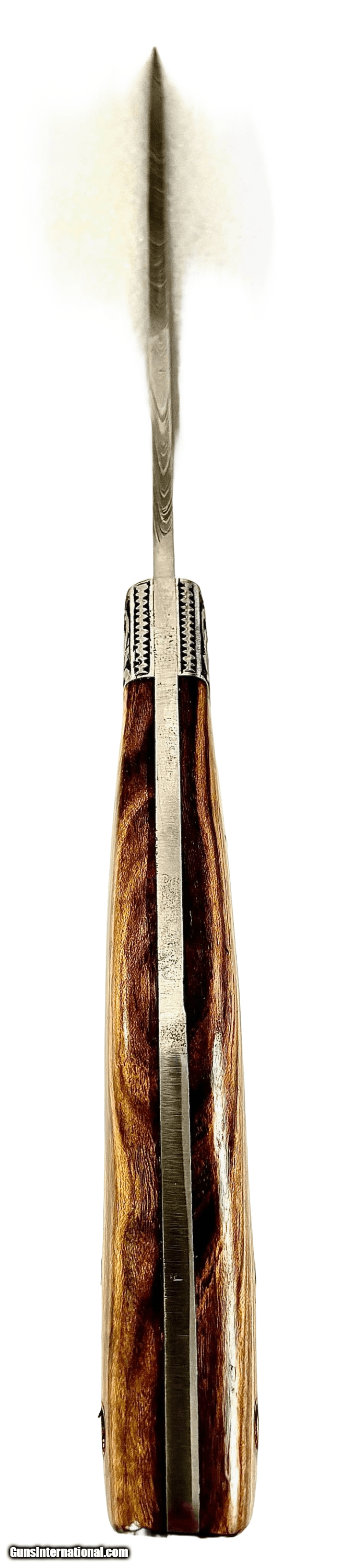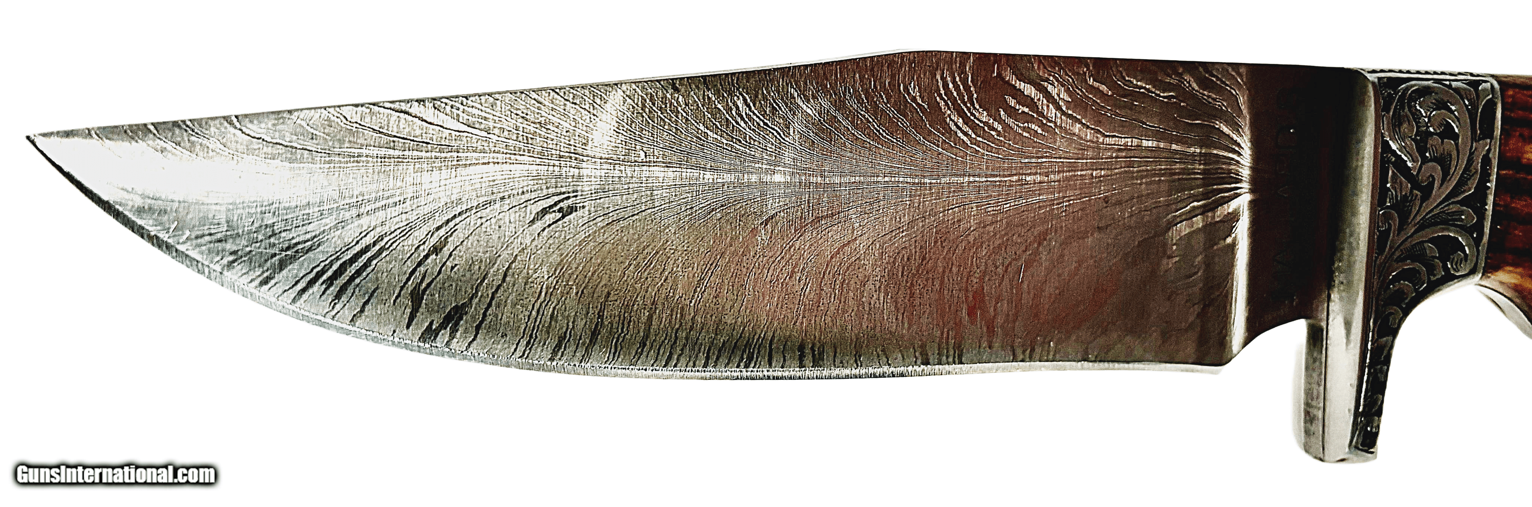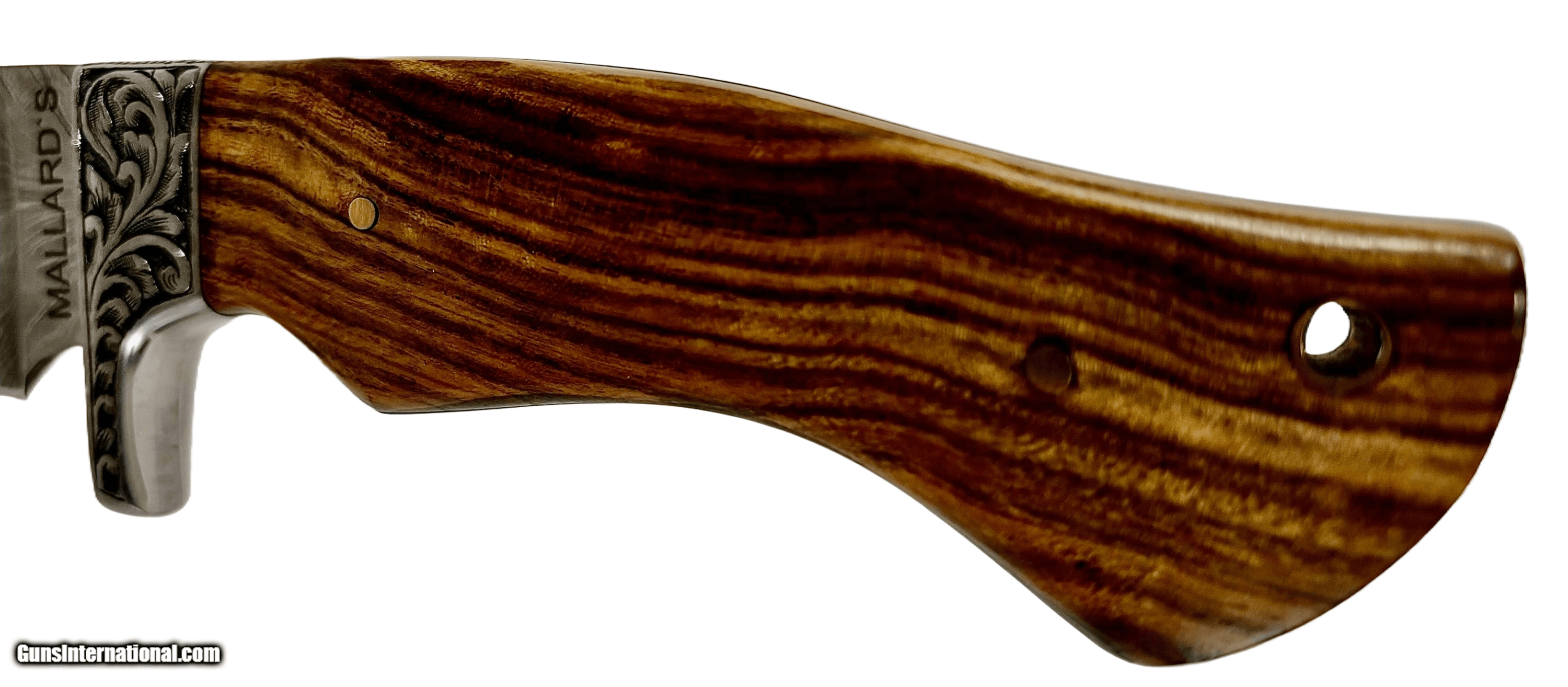 Description: MALLARDS SHOOTING SUPPLY AND APPAREL, FIXED BLADE HUNTING KNIFE COMMISSIONED BY ONE OF THE WORLD'S TOP KNIFE MAKERS EXCLUSIVE DUCK FEATHER DAMASCUS BLADE WITH HIGHLY FIGURED GUN STOCK WALNUT SCALES, HAND ENGRAVED BOLSTER IN AN ELEGANT DEEP RELIEF GUN STYLE SCROLL ENGRAVING PATTERN. TRULY A ONE OF A KIND KNIFE. THE KNIFE INCLUDES A HANDMADE LEATHER SHEATH SOLD |