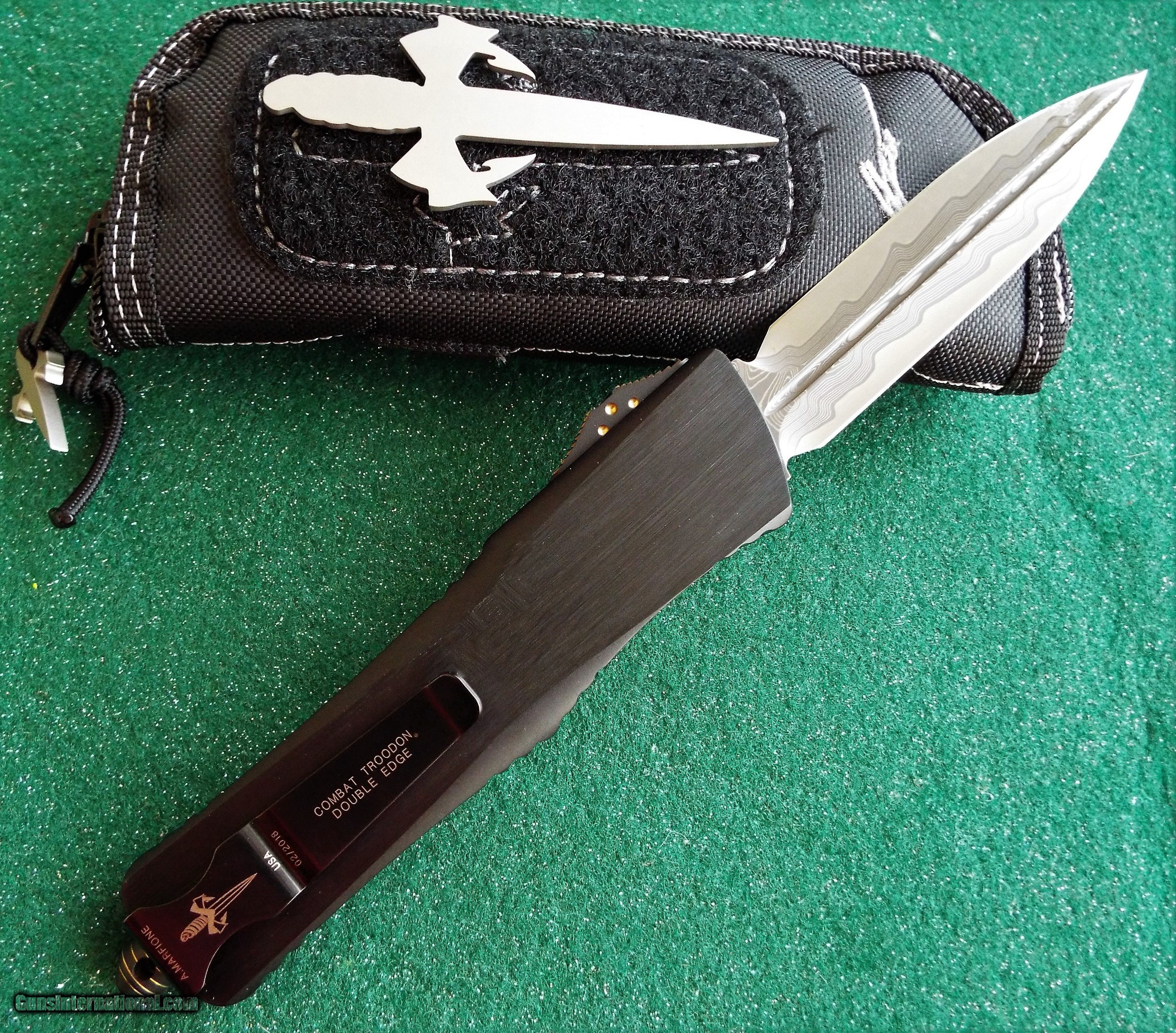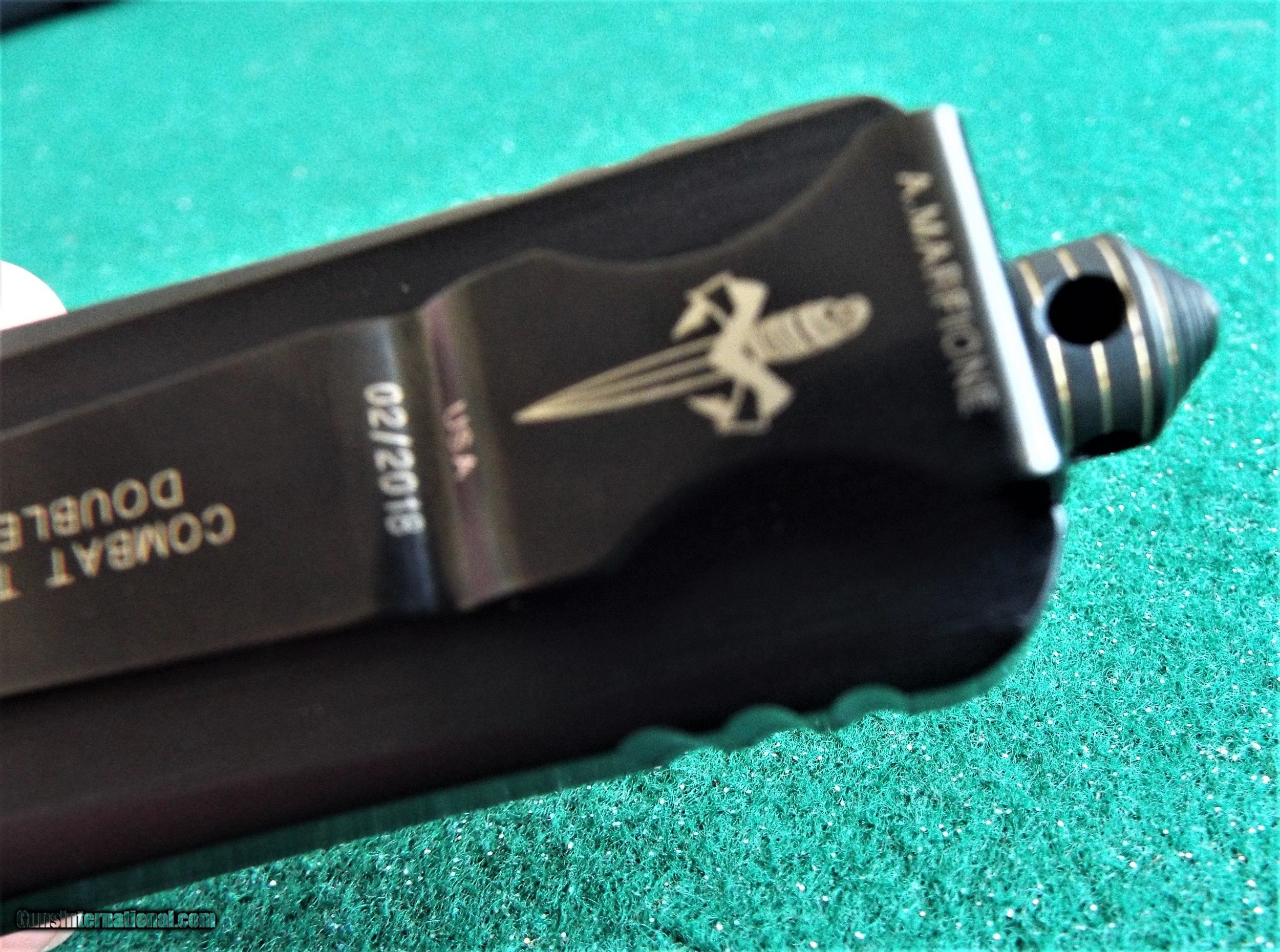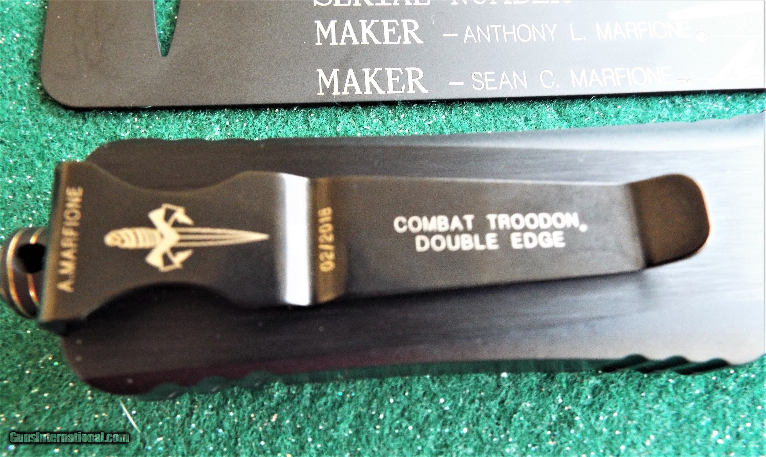 Description: MARFIONE CUSTOM (Microtech) COMBAT TROODON DOUBLE EDGE NICHOLS DAMASCUS ANODIZED HEFTED ALLOY WITH BRASS RINGED HARDWARE 02/2018 STUNNING! ~THIS KNIFE IS A ANTHONY & SEAN MARFIONE...(Father & Son colaboration) CUSTOM COMBAT TROODON. Owner of Microtech Knives Anthony Marfione's custom dagger logo is on Front and belt clip. IT FEATURES A 4″ CHAD NICHOLS CTS-XHP CORE DAMASCUS DOUBLE EDGE DAGGER BLADE. A VISUALLY STUNNING OTF WITH HEFTED ANODIZED AIRCRAFT ALLOY HANDLE WITH BRASS RINGED HARDWARE AND CUSTOM MARFIONE PACKAGING INCLUDED. OVERALL LENGTH: 9.25″ BLADE LENGTH: 4″ CLOSED LENGTH: 5.75″ BLADE STEEL: DAMASCUS HANDLE: BLACK HEFTED AIRCRAFT ALLOY BRASS RINGED HARDWARE MARFIONE PACKAGING INCLUDED "DECLARATION of AUTHENTICITY" DOB: 02/2018 CONDITION IS NEW ~ DEALER OWNED Shipping is $14 Priority mail (extra if Insurance is required) FOR IMFORMATION OR ORDERING PLEASE CALL: ERICA / SELF DEFENSE INC 772-349-0334 EST SOLD |