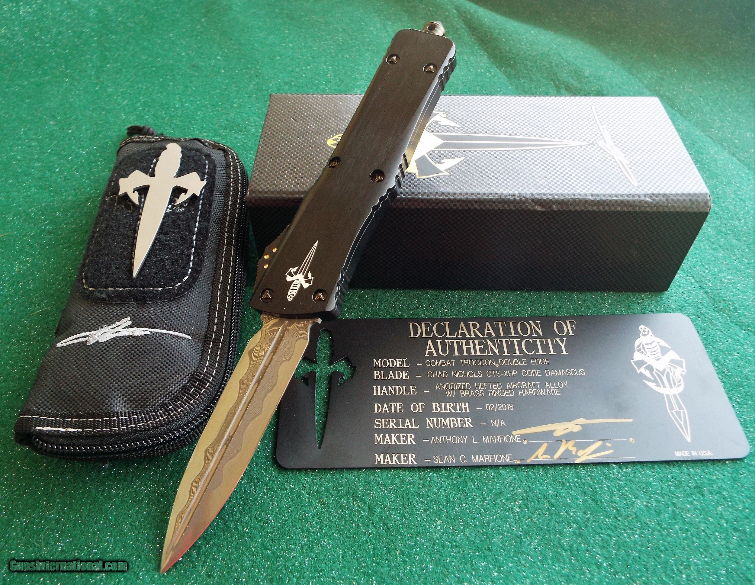 MARFIONE CUSTOM (Microtech) COMBAT TROODON DOUBLE EDGE NICHOLS DAMASCUS ANODIZED HEFTED ALLOY WITH BRASS RINGED HARDWARE 02/2018