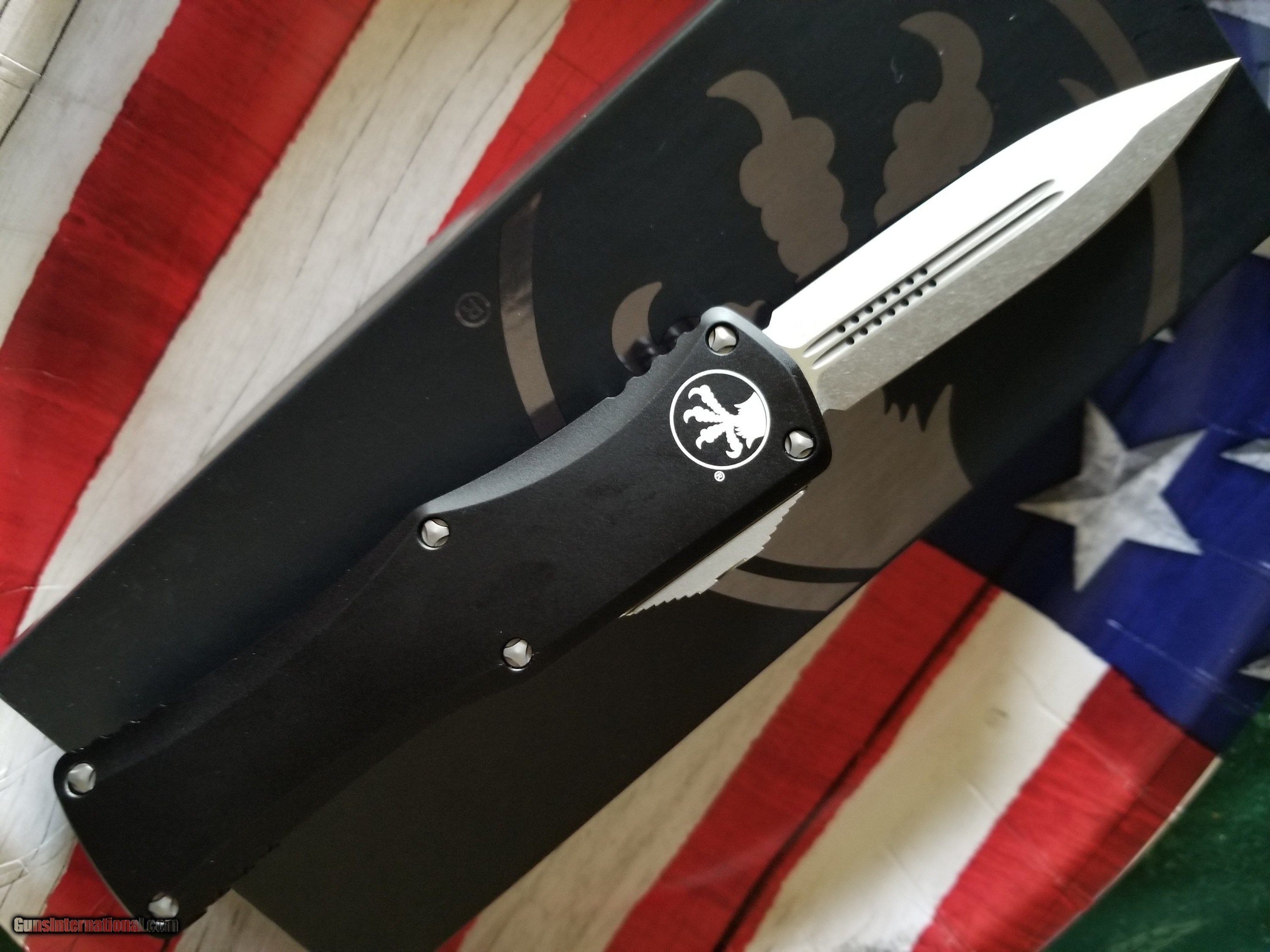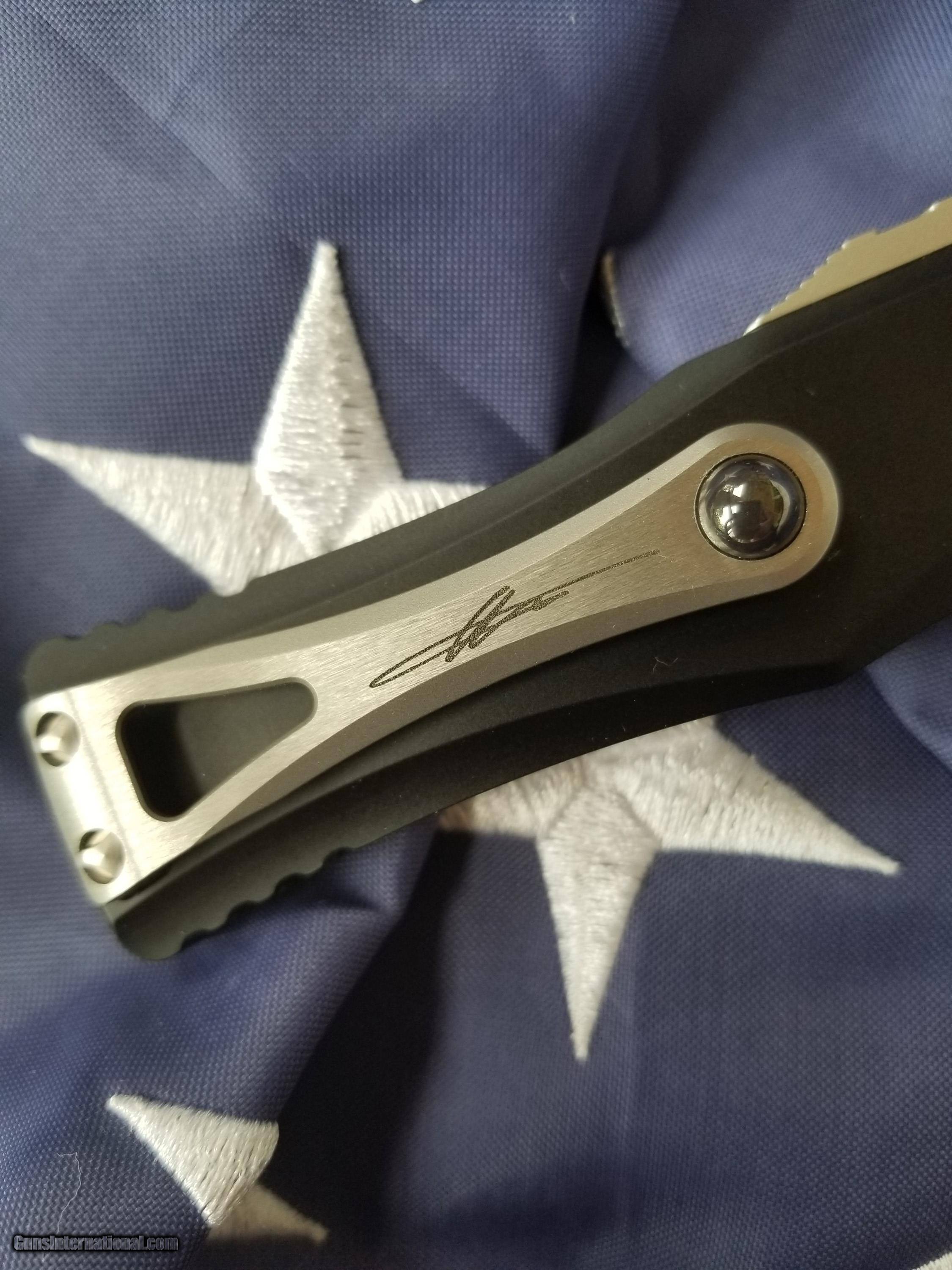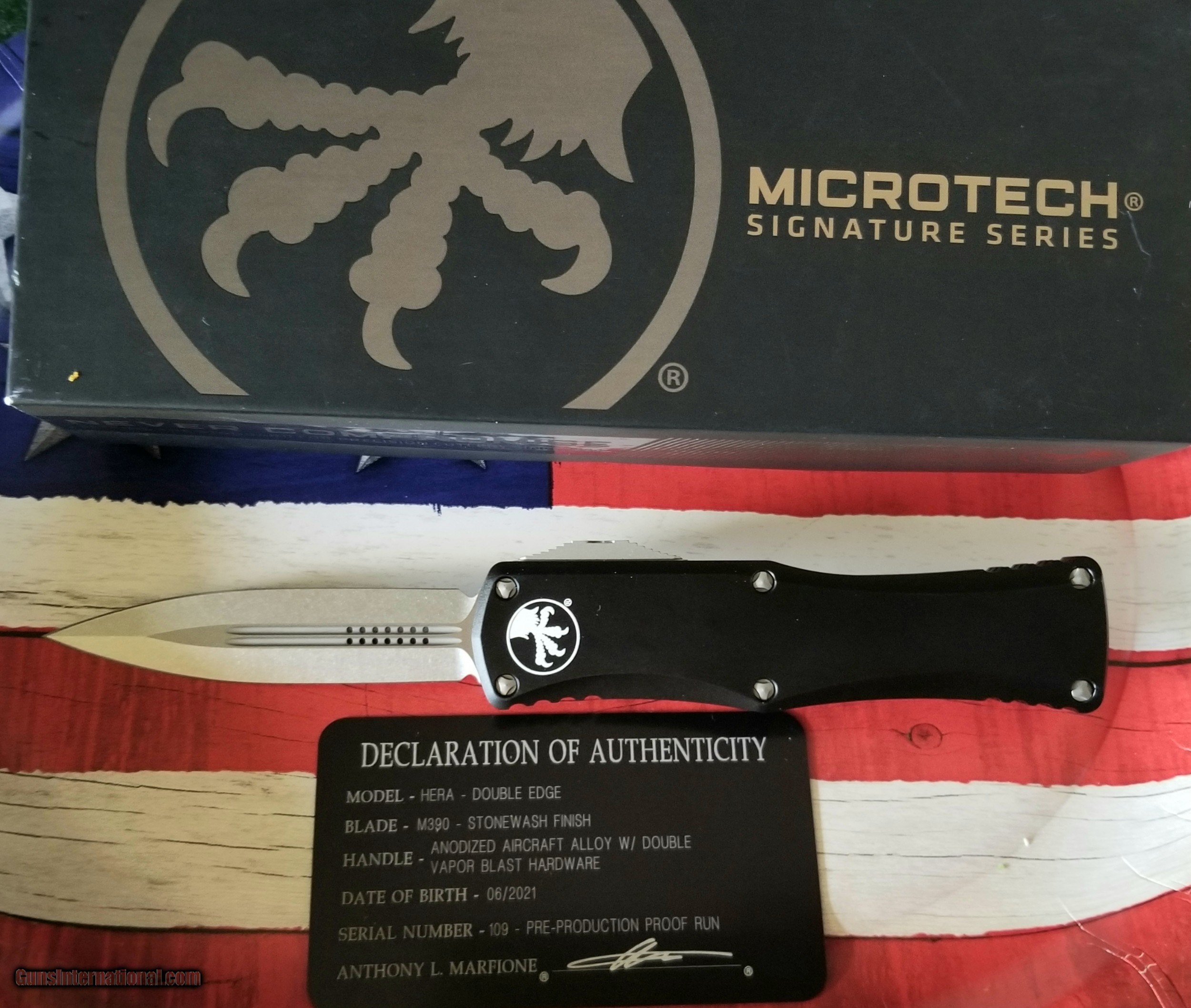 Description: MICROTECH PRE-PRODUCTION PROOF RUN HERA , SIGNATURE SERIES, OTF KNIFE, STONEWASH BLADE This Microtech Knives Pre-Production Proof Run Hera OTF automatic knife features an M390 dagger blade with a Stonewash finish. The blade is paired up with a black anodized aircraft aluminum handle It boasts bead blasted hardware. The Marfione Talon logo is engraved on the front of the handle. The spine is engraved with Hera 06/2021 and S/N 109 , The awesome machined pocket clIp with large ball at end is engraved with Anthony Marfione's signature, as are all Signature Series Microtechs! It comes with a metal Declaration of Authenticity with model birth date & Serial #. The Hera is a beautiful dual-action out-the-front automatic with a frame shape loosely based on the Troodon design. It's more ergonomic, however, with machined patches nears the ends for better purchase and an improved look in our opinions. Everything about this design screams both sophistication and functionality. It's one of the best all-around OTF automatic designs in an exceedingly crowded field and sized just right for daily carry. Made in the USA. SPECIFCATIONS: Microtech KNives Blade Length: 3.125" Overall Length: 7.50" Handle Length: 4.375" Blade Material: Bohler M390 Blade Style: Dagger Blade Finish: Stonewash Finish Blade Grind: Flat Handle Material: Black Anodized Aircraft Aluminum Accents: Blast Weight: 3.03 oz. Anthony Marfione Signature on Clip Birth Date: 06/2021 Serial Number 109: NIB Dealer owned. Call to Inquire Erica / Self Defense Inc. 772-349-0334 (FL) Made in the USA Shipping $8 USPS Conus SOLD |