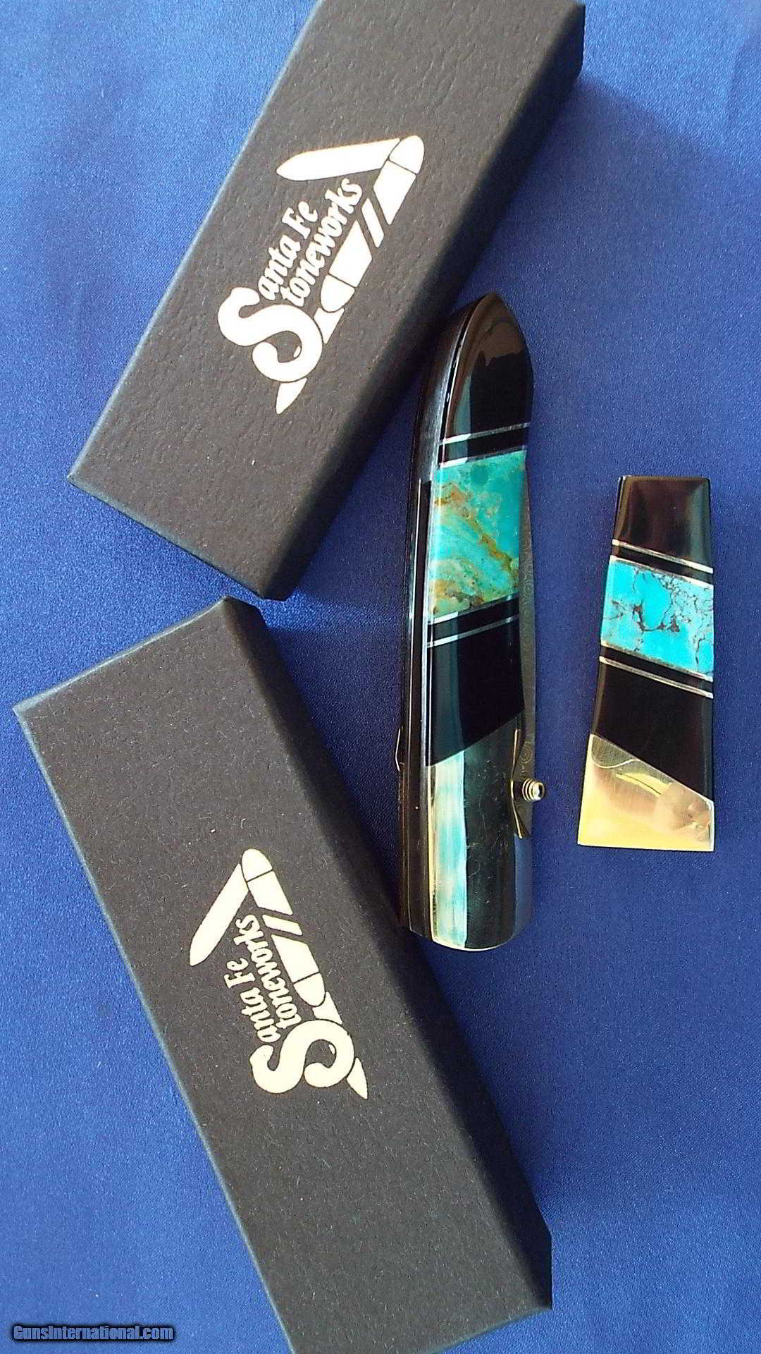 Description: ************NIB ~ SANTA FE STONEWORKS ** DAMASCUS KNIFE & MONEY CLIP SET ** TURQUOISE / BLACK JET LINER LOCK KNIFE*********** MADE IN USA!! : FOR SALE: NEW IN BOX! ~ SANTA FE STONEWORKS SET ~ 4" LINER LOCK KNIFE,"SANMAI DAMASCUS" STEEL (with 3" blade) & MATCHING MONEY CLIP, BOTH ADORNED WITH BEAUTIFULLY FIGURED, JEWELRY QUALITY TURQUOISE INSET WITH NICKEL SILVER INTO BLACK JET ON TOP SIDE OF BOTH THE MONEY CLIP & KNIFE.. BRASS BOLSTERS, BELT CLIP, & THUMB STUD FOR EASY OPENING.( BELT CLIP SIDE OF KNIFE IS DARK WOOD) THEY COME WITH SANTA FE STONEWORKS 100% UNCONDITIONAL GUARANTEE FOR WORKMANSHIP & QUALITY, AND ARE IN SANTA FE STONEWORKS BLACK JEWELRY BOXES. PLEASE VIEW ALL PICTURES, AS THEY ARE OF THE ACTUAL ITEMS, AND PART OF THE DESCRIPTION. ($100 bill for pictures only...not included) THIS SET IS NEW IN THE BOX, NEVER SOLD CARRIED OR SHARPENED. SHIPPING IS $7 FLAT FEE LOWER 48 ONLY! WE ACCEPT CERTIFIED CHECK OR MONEY ORDER, OR CREDIT CARD OR PAYPAL (for an additional 3%) ~~THIS WOULD BE A GREAT GIFT SET , OR A PERFECT EVERY DAY CARRY!!~~ QUESTIONS CALL 772-349-0334 ~~THANKS FOR LOOKING!!~~ SOLD |