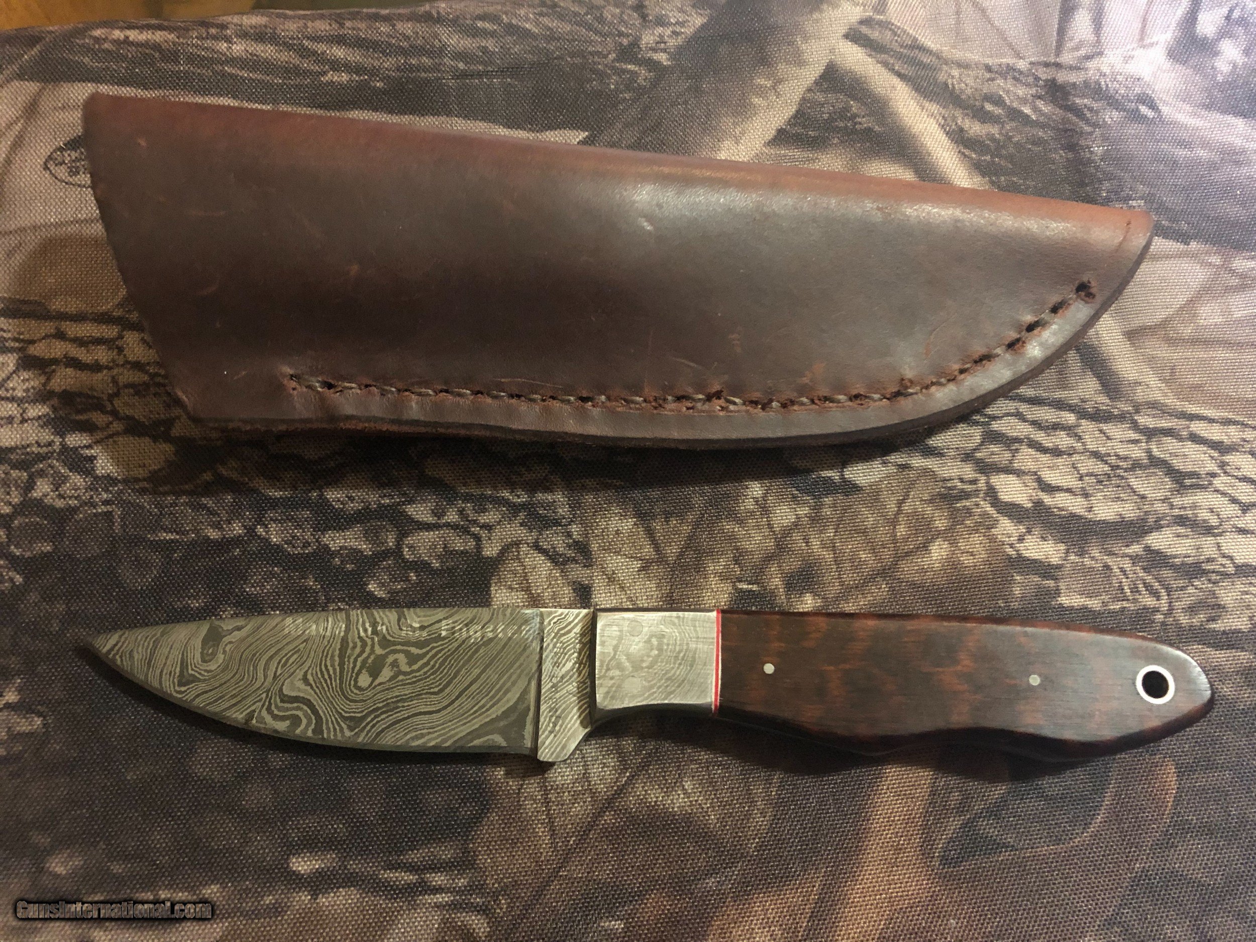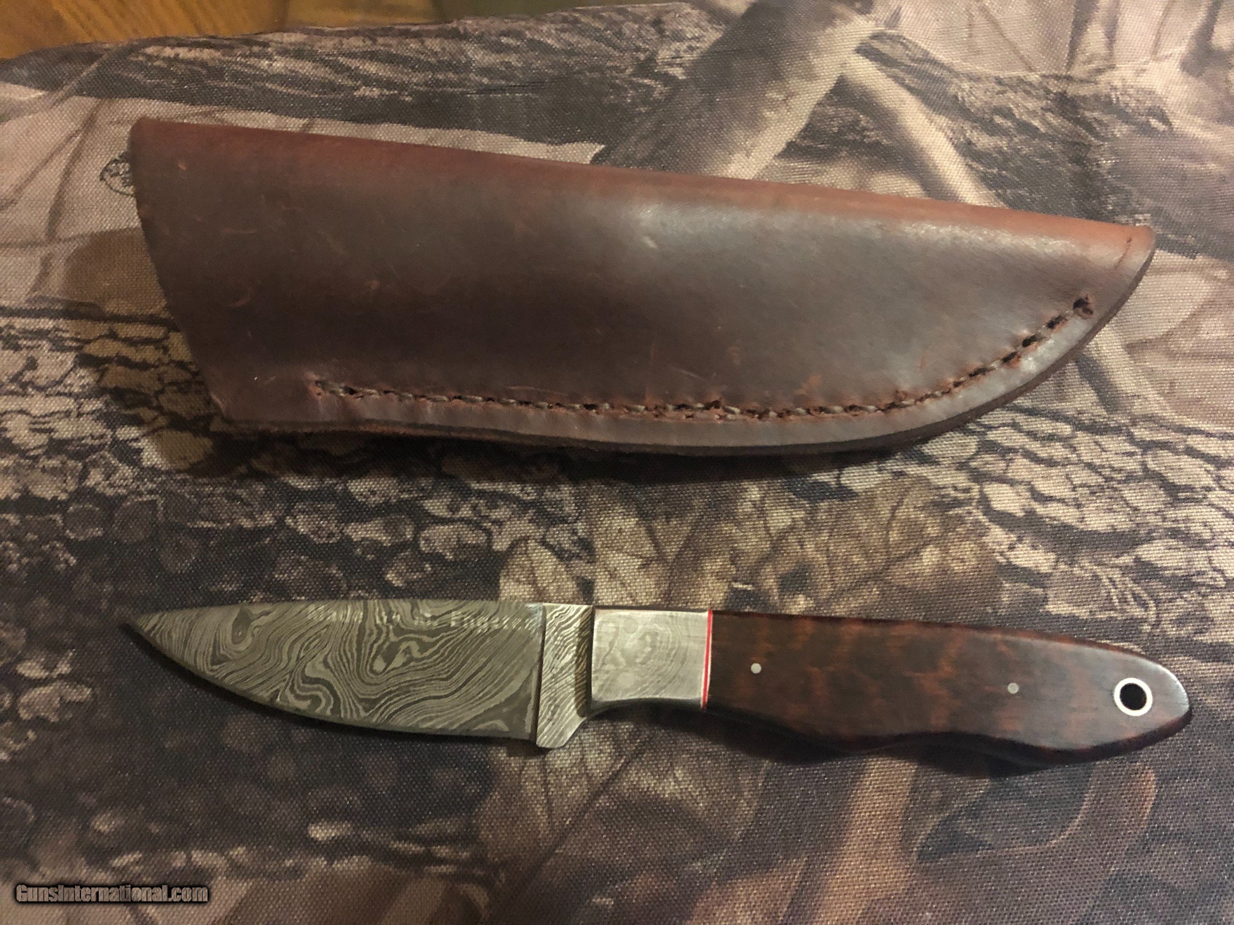 Description: damascus hunting knife made by M.Engster with leather sheath. and hardwood handle material Overall length:: 10.5 inches Blade length: 4.75 inches SOLD |