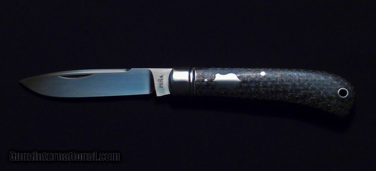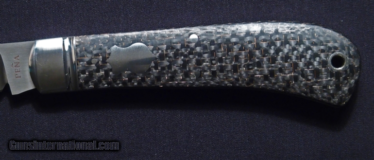 Description: PENA SLIPJOINT FOLDER - 3.75" BLADE - LIGHTNING STIKE CARBON SCALES - SINGLE BOLSTER W/SHEILD - HAD RUBBED FINISH W/FALSE TOP BLADE - OUTSTANDING FINISH = NEW SOLD |