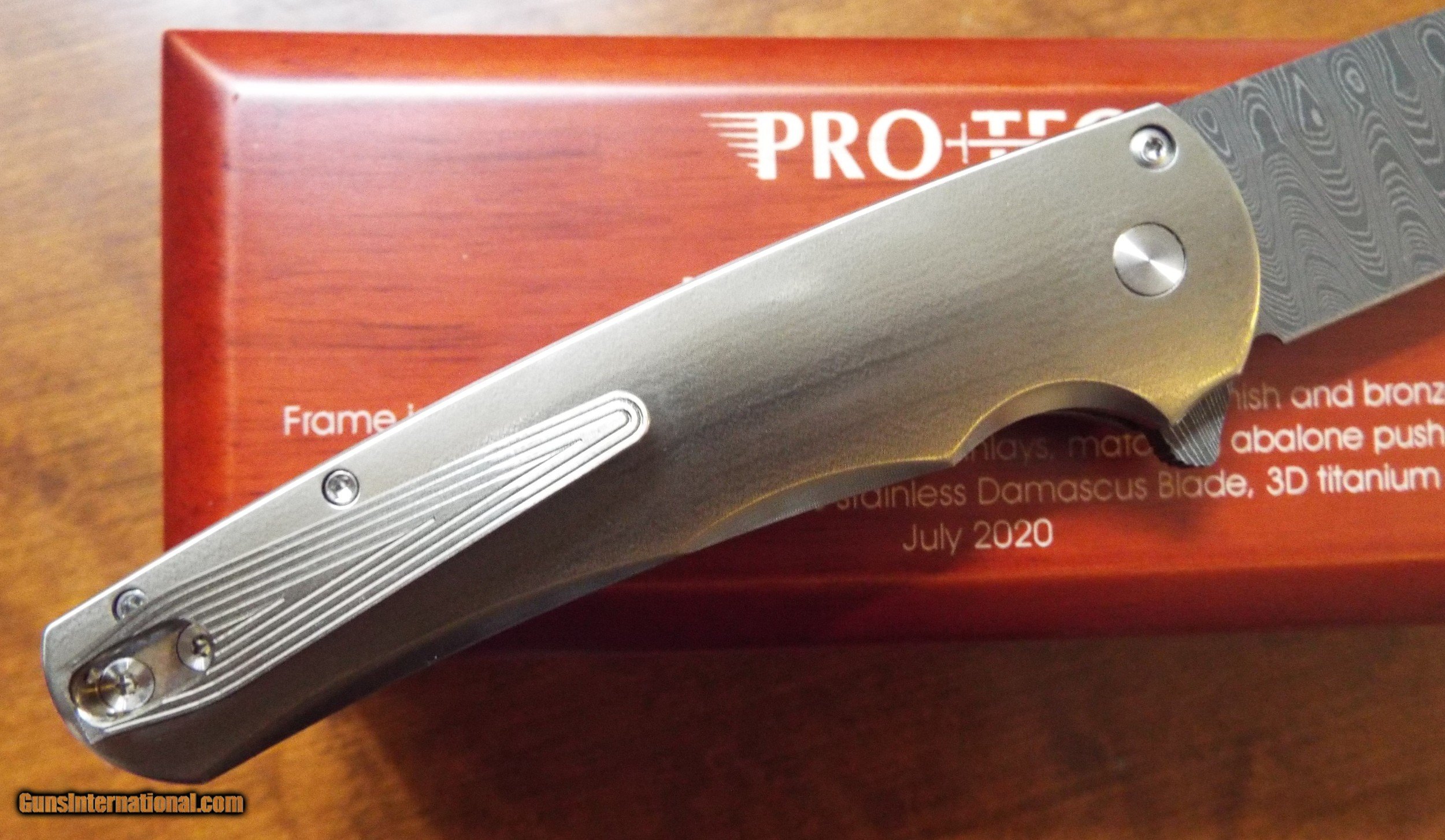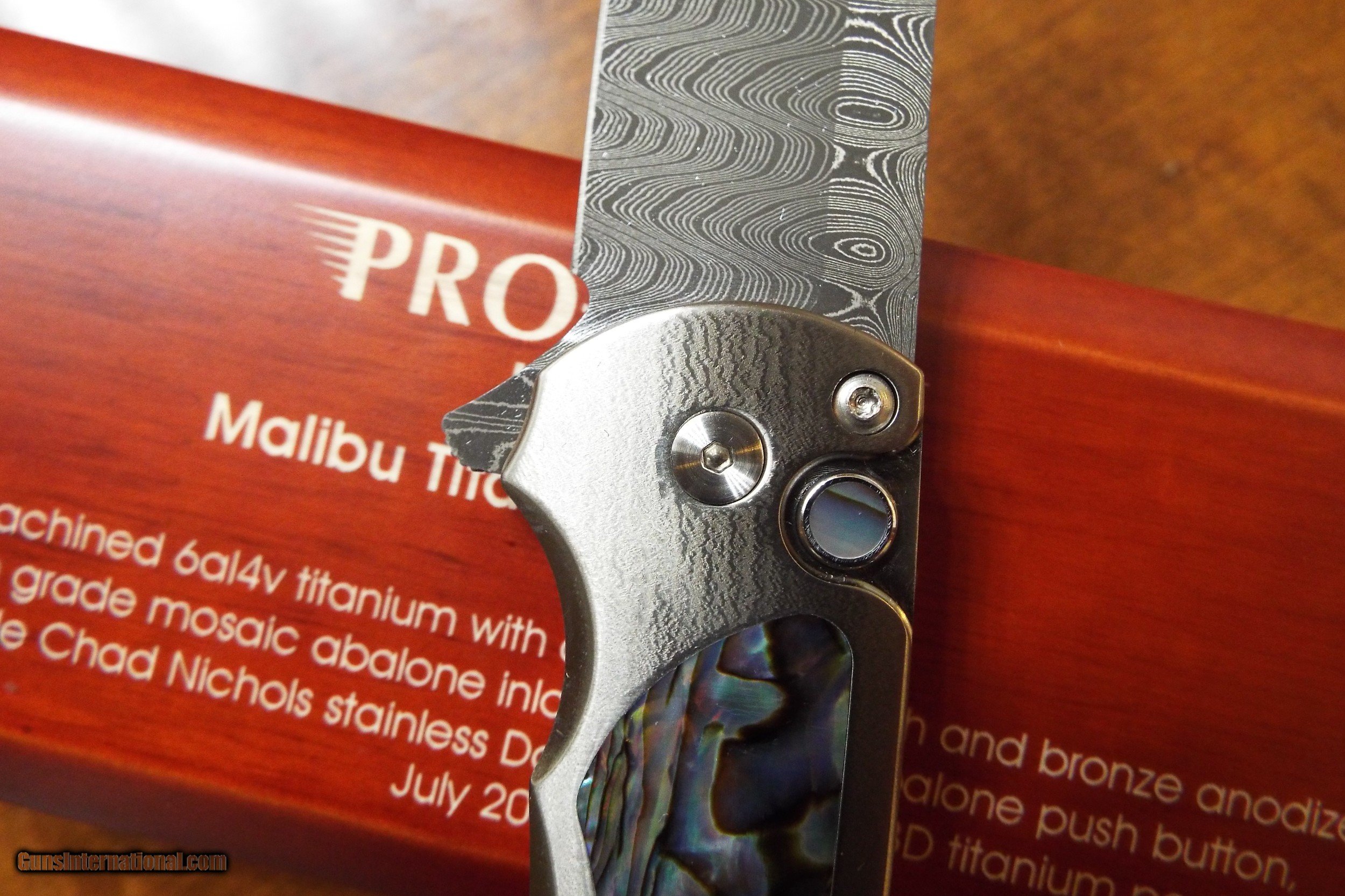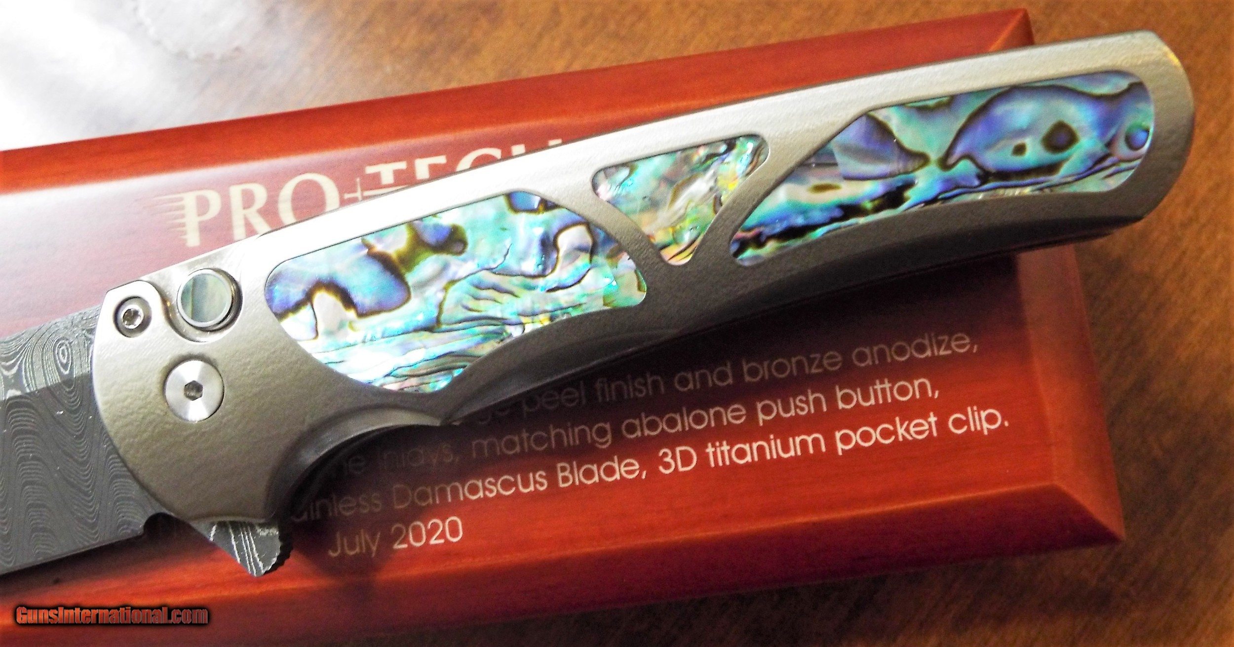 Description: Special Factory Protech Custom MALIBU FLIPPER! STUNNING ABALONE INLAYS!! Opens manually by flipping the assist located on the spine of the knife using your index finger. Unlocks by pressing on the Push Button. Ultra Smooth Operation. Opens effortlessly by pressing down, (or flipping down), on the assist located on the spine. Press the button to unlock the blade and it falls back into the handle like a gravity knife. (So you can open AND close this knife with just one hand). This FACTORY CUSTOM MALIBU features a 3D Machined Bronze Anodized 6al4v Titanium Frame with an "Orange Peel Finish" inlaid with Mosaic Abalone Shell. Matching 3D Machined Titanium Pocket Clip on the backside. Matching Abalone Release Button. 3 1/4" Reverse Tanto Styled Stainless Damascus Blade is Handforged by Chad Nichols. Measures 4 1/8" closed. Stunning Factory Custom includes a deluxe laser etched wooden display/storage box.. Weighs just 4.0 oz. Retail $1300 DEALER ITEM ~ NIB ~ NEVER SOLD, CARRIED OR SHARPENED! Shipping is $10 priority mail. No International shipping! SOLD |