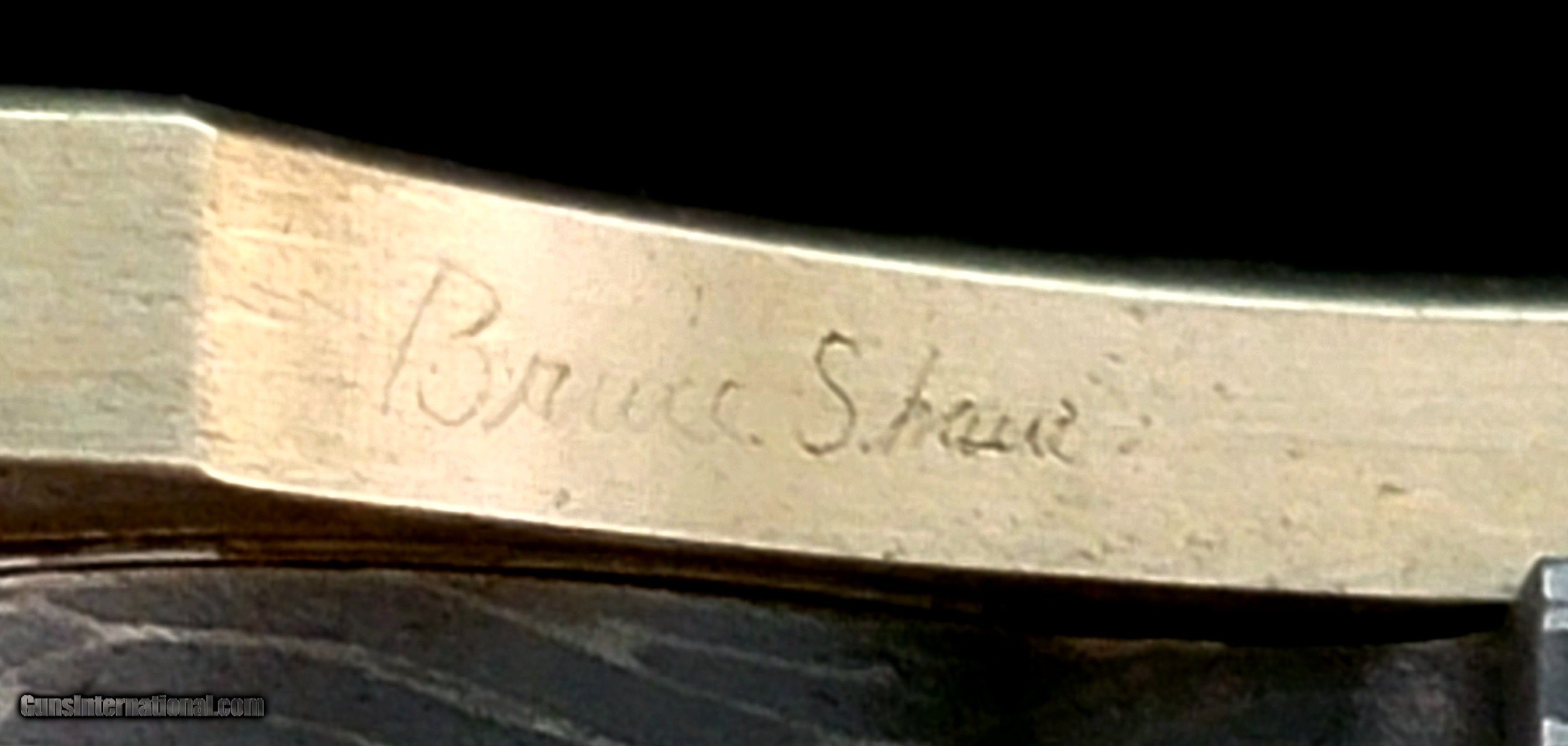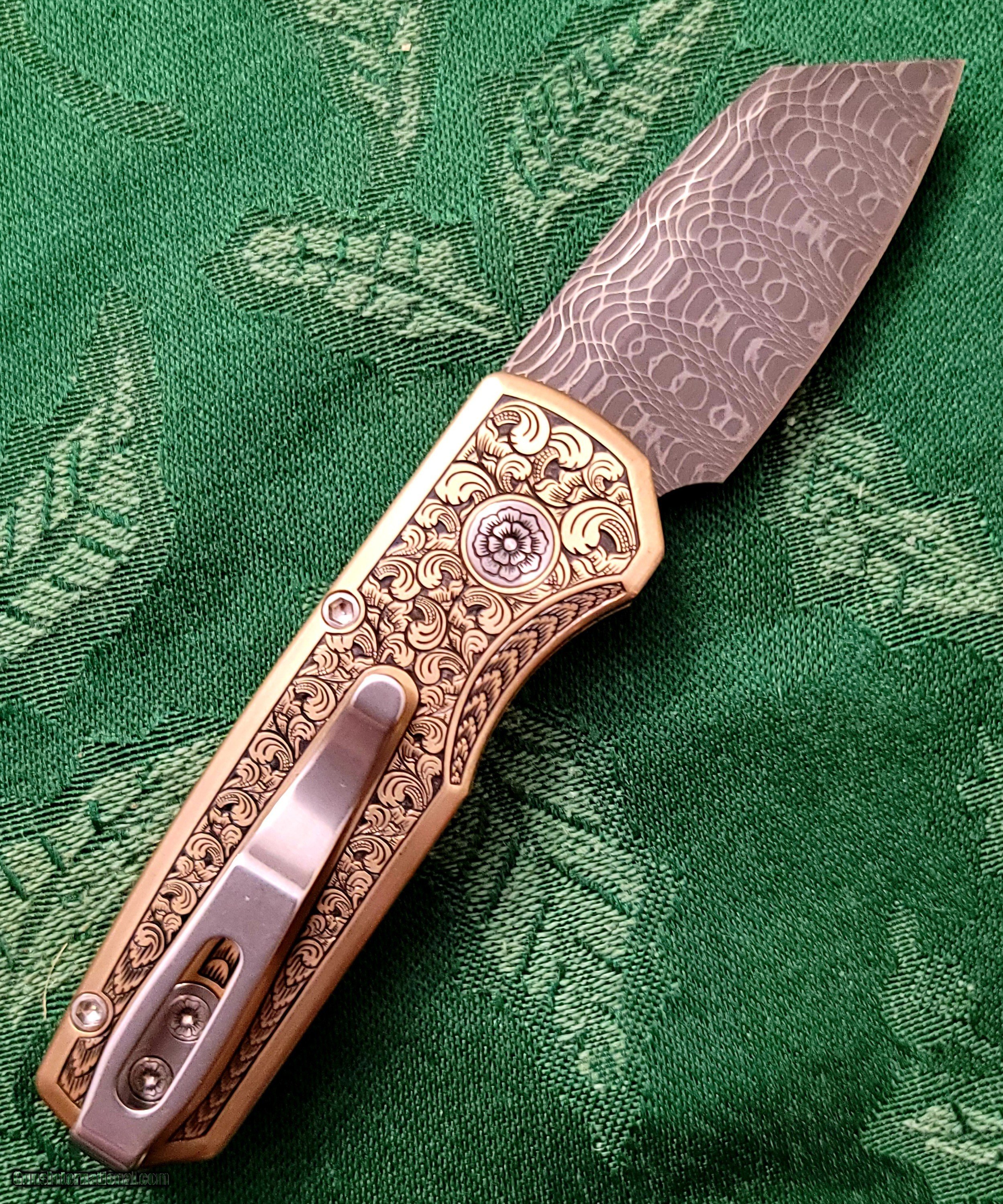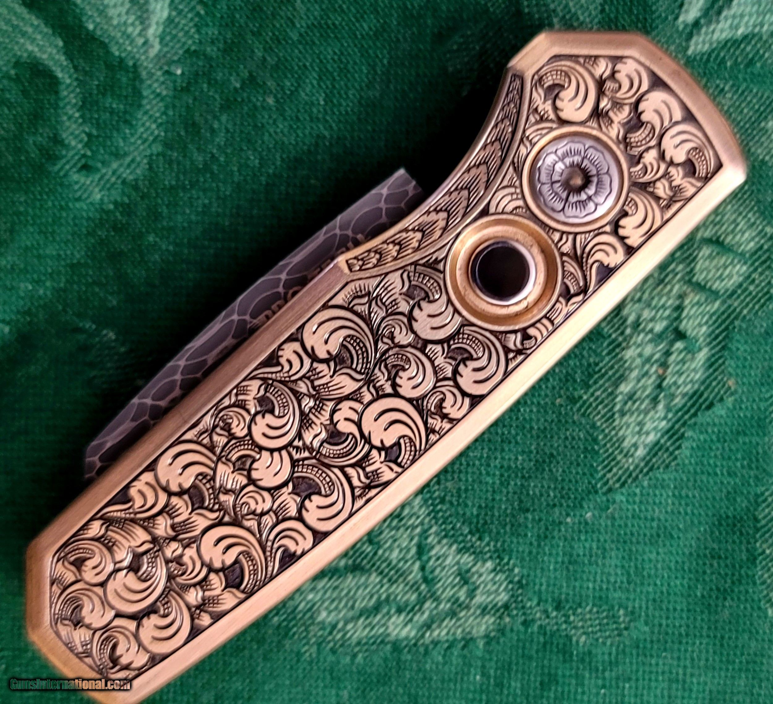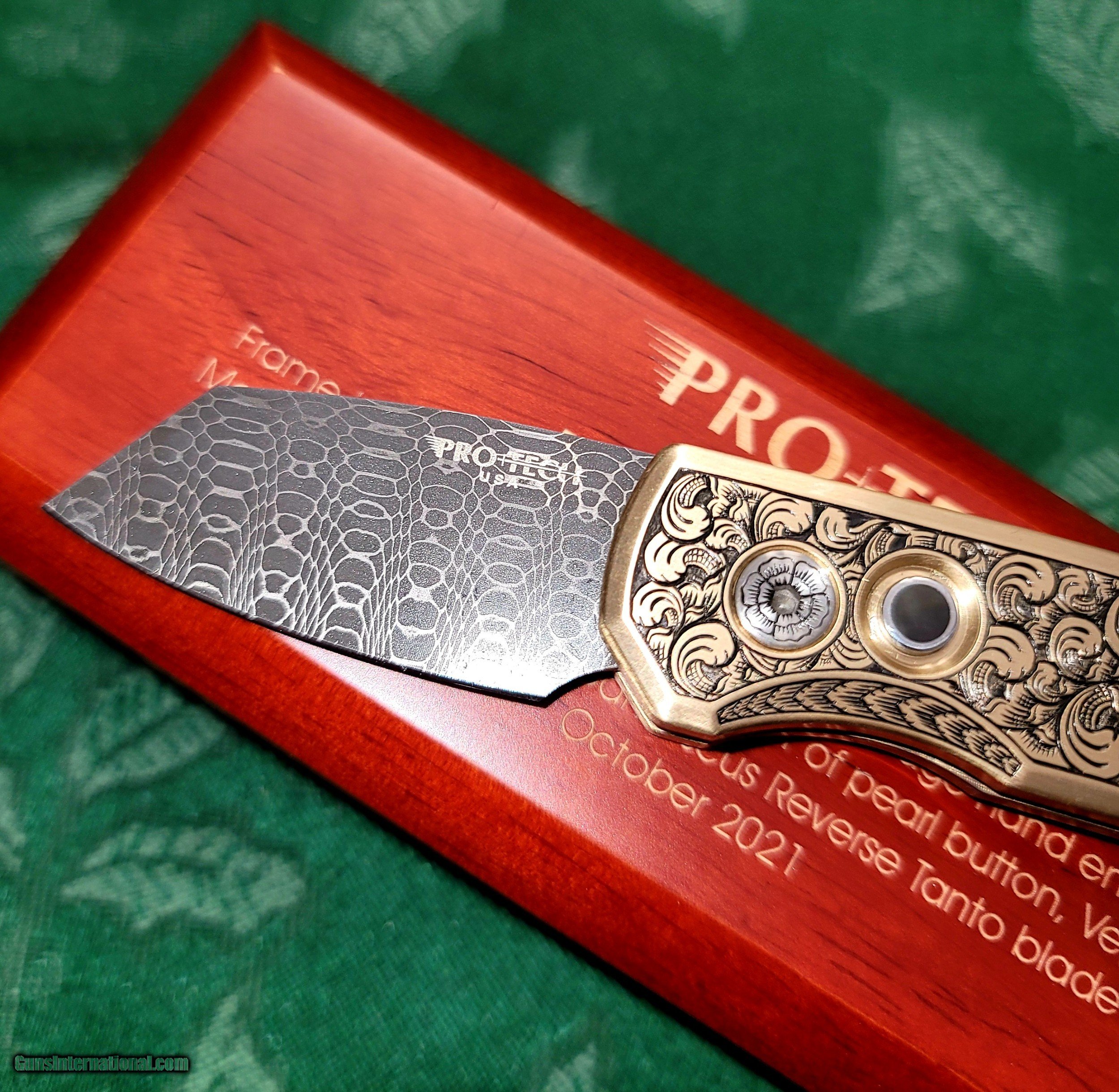 Description: PRO-TECH RUNT 5 Ultimate Custom ~ Fully SHAW ENGRAVED~VEGAS FORGE DAMASCUS ~ Bronze-Alum NIB Description: PRO-TECH ~ MALIBU ULTIMATE CUSTOM Frame is bronze aluminum with full coverage hand engraving by Master Engraver BRUCE SHAW, Black lip Mother of pearl button, VEGAS FORGE "SPIROGRAPH" pattern Stainless DAMASCUS Reverse Tanto blade style. Brand New in beautiful wooden display box embossed with description. Specifications: Blade Length: 1.94" ~ Cutting Edge: 1.94"~ Closed Length: 3.18" ~Overall Length: 5.12" ~Blade Material: Vegas Forge Stainless Spirograph Damascus Blade ~ Blade Style: Reverse Tanto Blade~ Grind: Flat ~ Blade Finish: Acid Etch ~Handle Material: Stonewashed Bronze T6-6061 Aluminum Engraved by Bruce Shaw ~ Handle Thickness: 0.47" ~Locking Mechanism: Mother of Pearl Button ~Pocket Clip: Stainless Steel (Tip-Down, Right Carry) Weight: 2.1 oz. Made in the USA Shipping $15 Priority USPS insured MSRP $2000 SOLD |