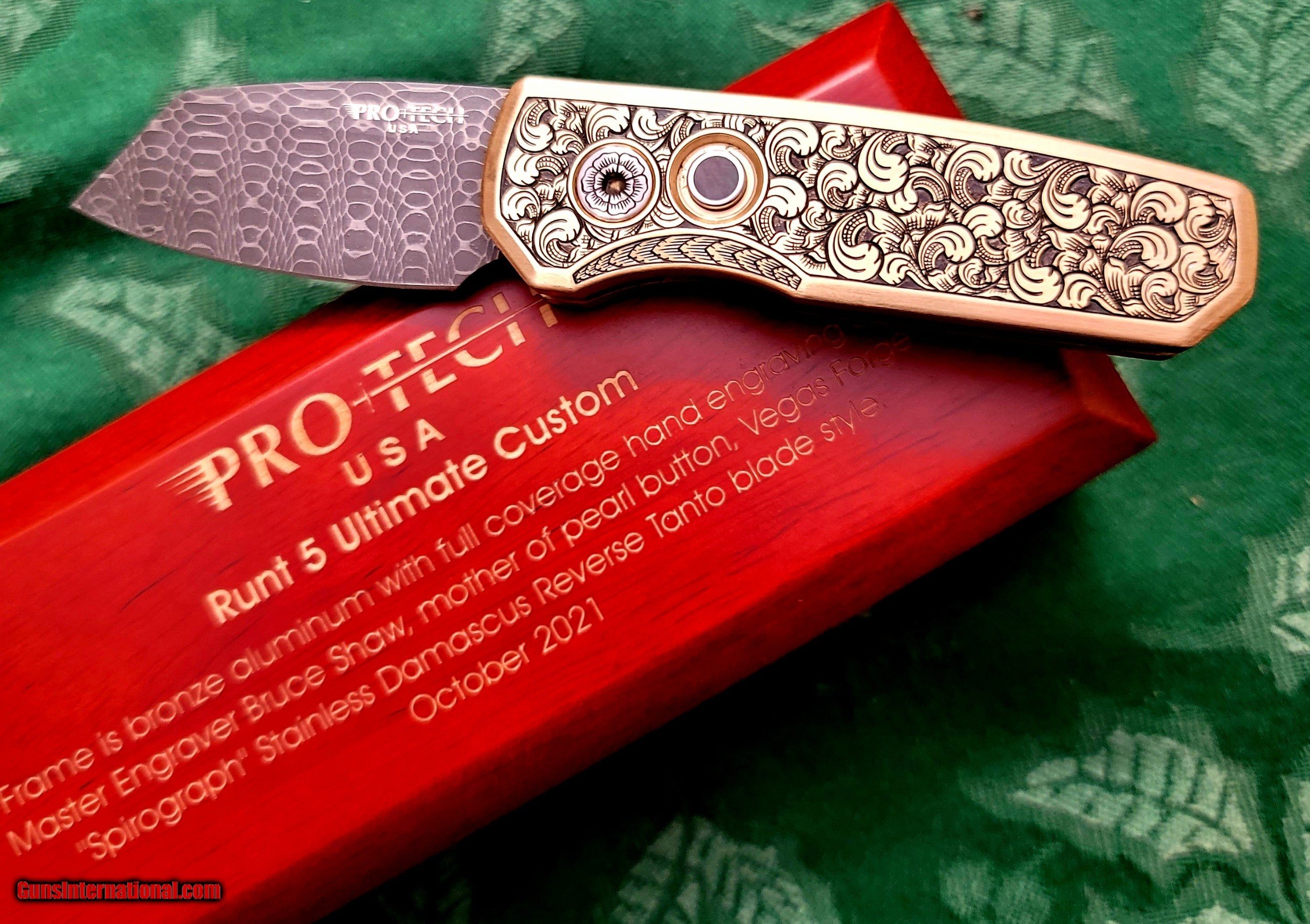 PRO-TECH RUNT 5 Ultimate Custom ~ Fully SHAW ENGRAVED~VEGAS FORGE DAMASCUS ~ BLACK MOP BUTTON NIB