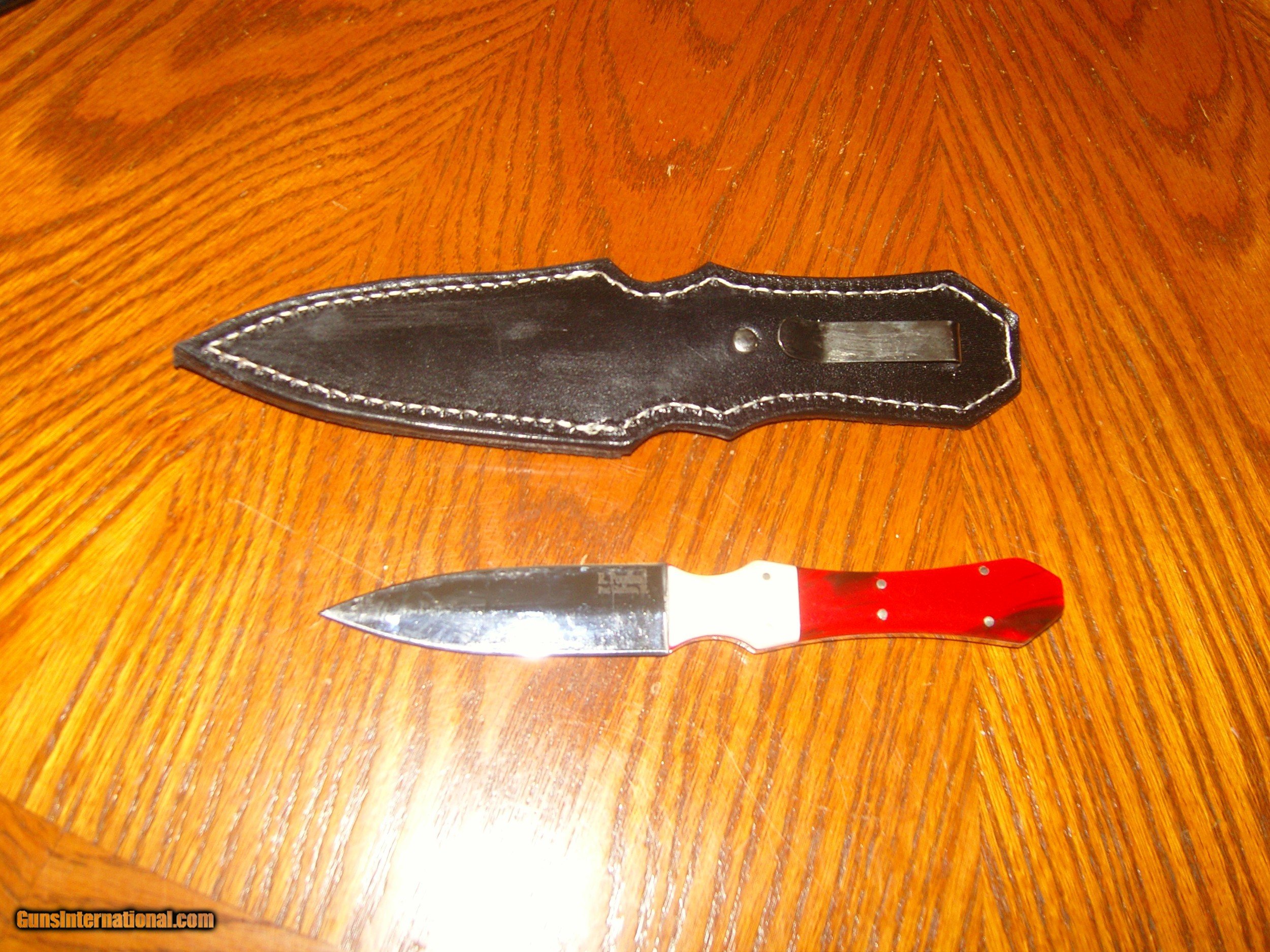 Description: R.Pousland FL,Brand new. Handmade One of One. Bakelite handle. 3 1/2 inch double edged blade, 7 3/4 inch overall, hand stitched leather sheth w/ rattlesnake skin insert, well known custom knife maker from Florida marked on blade. (google him), only $275 . click on pictures to enlarge check out my other listings. SOLD |